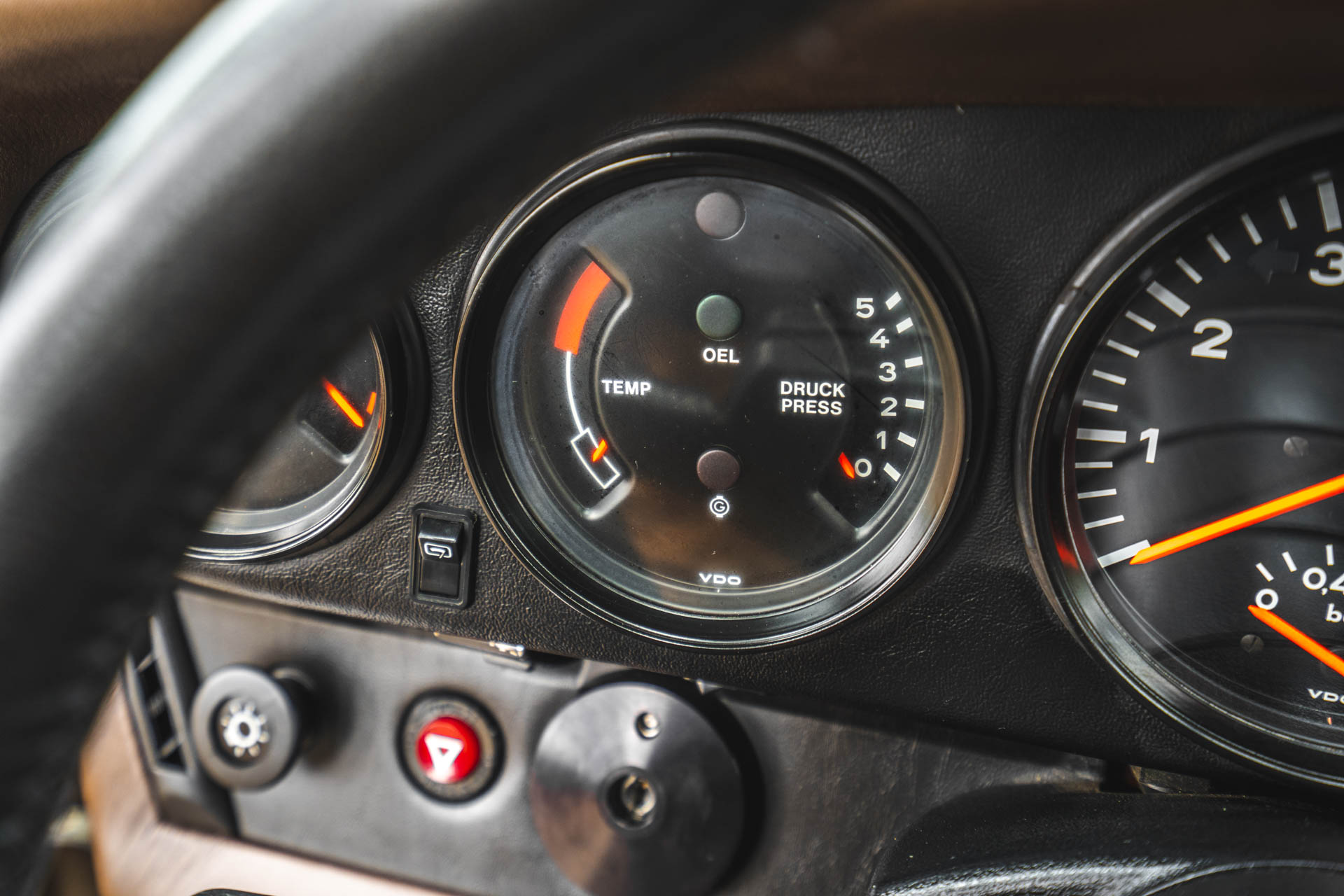The four-spoke leather-wrapped steering wheel frames VDO instrumentation including a central tachometer with a 6,700-rpm redline as well as gauges for oil level, oil temperature, oil pressure, boost pressure, and fuel level. The 180-mph speedometer is a replacement that was repaired in November 2022, and the odometer shows 33k miles, although total mileage is unknown. Approximately 7k miles were added under current ownership.