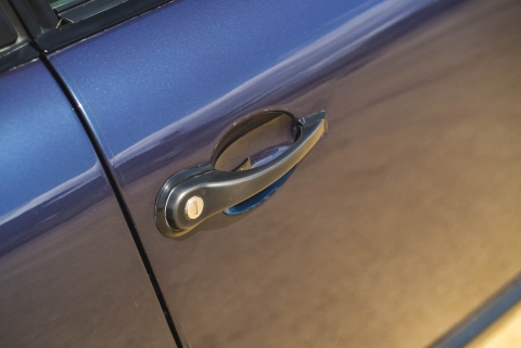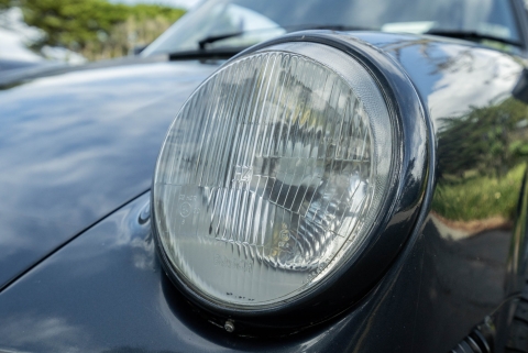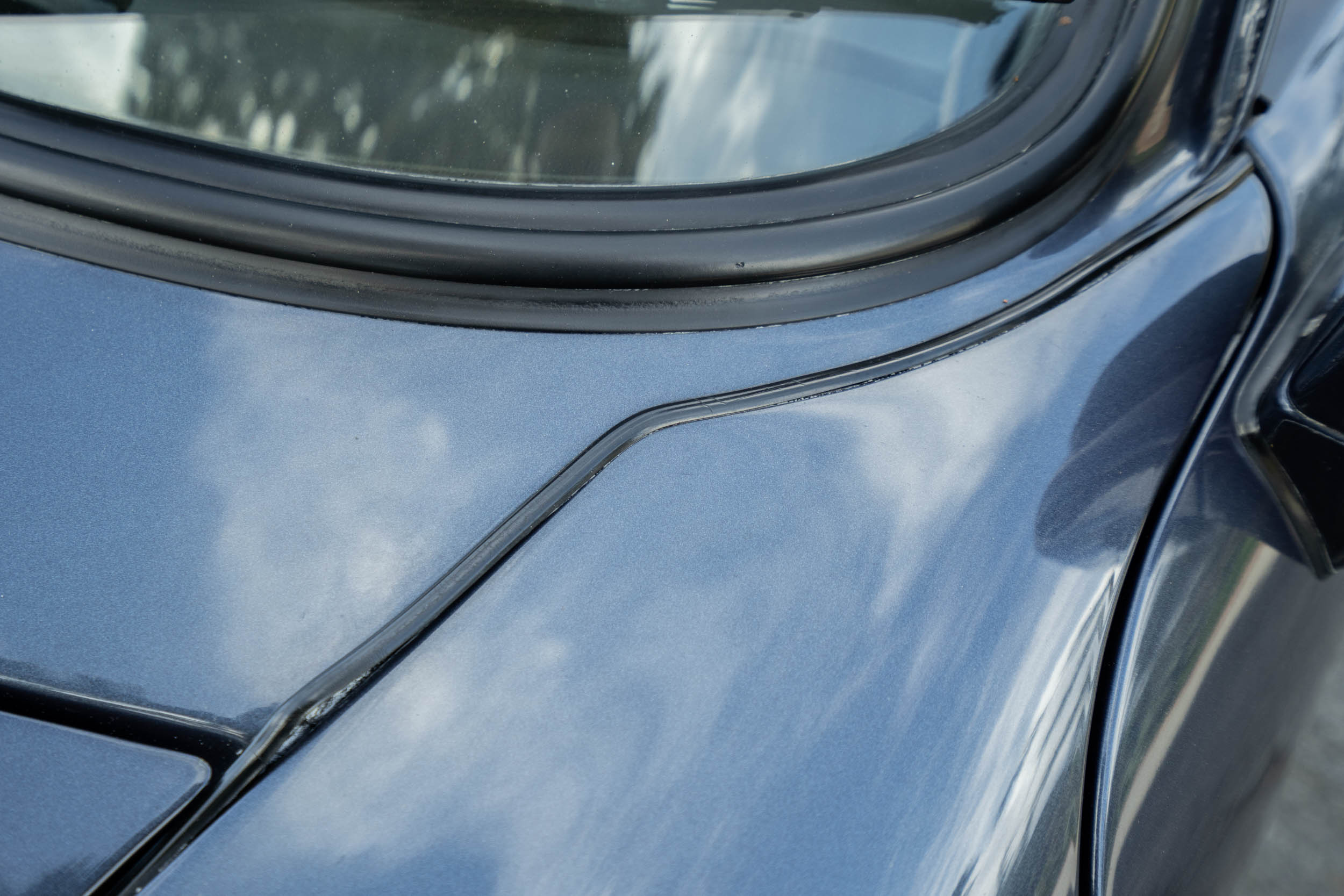 The car was finished from the factory in Prussian Blue Metallic and was repainted under previous ownership. Exterior features include a power-operated sunroof, integrated fog lights, and heated power-adjustable side mirrors. A JWest Engineering headlight relay kit has been installed along with H4 headlights. Paint imperfections around the body are displayed in the gallery.