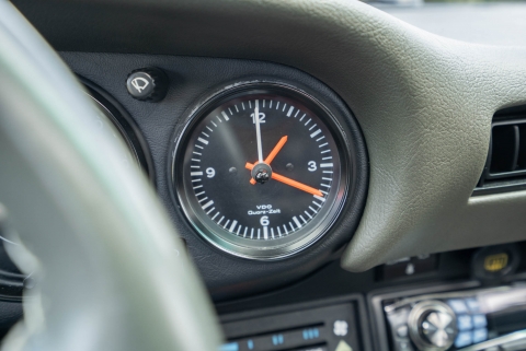 The leather-wrapped steering wheel frames VDO instrumentation including a central tachometer with a 6,300-rpm redline as well as a 170-mph speedometer, a Quartz clock, and gauges for oil level, oil pressure, oil temperature, and fuel level. The six-digit odometer shows 111k miles, approximately 2k of which were added under current ownership.