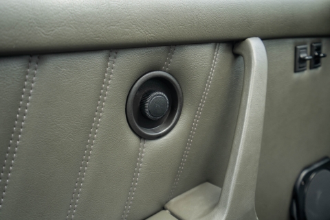 The cabin houses power-adjustable sport seats upholstered in grey-green leather along with color-coordinated door panels. Amenities include an Alpine head unit, a Polk Audio speaker system, a WEVO short-shift kit, and power windows. The air-conditioning system was modified with Griffiths components under previous ownership. The speaker grilles show cracks, and sagging is evident in the sunvisor upholstery.