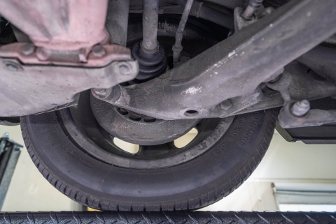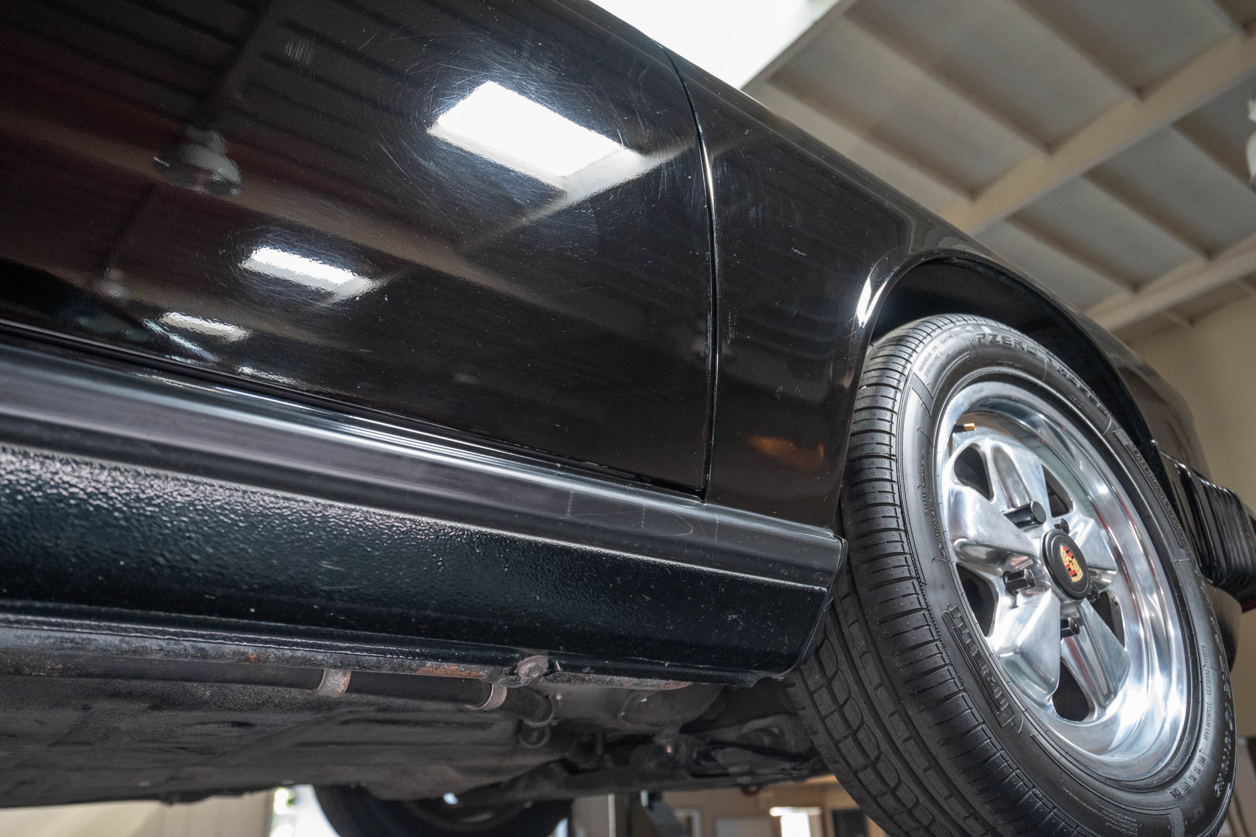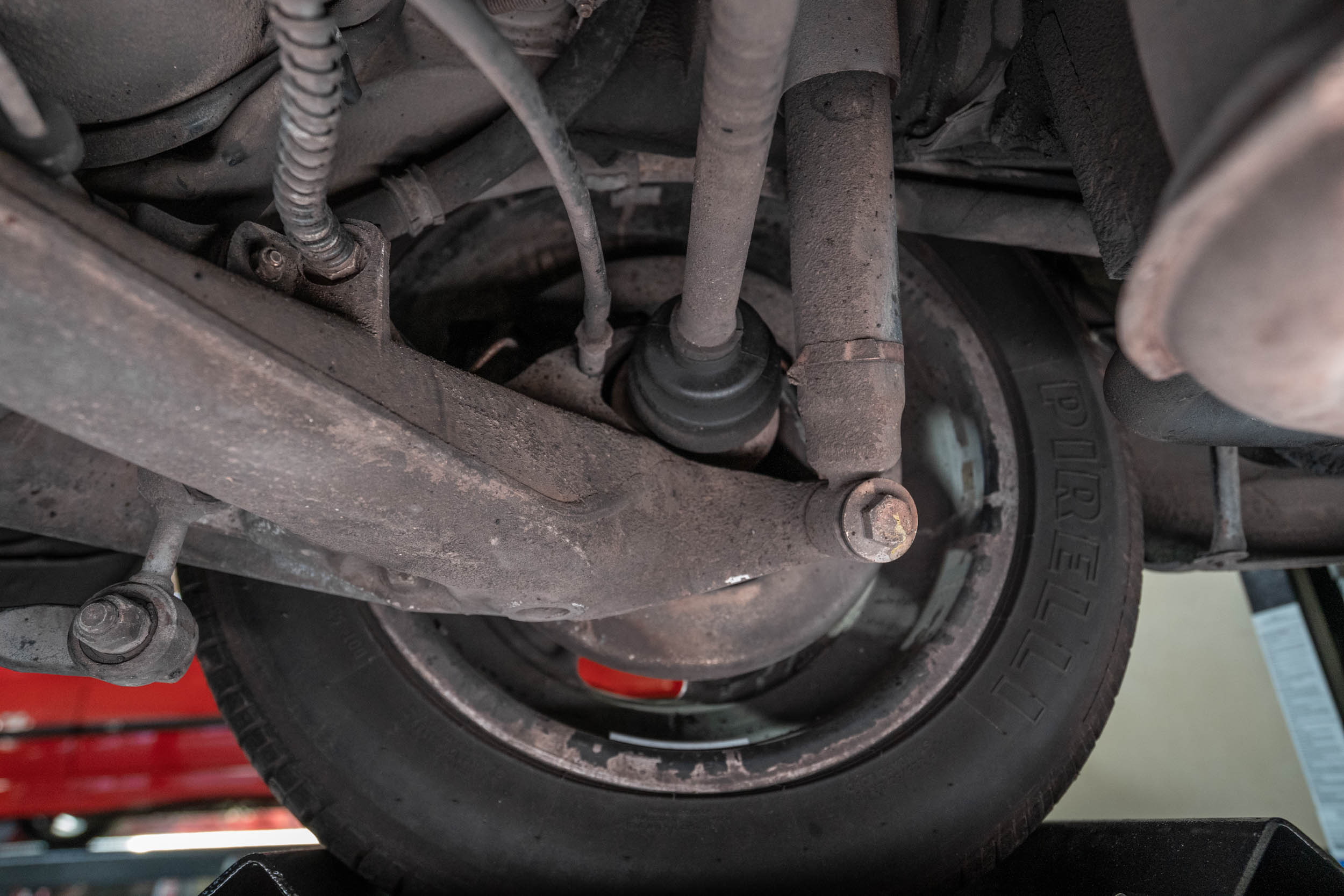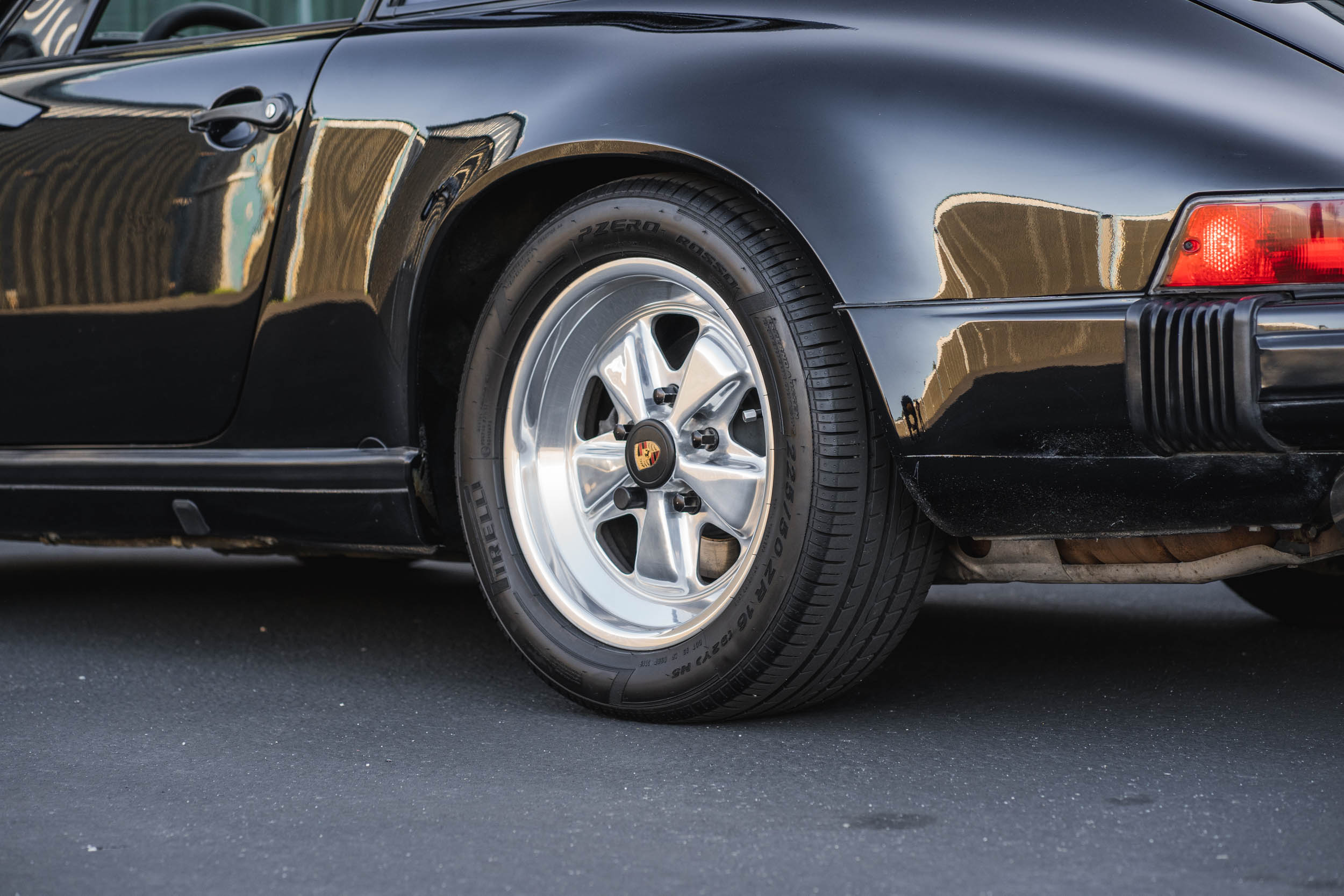 Polished 16? Fuchs alloy wheels are wrapped in 205/55 front and 225/50 rear Pirelli P Zero Rosso tires. Braking is handled by four-wheel discs, and the rear brake pads and rotors were replaced in February 2022.