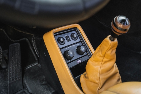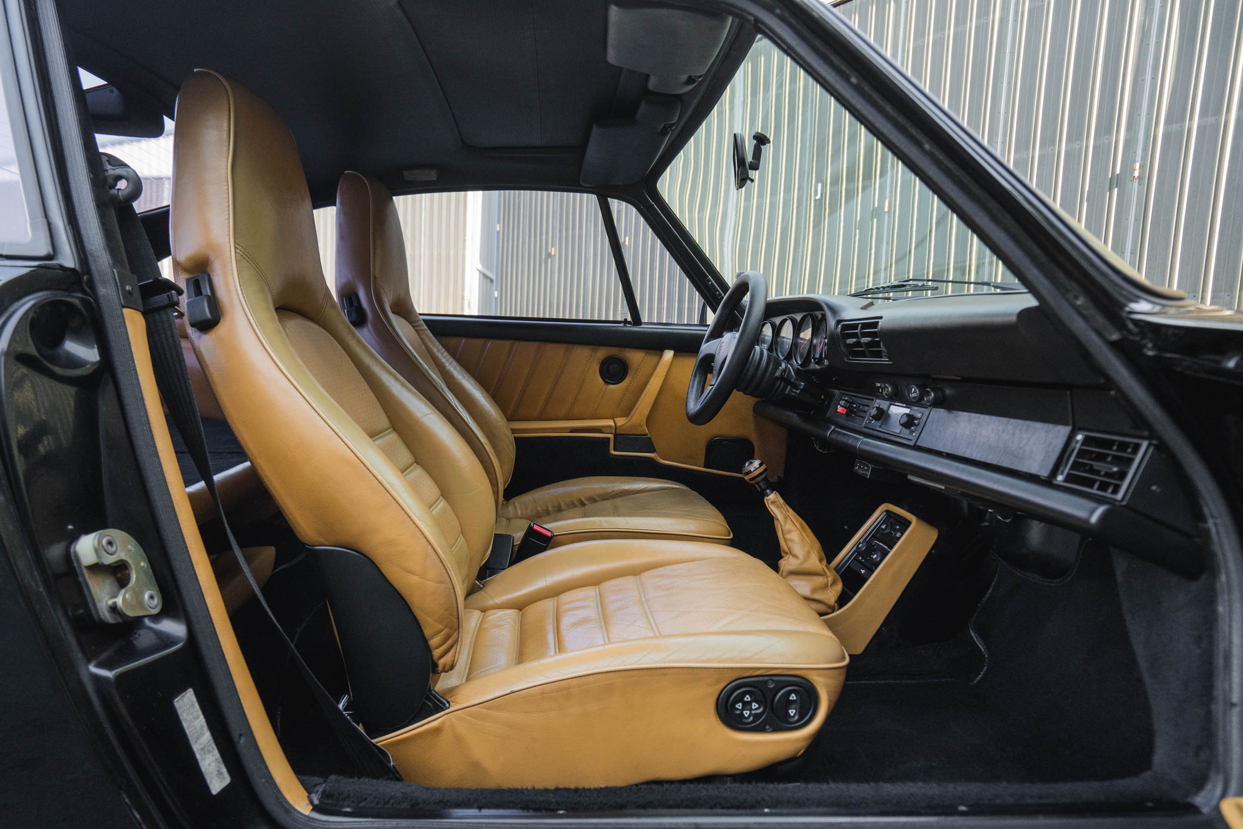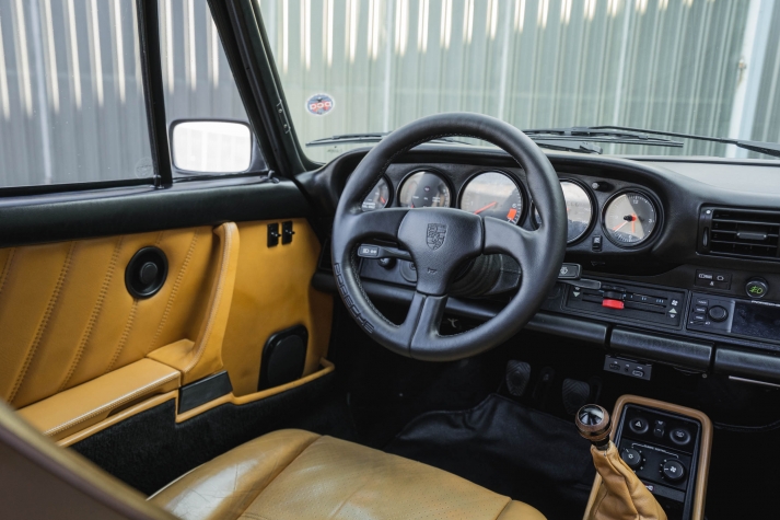 The cabin features power-adjustable front seats trimmed in tan upholstery along with matching rear seats and door panels. Amenities include a wood shift knob, air conditioning, a Clifford alarm system, and power windows and door locks. A Porsche Classic Communication Management infotainment system is installed in the factory location, and the removed Blaupunkt Monterey unit will accompany the car. The air conditioning system was converted to utilize R134a refrigerant in June 2020.