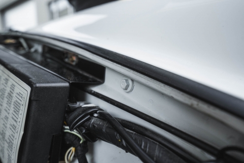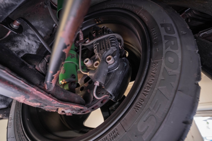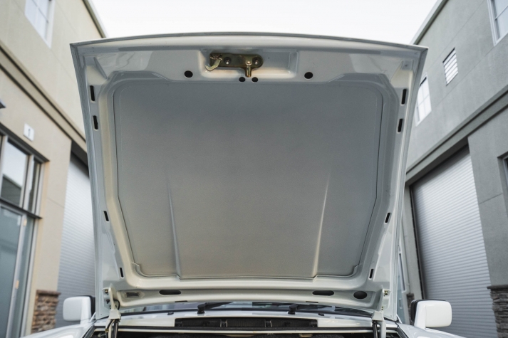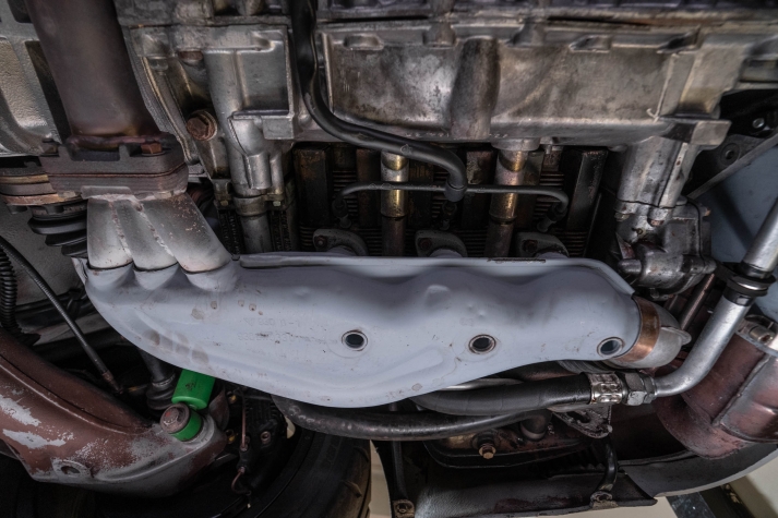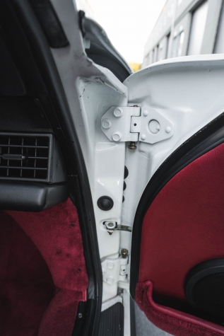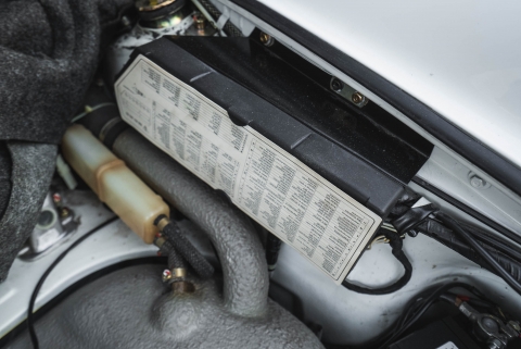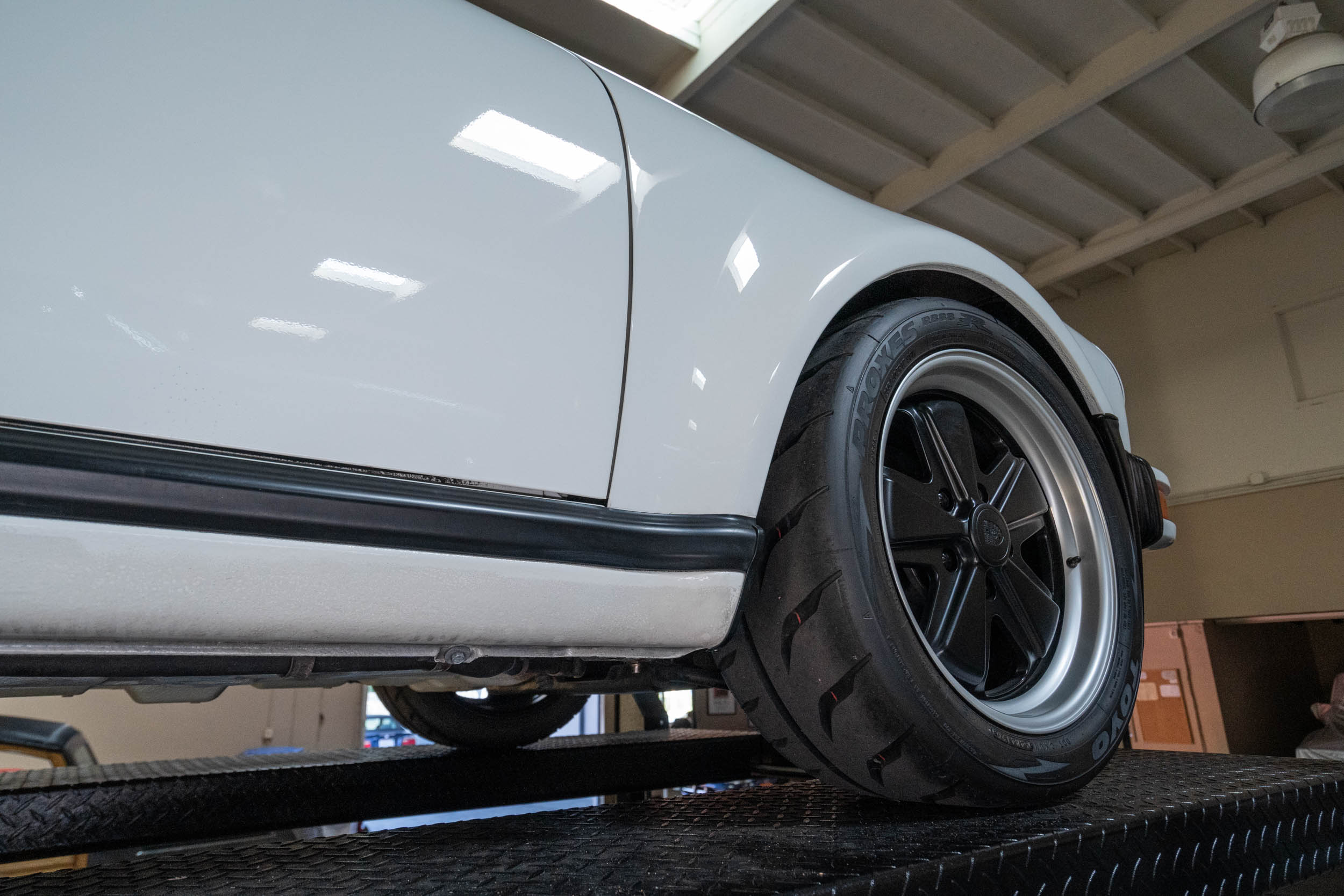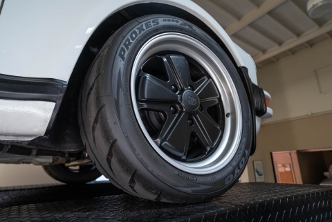 Body-matching 16? Fuchs wheels are said to have been refinished under current ownership and mounted with Pirelli Cinturato P7 tires that show 2020 date codes. However, the majority of the photos in the gallery below show the car with aftermarket 17? Fuchs-style black wheels that will accompany the car and are mounted with 255/40 front and 315/35 rear Toyo Proxes R888R tires. A strut brace has been added in the front trunk.
