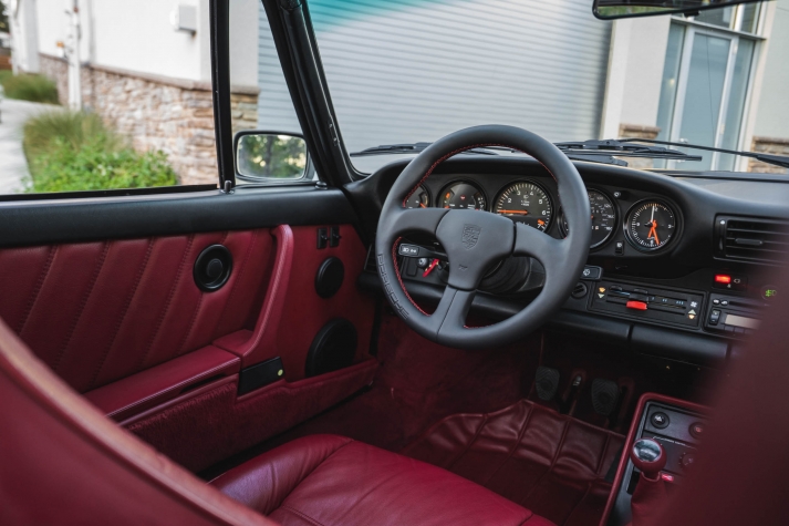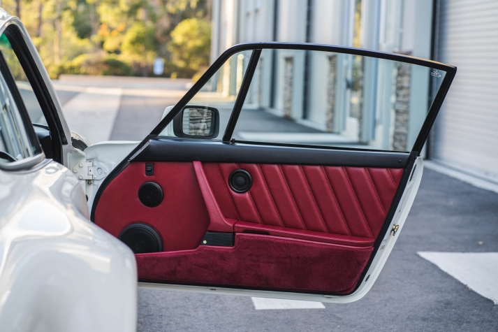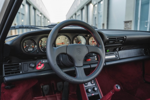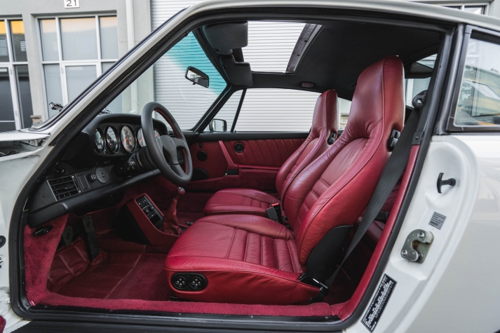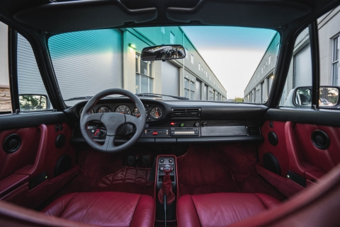 The interior features red upholstery on the seats, complemented by matching door panels and carpeting. The dashboard is trimmed in black, and a CD player from a 993-generation 911 has been installed. The car is also equipped with air conditioning.