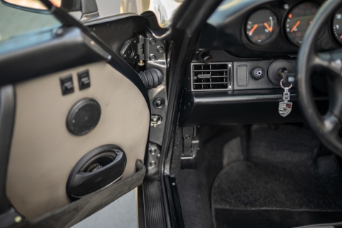 "This 1990 Porsche 911 Carrera Cabriolet spent time in Illinois, New York, and South Carolina before being acquired in 2009 by the current owner, who has since added approximately 18k of the 53k miles shown. The car is finished in Slate Gray Metallic over a custom gray leather interior with black accents, and the 3.6-liter flat-six delivers power to the rear wheels through a five-speed manual transmission. Additional equipment includes a black soft top, aftermarket wheels, ventilated multi-piston disc brakes, and a Kenwood stereo. This 964 Cabriolet is now offered on dealership consignment in Monterey, California with factory tools, a clean Carfax report, and a clean Texas title."