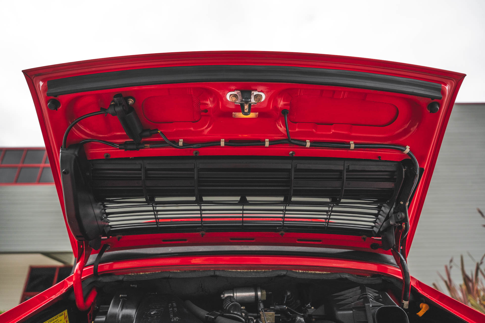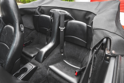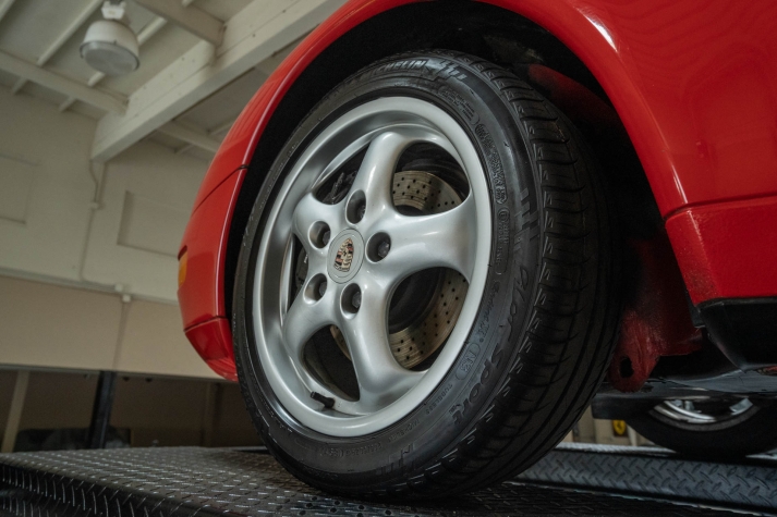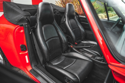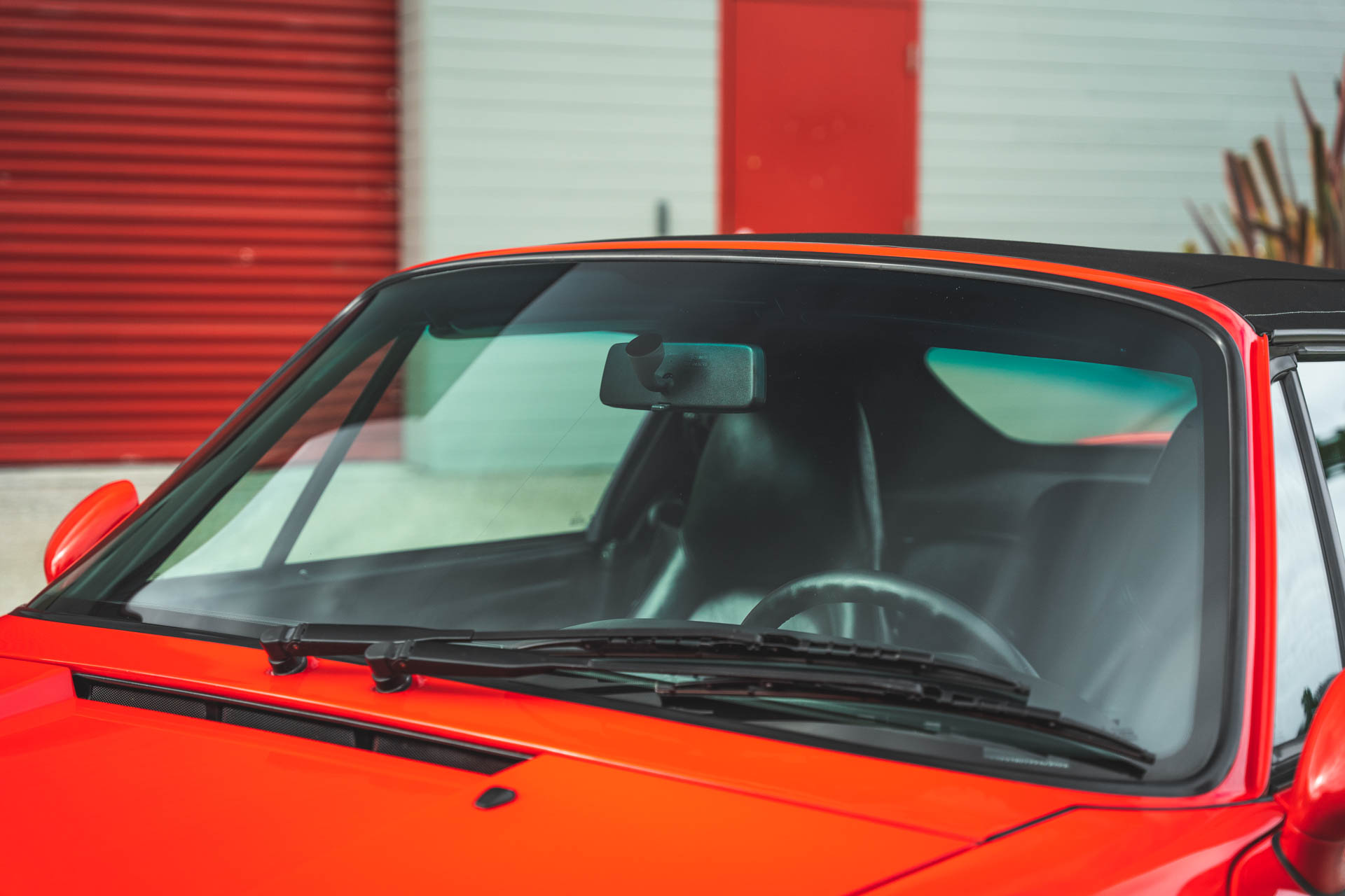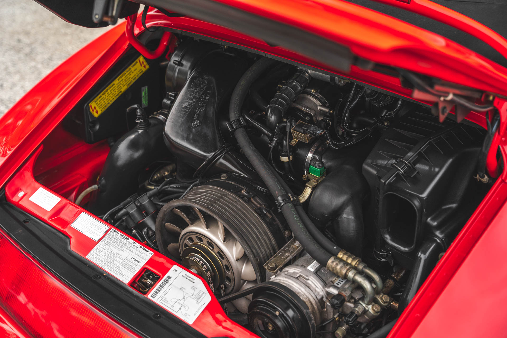 The car is finished in Guards Red and features a power-retractable black soft top as well as headlight washers, fog lights, power-adjustable mirrors, a speed-activated rear spoiler, and dual exhaust outlets. Photos of paint meter readings are provided in the gallery below.