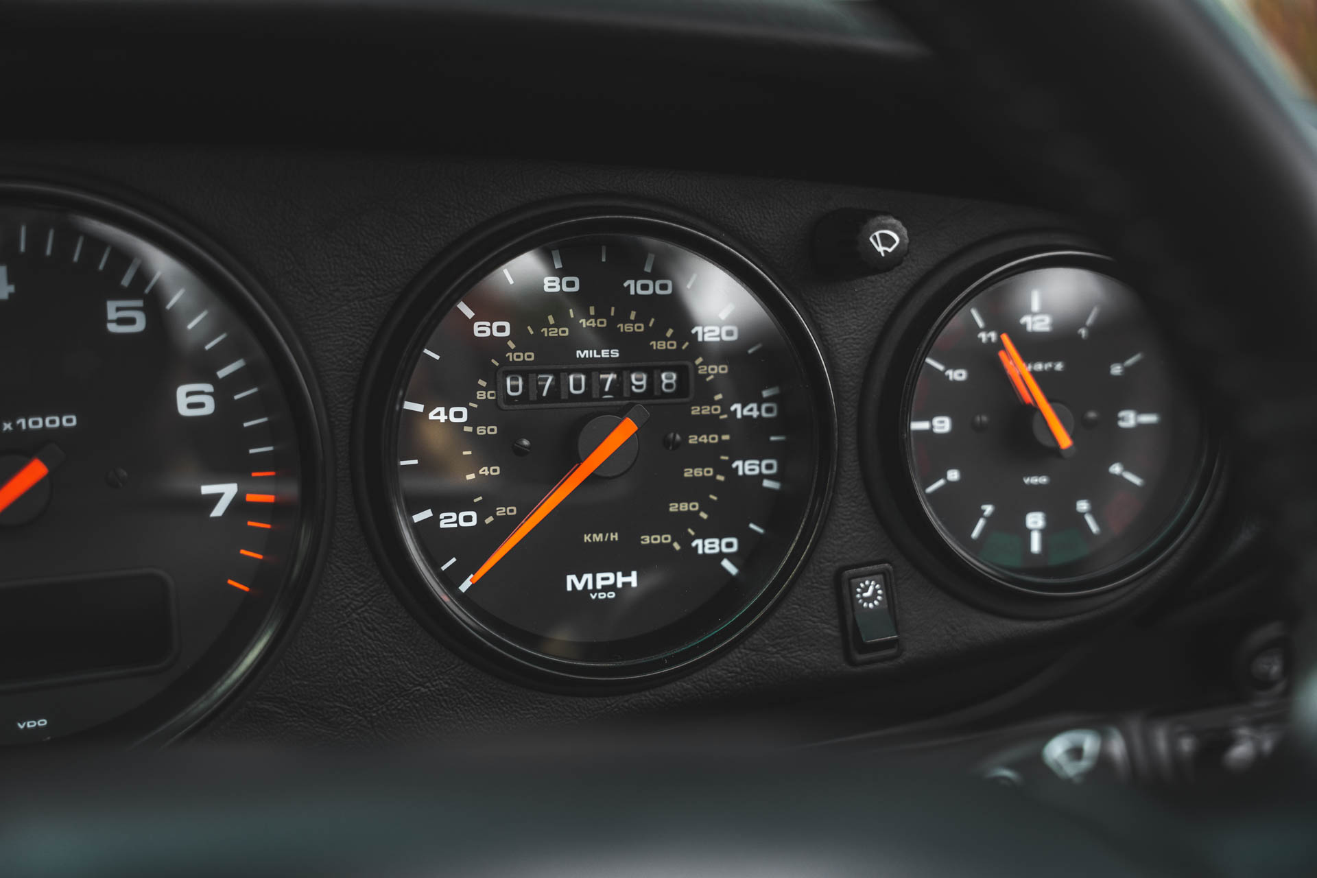The leather-wrapped steering wheel frames VDO instrumentation including a central tachometer with a 6,800-rpm redline, a 180-mph speedometer, an analog clock, and gauges for oil pressure, oil temperature, oil level, and fuel level. The six-digit odometer shows under 71k miles, approximately 55k of which were added under current ownership.