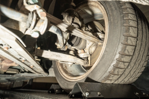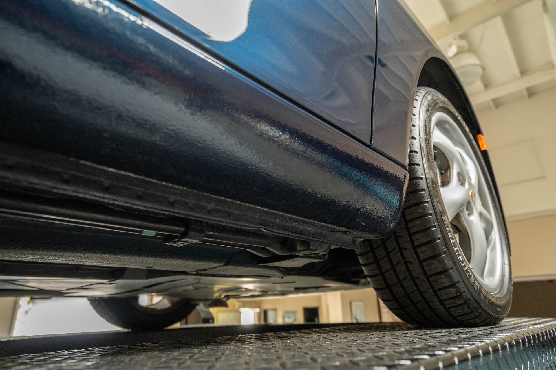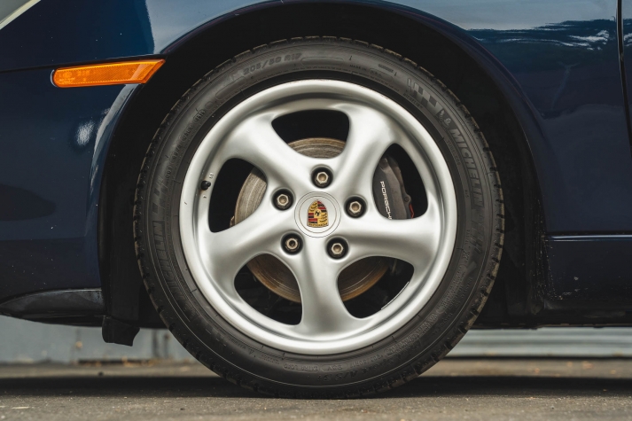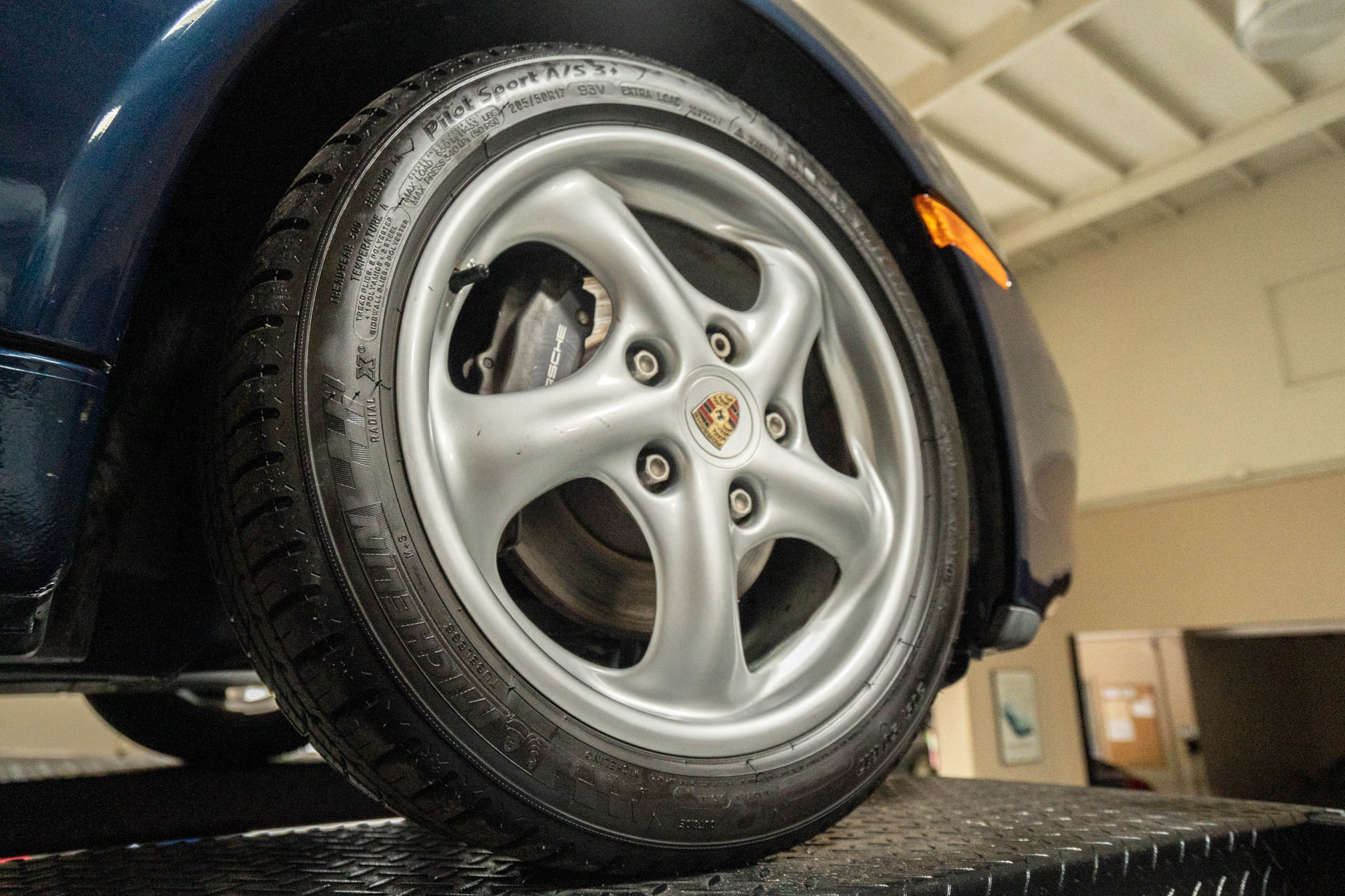 The 17” Carrera-look twist-spoke wheels are mounted with 205/50 front and 255/40 rear Michelin Pilot Sport A/S 3+ tires. Multiple wheels have blemishes. Braking is handled by four-piston Porsche-branded calipers fitted over vented rotors at all four corners.