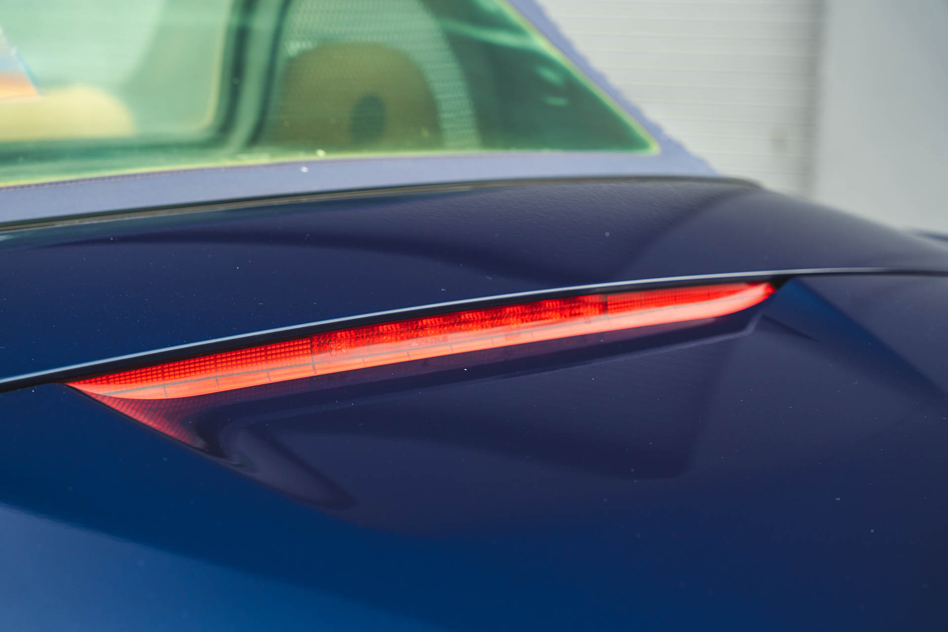 The car is finished in Ocean Blue Metallic and features a blue soft top, a speed-activated rear spoiler, side air intakes, and roll hoops. A tear in the soft top rear window is covered with tape and the selling dealer notes stone chips on the nose and a ding in the left door.
