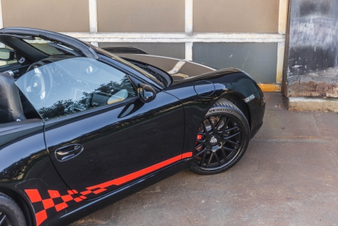 The car is finished in black (A1) and features a black convertible soft top, bi-xenon headlights, fog lights, rain-sensing windshield wipers, a speed-activated rear spoiler, and dual exhaust outlets with polished finishers. Red checkered flag decals have been applied to the sides.