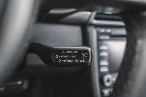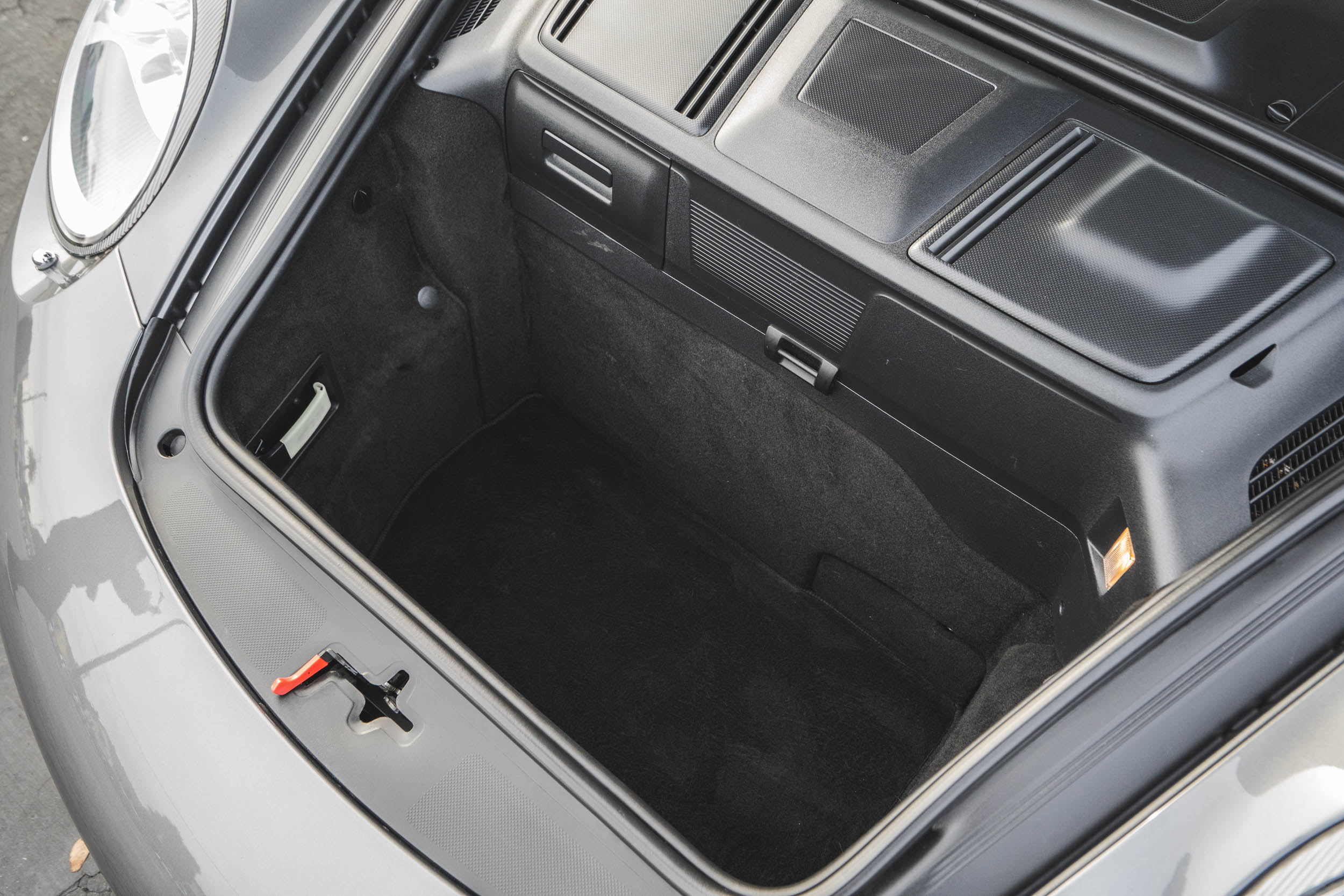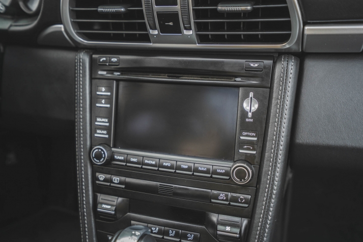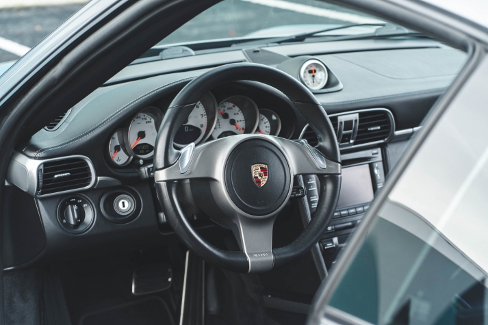 The leather-wrapped steering wheel frames a central tachometer and a 200-mph speedometer as well as gauges for oil temperature, oil pressure, coolant temperature, and fuel level. The optional Sport Chrono Package added a stopwatch atop the dashboard. The digital odometer indicates 47k miles, approximately 10k of which were added under current ownership.