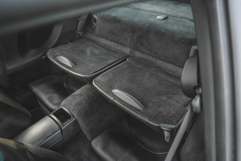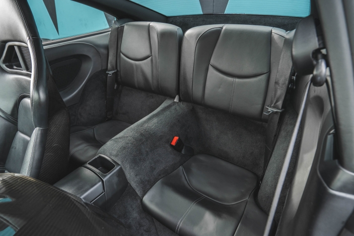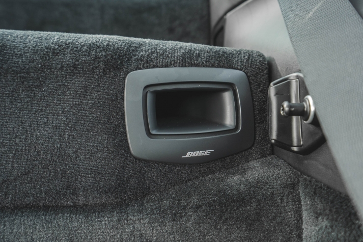The sport bucket seats upholstered in black leather that extends to the dashboard and door panels. Interior amenities include PCM with navigation, Bose audio, self-dimming mirrors, automatic climate control, and cruise control. A LoJack theft recovery system has been added. The trunk-release switch was replaced in preparation for the sale.