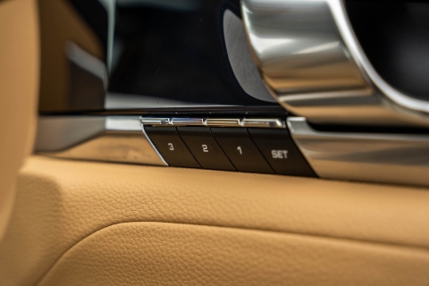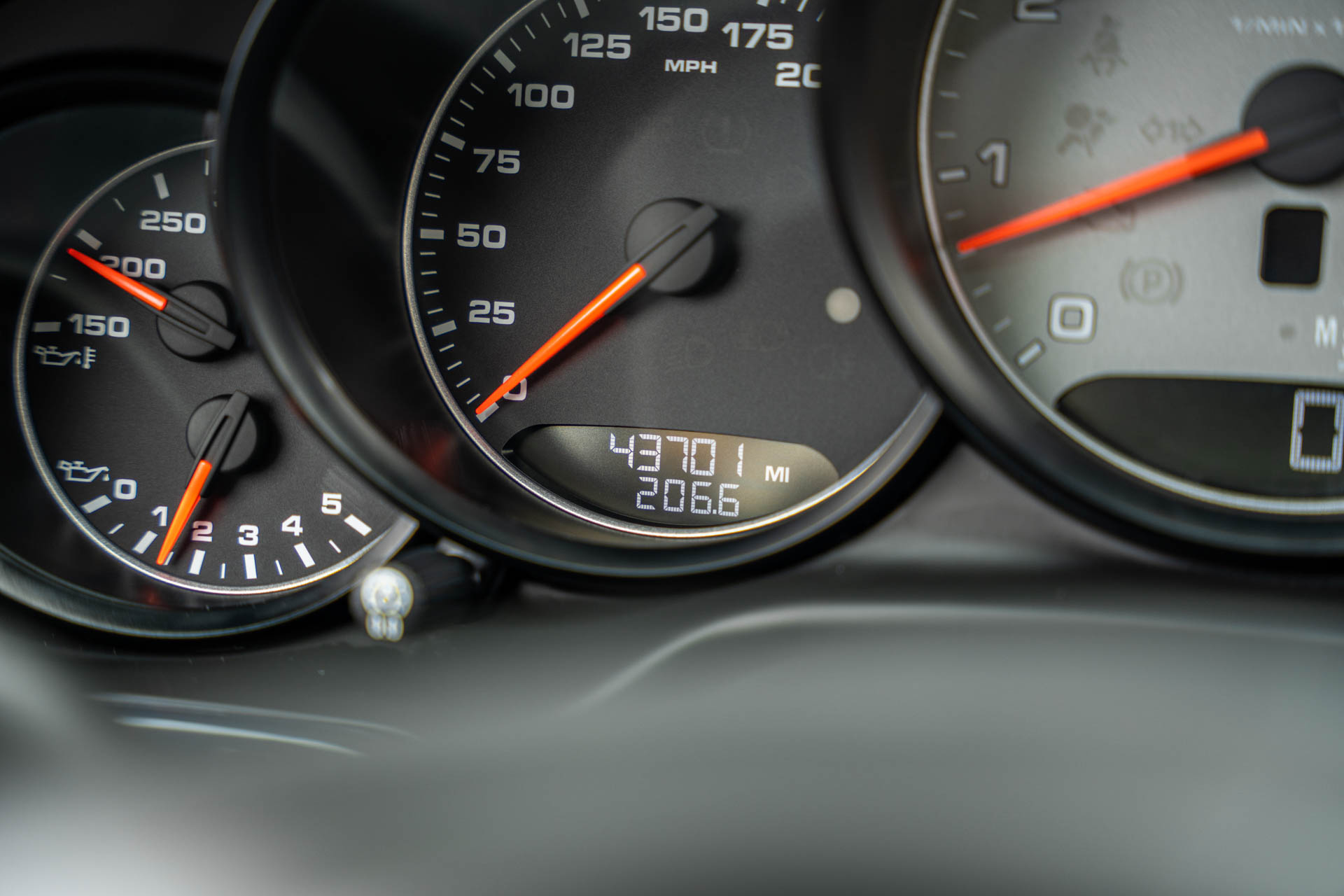 The leather-wrapped multifunction steering wheel fronts a central tachometer with a 6,600-rpm redline as well as a 200-mph speedometer, a digital display, and auxiliary gauges. The Sport Chrono package added a stopwatch atop the dashboard. The digital odometer indicates 44k miles, approximately 1,300 of which were added under current ownership.