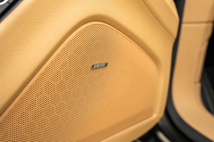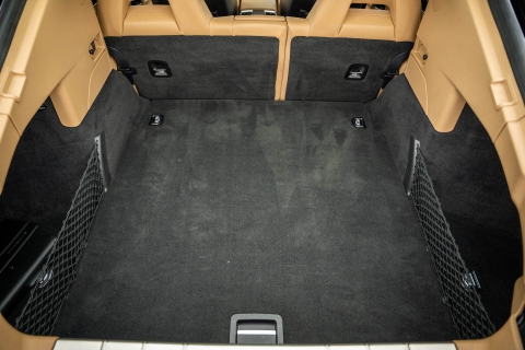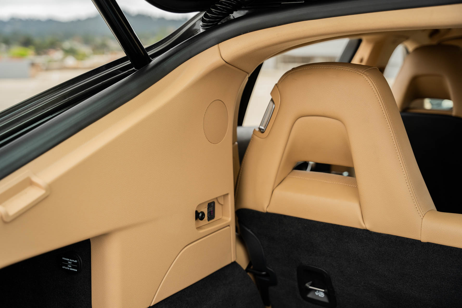 The interior features heated and ventilated 14-way power-adjustable front seats upholstered in Luxor Beige leather along with a color-coordinated lower dashboard, door panels, and a full-length center console. Porsche-branded floor mats line the footwells, and amenities include the Premium Package Plus, heated rear seats, piano black trim, four-zone automatic climate control, touchscreen infotainment with navigation, a Bose sound system. Scratches are visible on the rear center console trim.