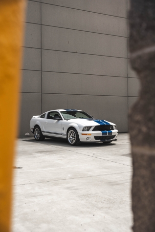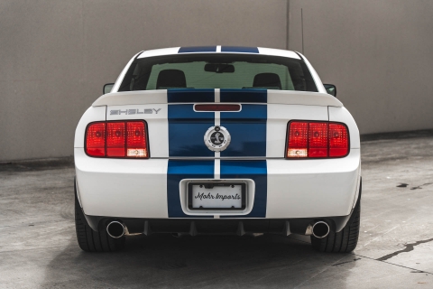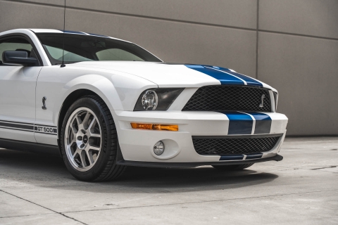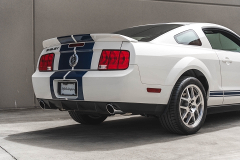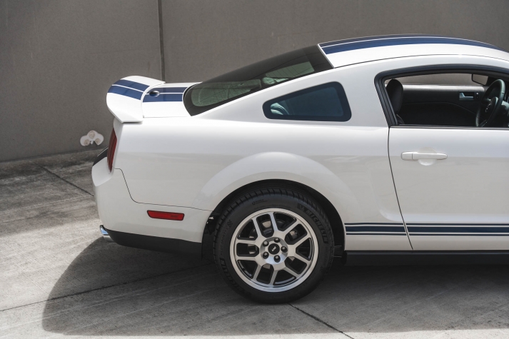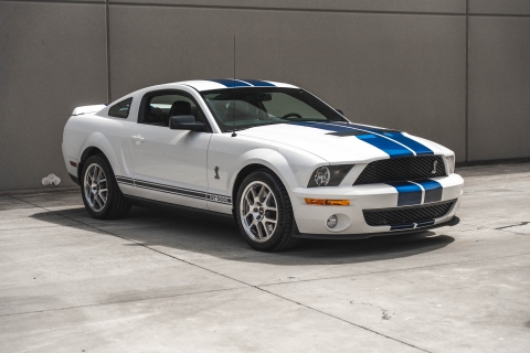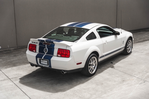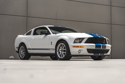This 2008 Ford Mustang Shelby GT500 coupe was first sold at Timberline Auto Center Inc. in Libby, Montana, and remained with a single family from new until it was acquired by the current owner on BaT in December 2021. Now indicating 922 miles, the car is finished in Performance White with blue stripes over Dark Charcoal leather upholstery. Power is provided by a supercharged 5.4-liter V8 paired with a six-speed manual transmission, and equipment includes a limited-slip differential, a ventilated hood, an SVT-tuned suspension, Brembo front brake calipers, 18? forged alloy wheels, air conditioning, cruise control, and a Shaker 500 audio system linked to an AM/FM stereo with a CD changer. This GT500 is offered on dealer consignment with manufacturer’s literature, removed mufflers, a clean Carfax report, and a clean California title.