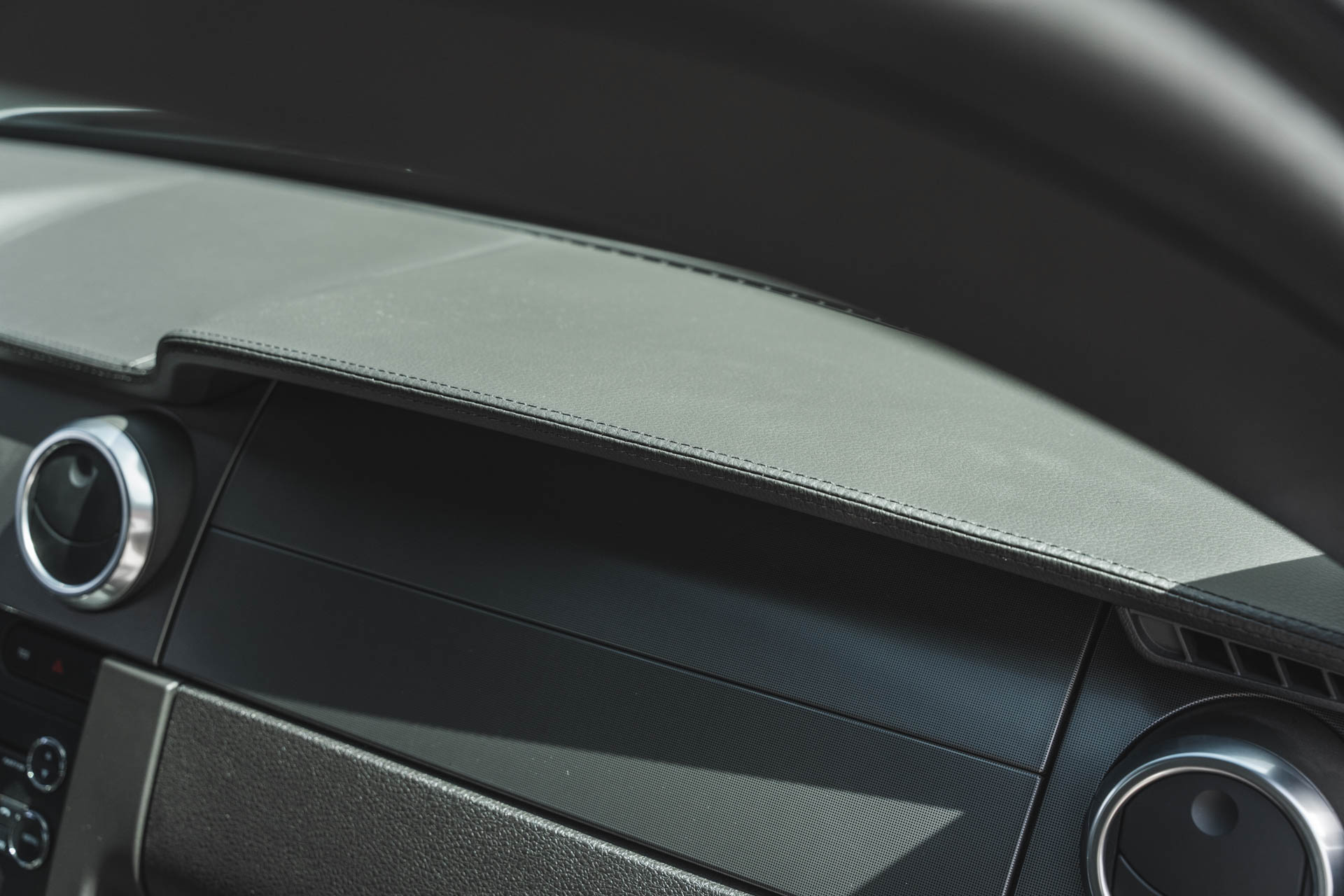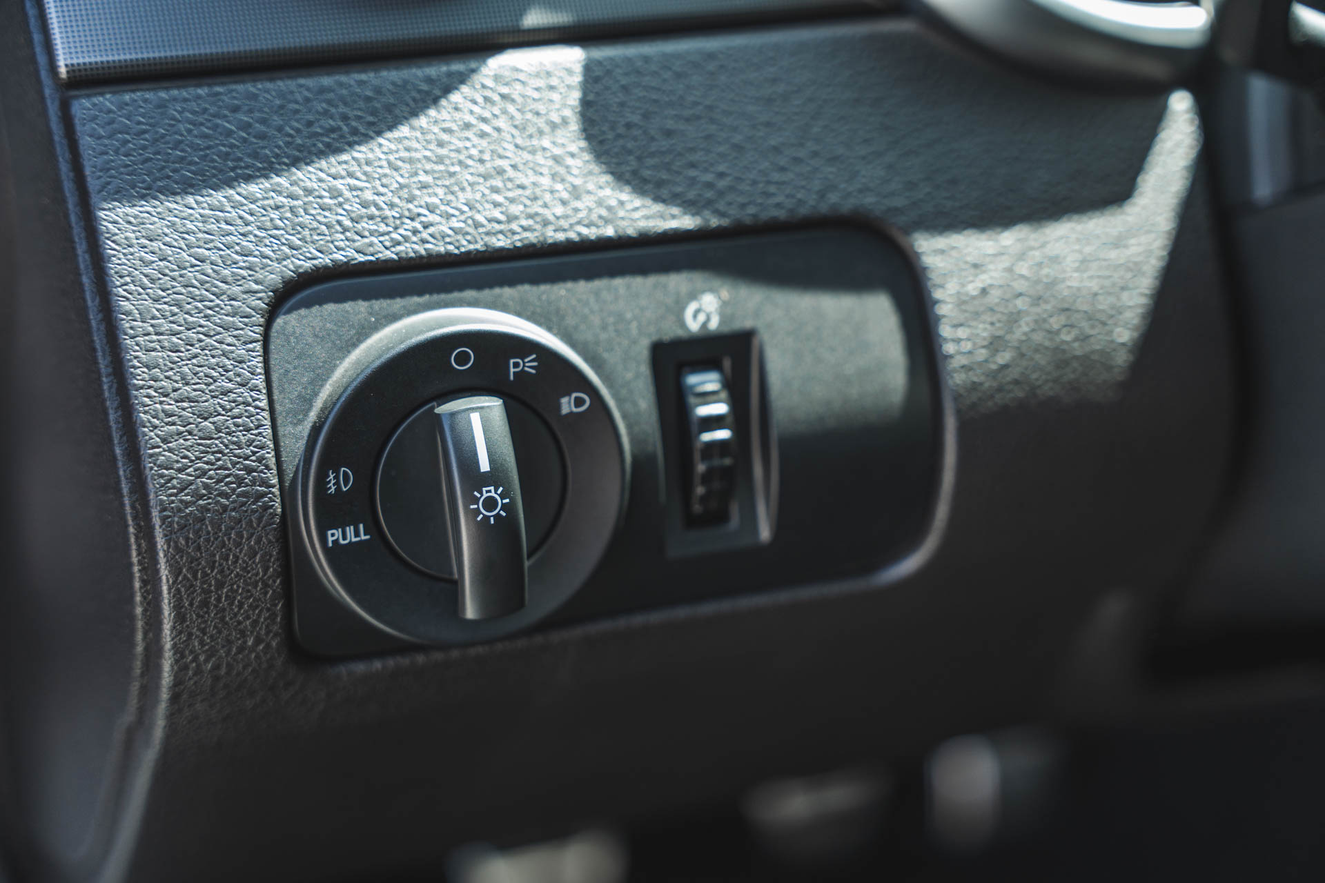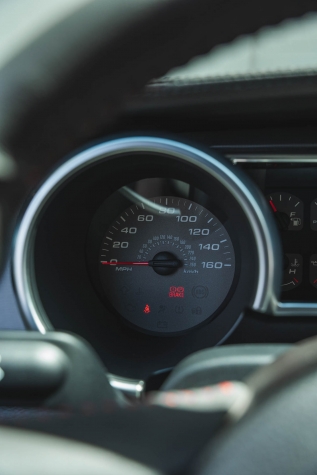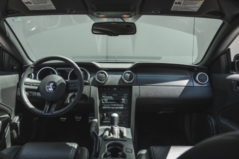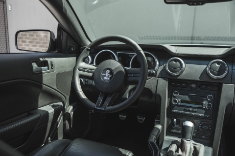 The leather-wrapped steering wheel wears a Shelby GT500-branded horn button, and it sits ahead of a 160-mph speedometer, a tachometer with a 6k-rpm redline, and a quartet of auxiliary gauges. The digital odometer indicates 922 miles, approximately 800 of which were added under current ownership.