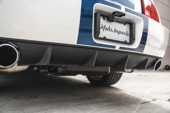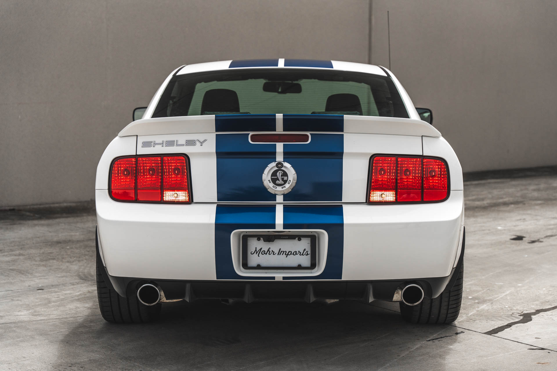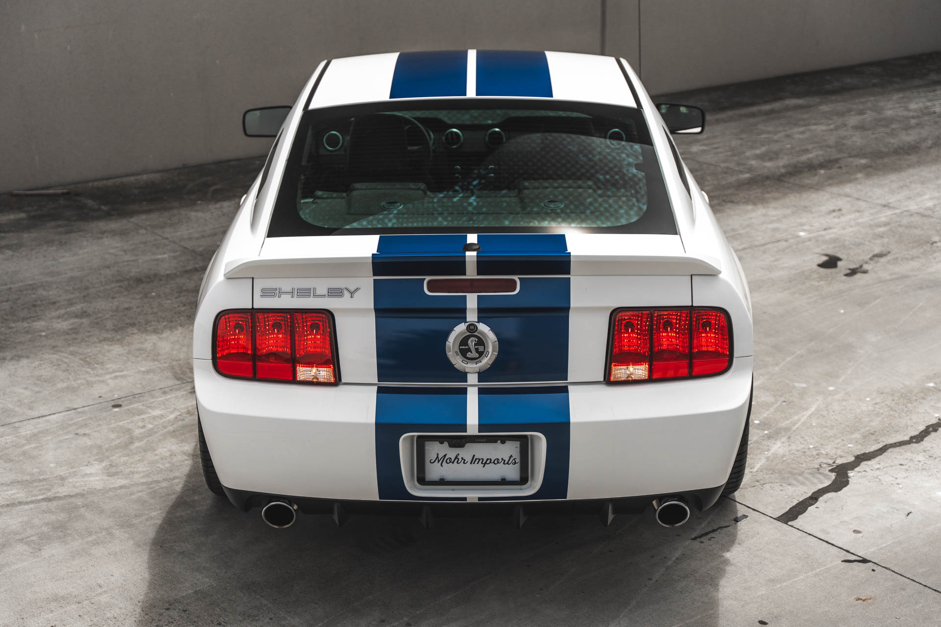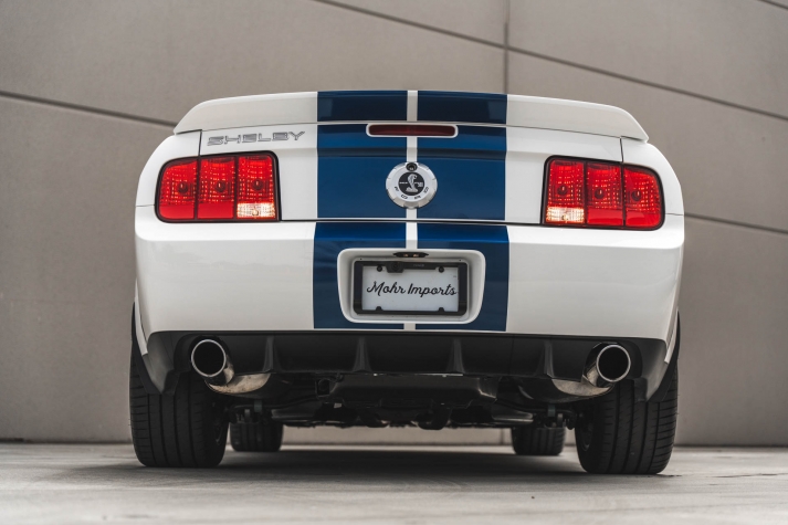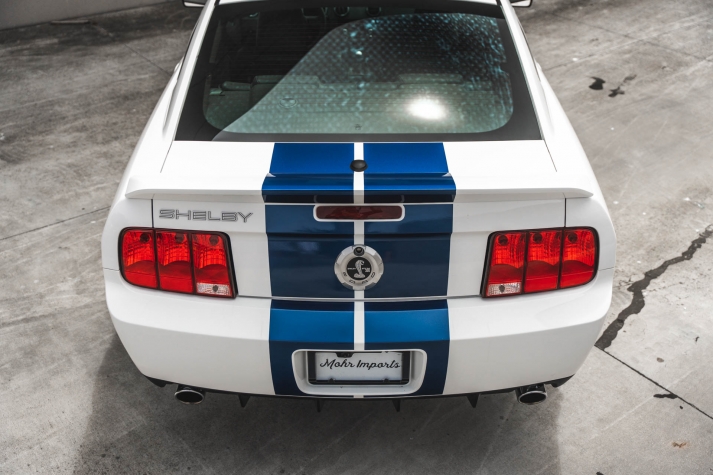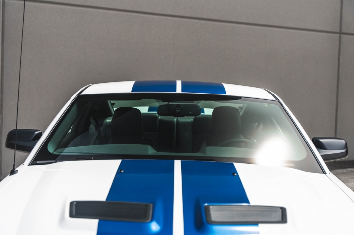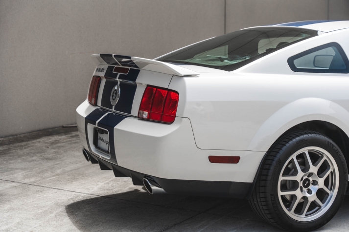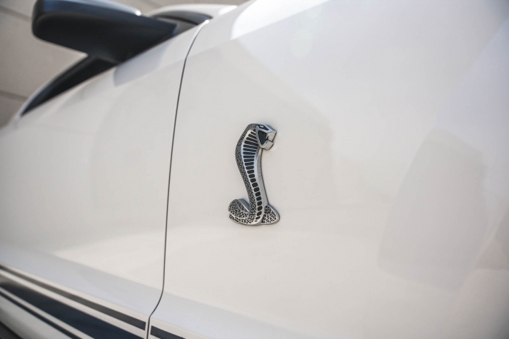 The car is finished in Performance White with blue stripes. Exterior details include a front air dam, a decklid spoiler, a rear diffuser, Shelby badging, a ventilated aluminum hood, and polished exhaust outlets.
