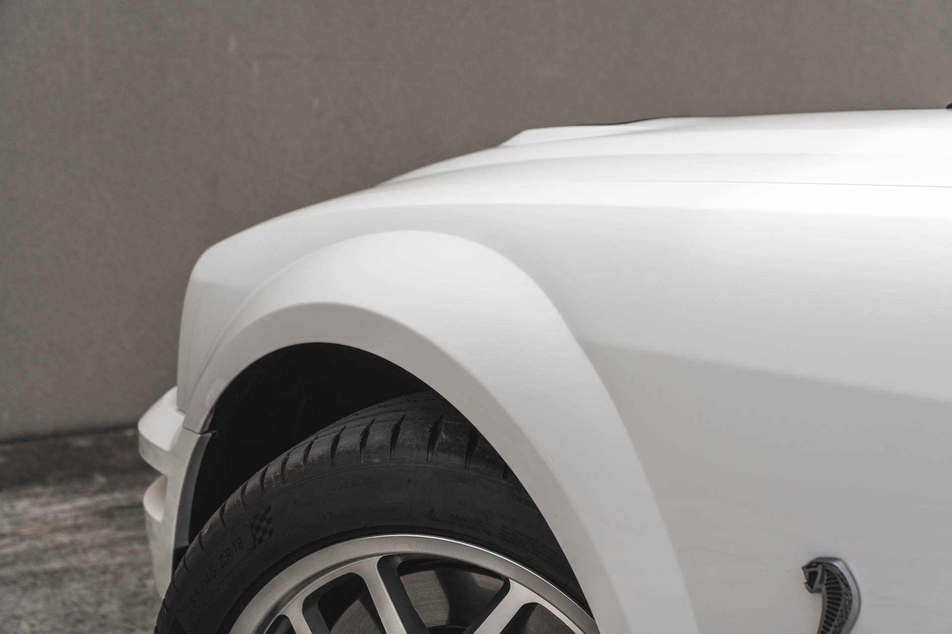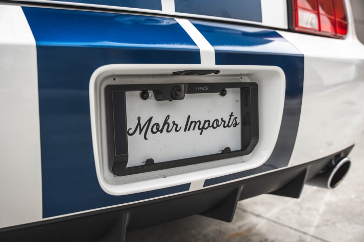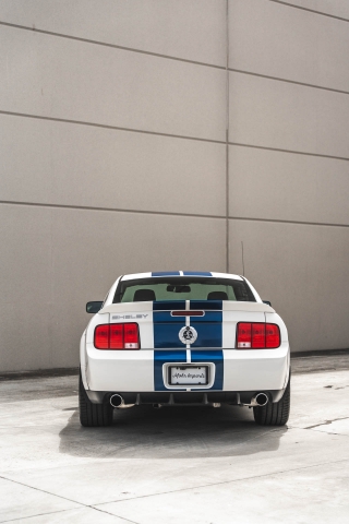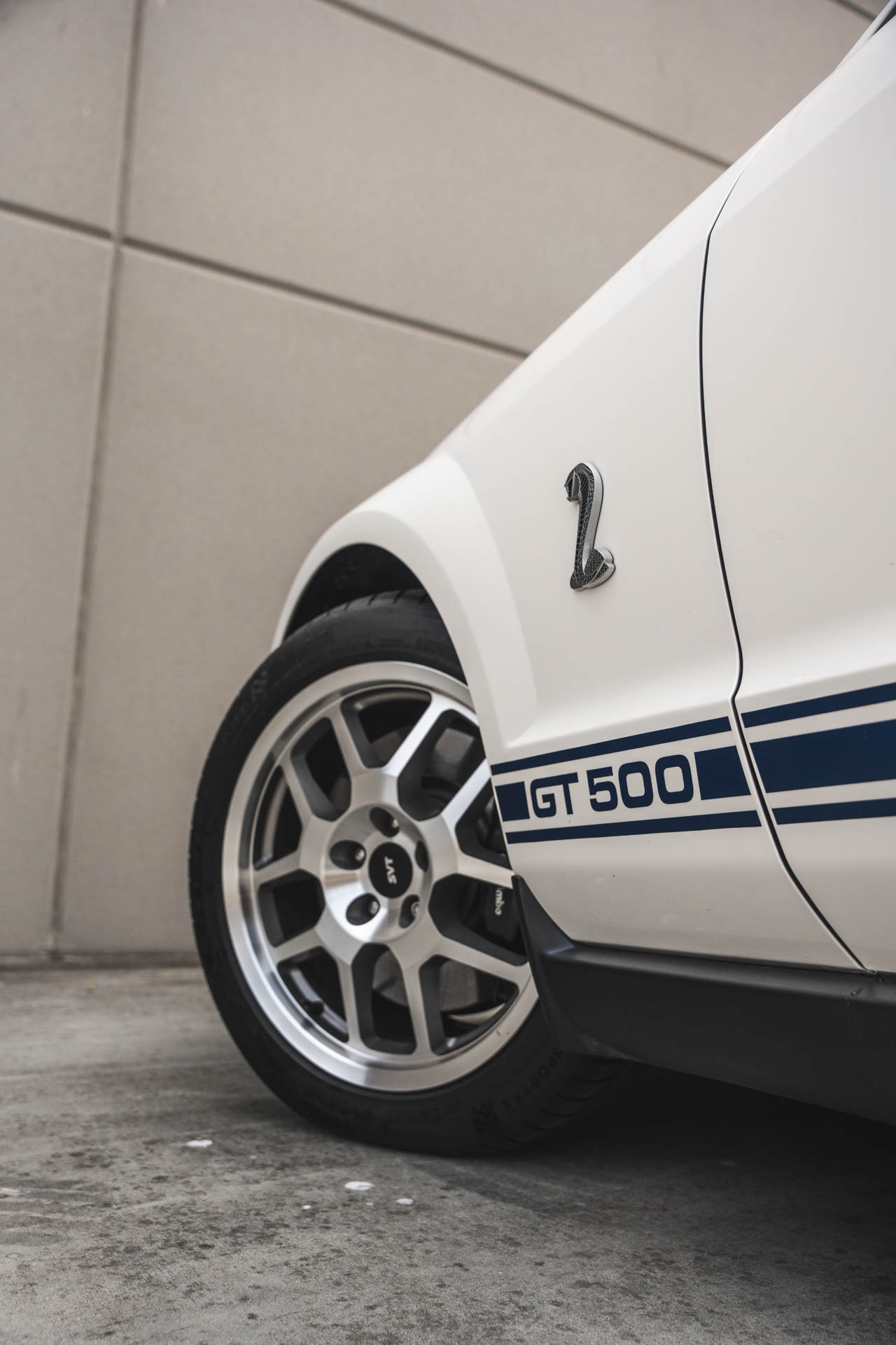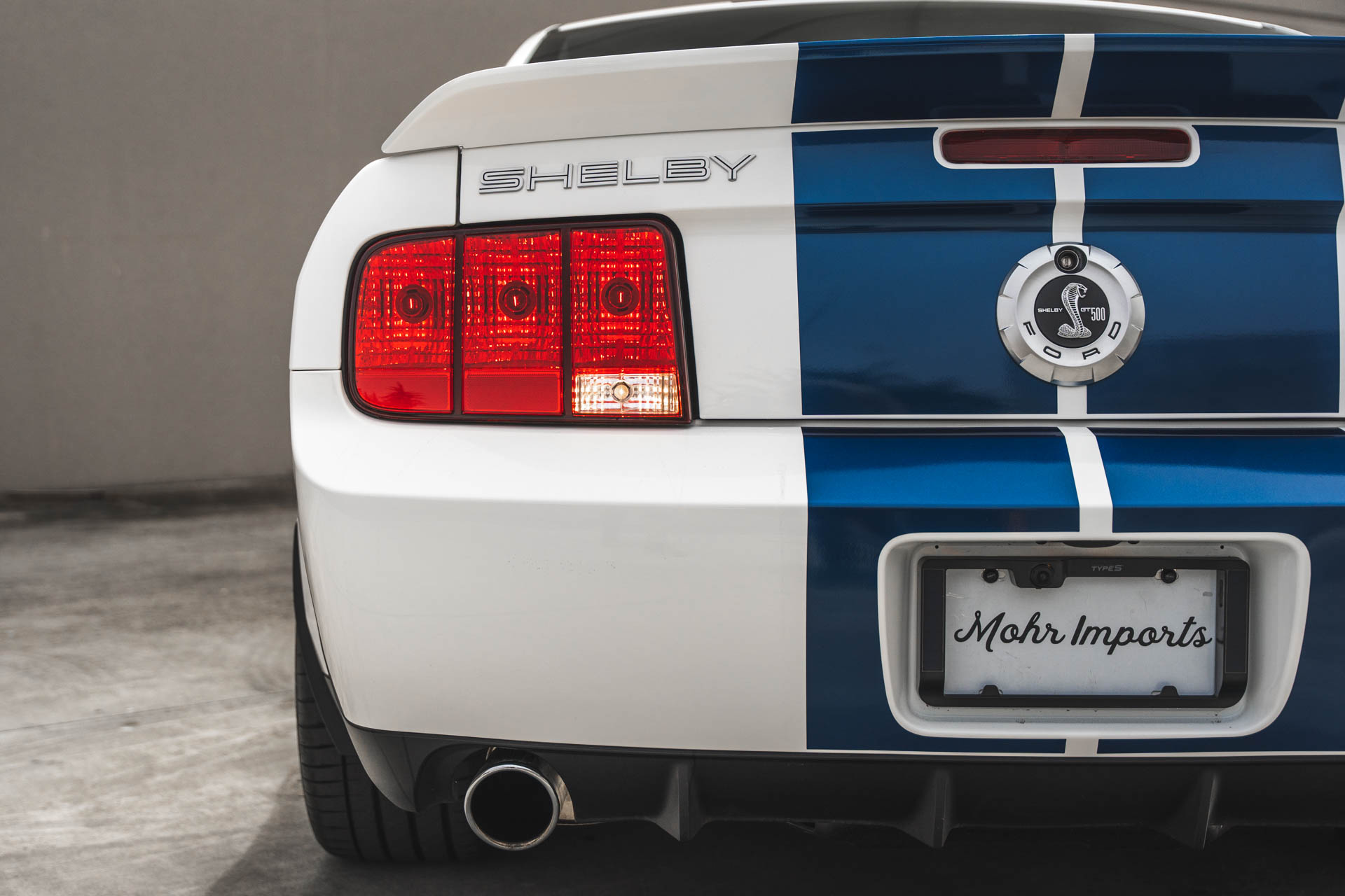 The car is finished in Performance White with blue stripes. Exterior details include a front air dam, a decklid spoiler, a rear diffuser, Shelby badging, a ventilated aluminum hood, and polished exhaust outlets.