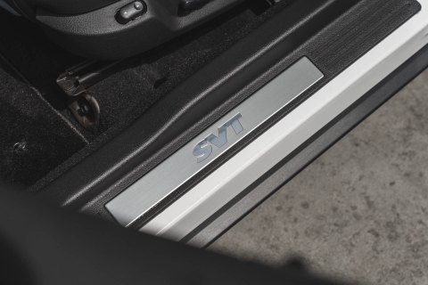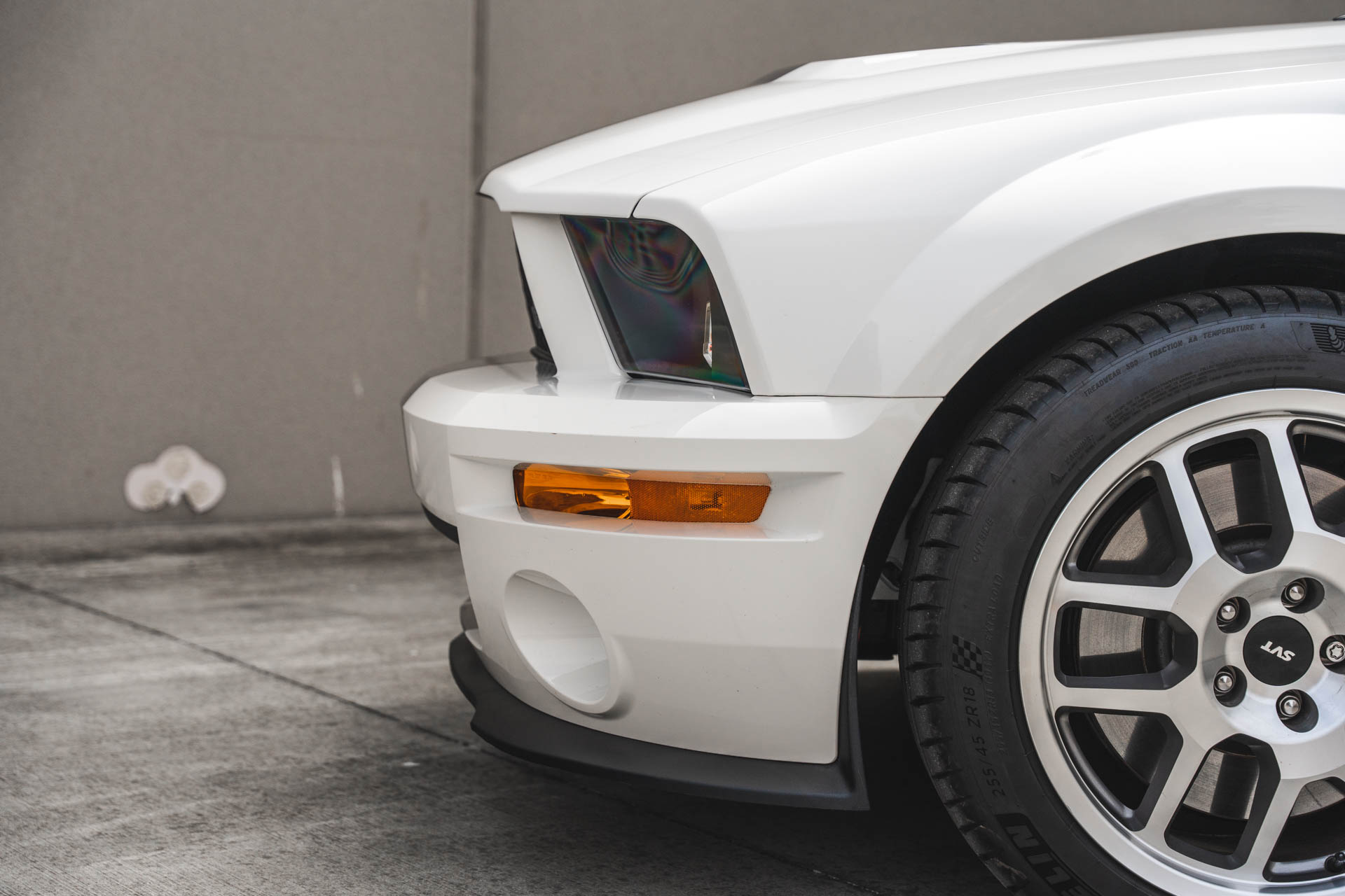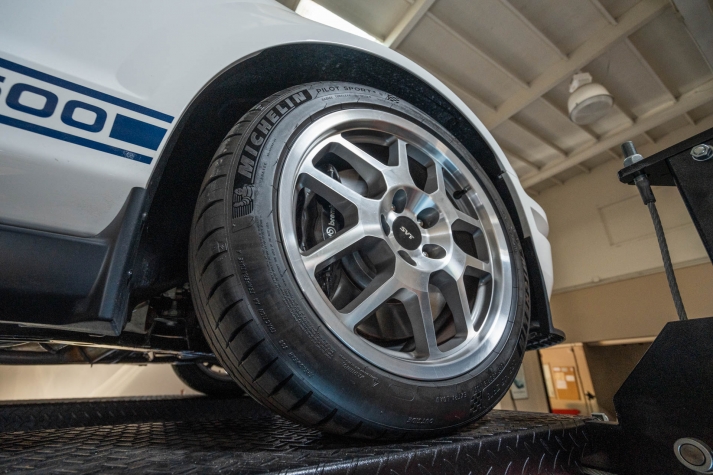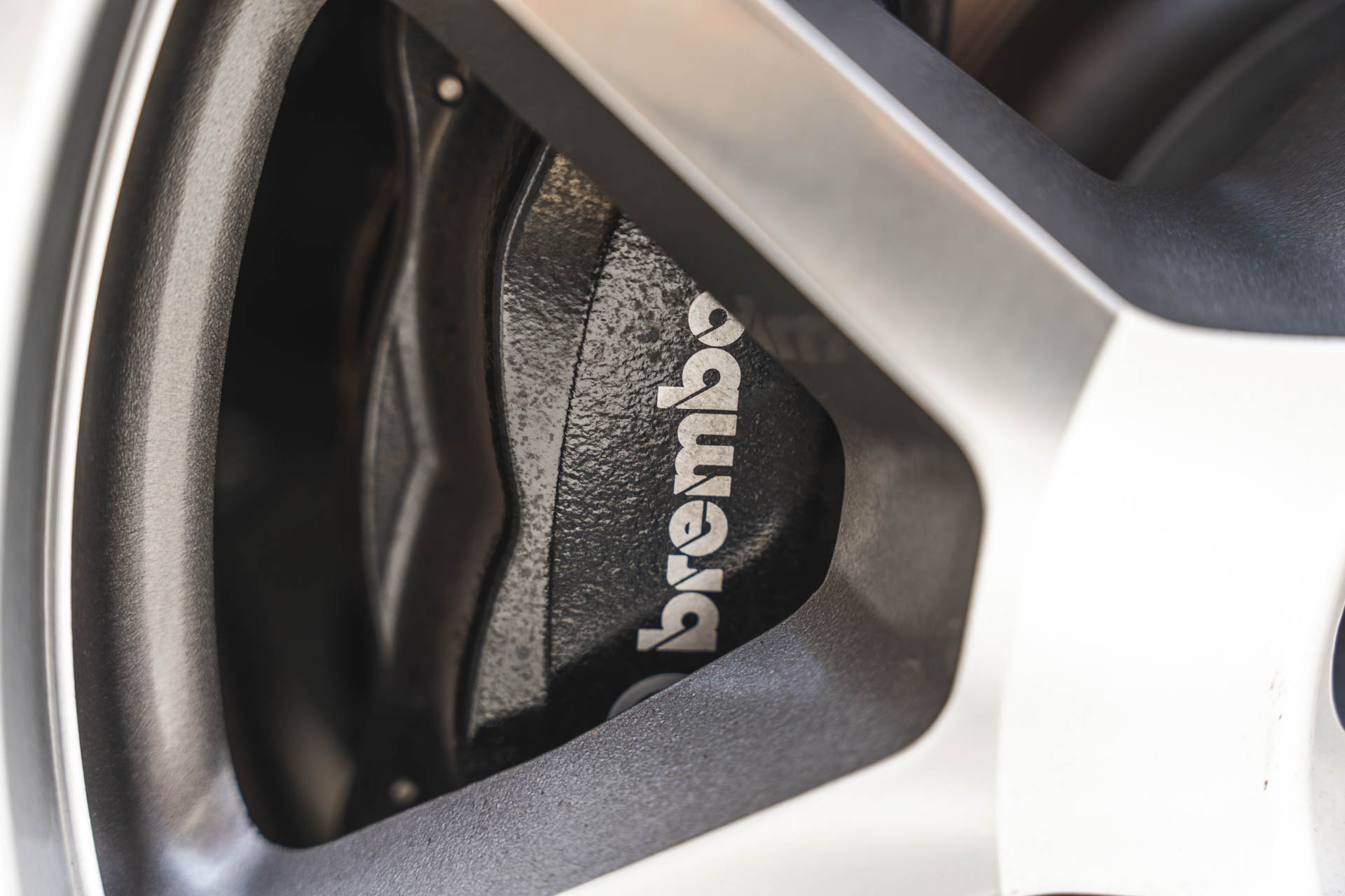 Staggered-width 18? forged alloy wheels were mounted with 255/45 front and 285/40 rear Michelin Pilot Sport 4S tires under current ownership. The car rides on an SVT-tuned suspension. Stopping power is provided by four-wheel disc brakes, and Brembo calipers are fitted over ventilated rotors at the front corners.