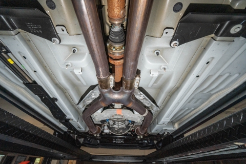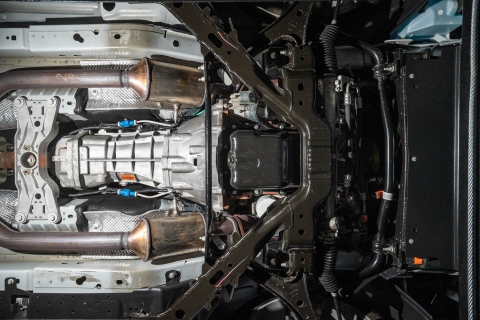 Power is sent to the rear wheels through a six-speed Tremec TR-6060 manual transmission and a limited-slip differential. Borla exhaust mufflers were installed under current ownership, and the removed mufflers are included in the sale. Photos show corrosion on the driveshaft and rear axle.