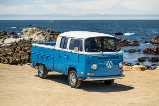 This is a 1970 Volkswagen Type 2 double-cab pickup finished in two-tone blue and white. The second generation…