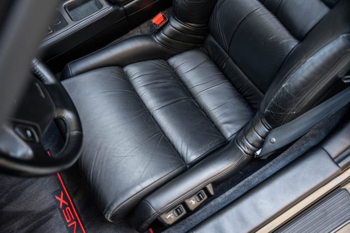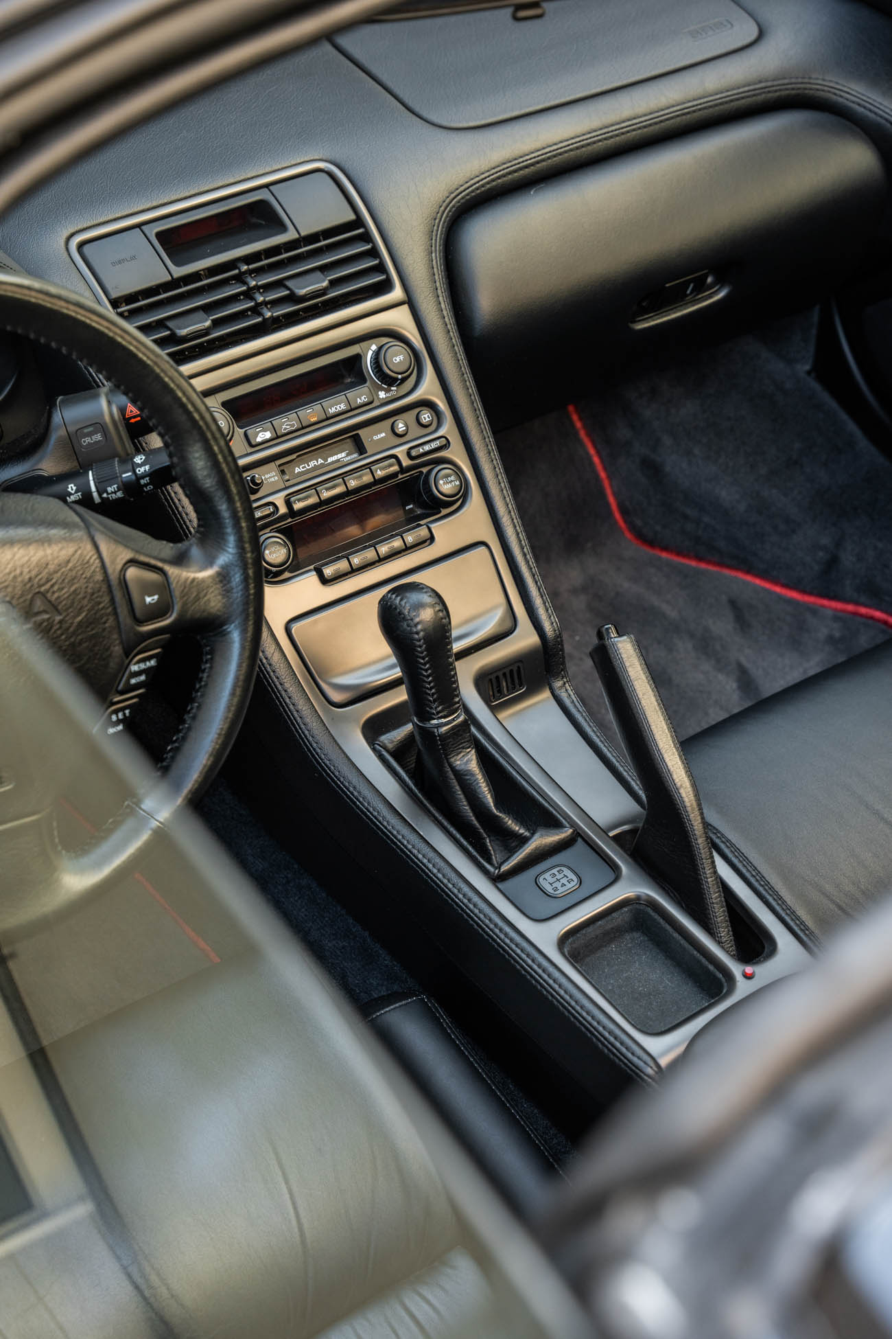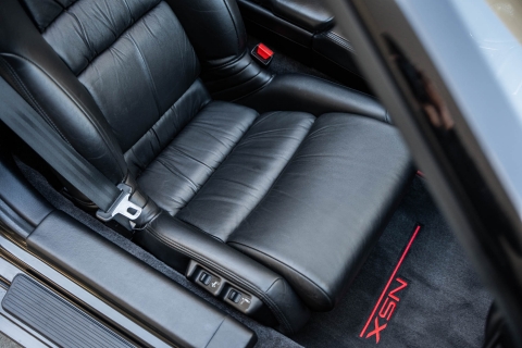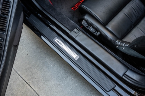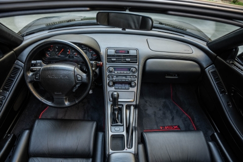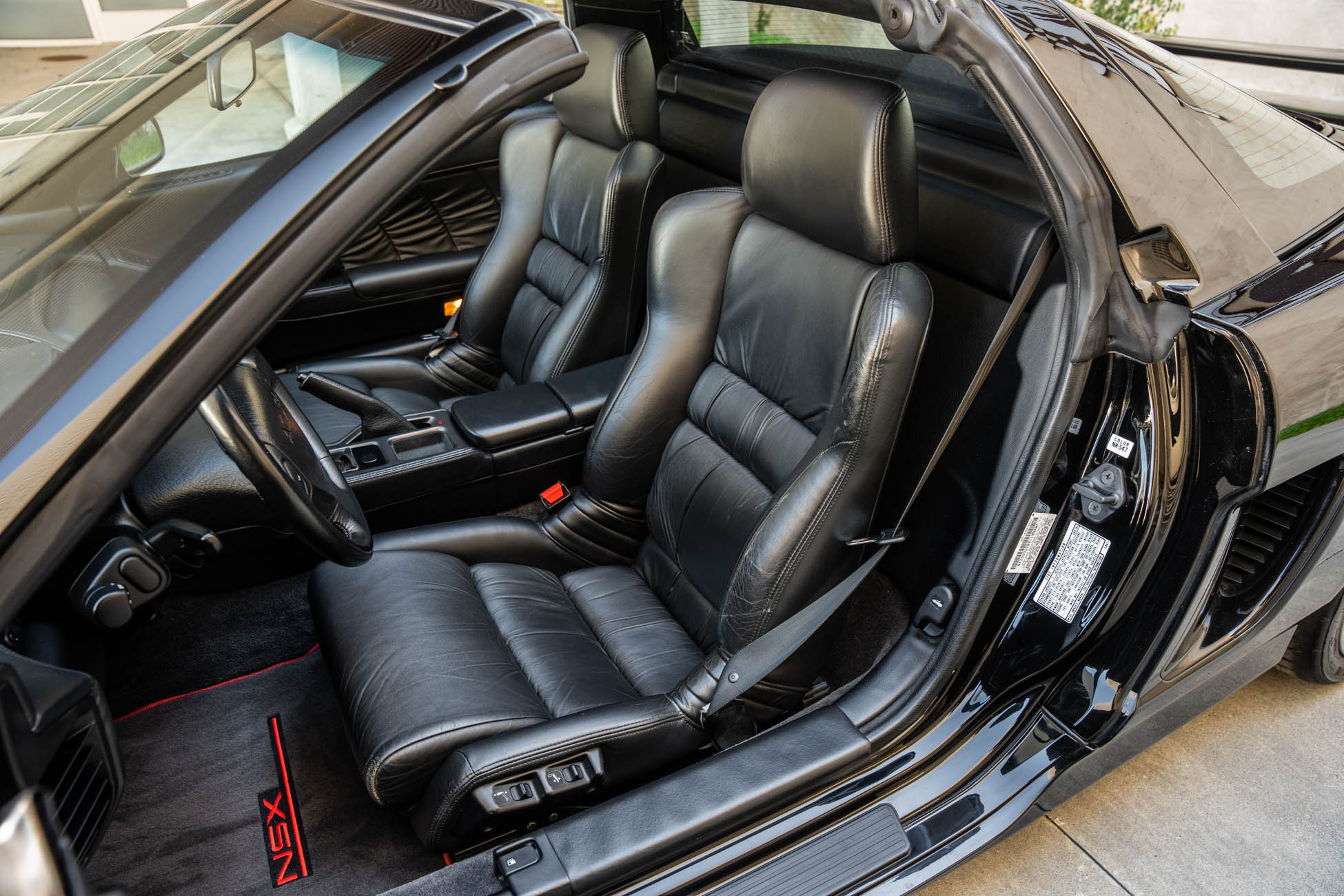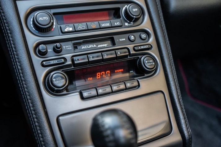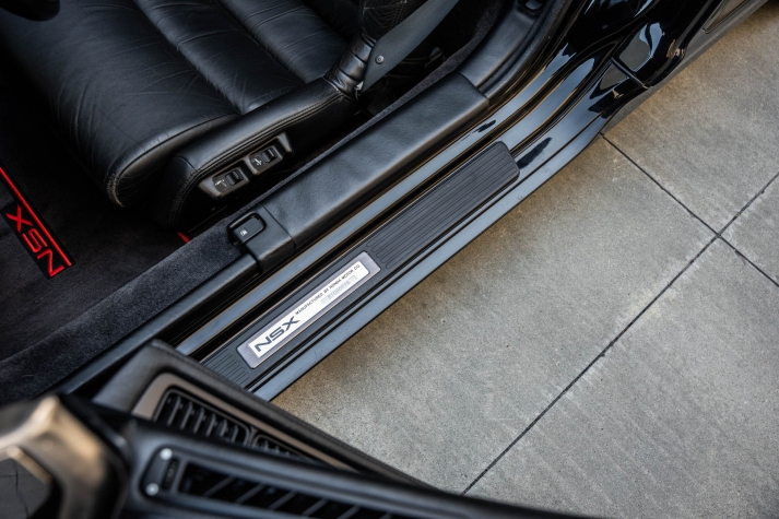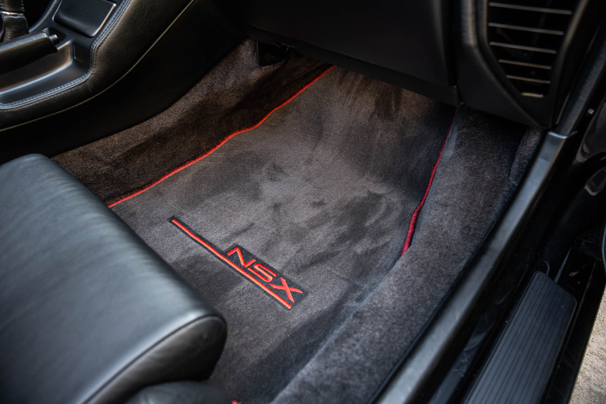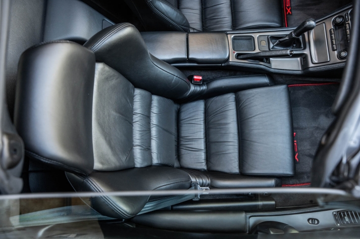 The cabin features power-adjustable sport seats upholstered in black leather, while NSX-branded floor mats line the footwells. Interior appointments include automatic climate control, cruise control, a Bose sound system, and a cassette stereo linked to a six-disc CD changer. The stainless-steel door sill plates are stamped with the car’s serial number. The driver’s seat outer bolster is worn.