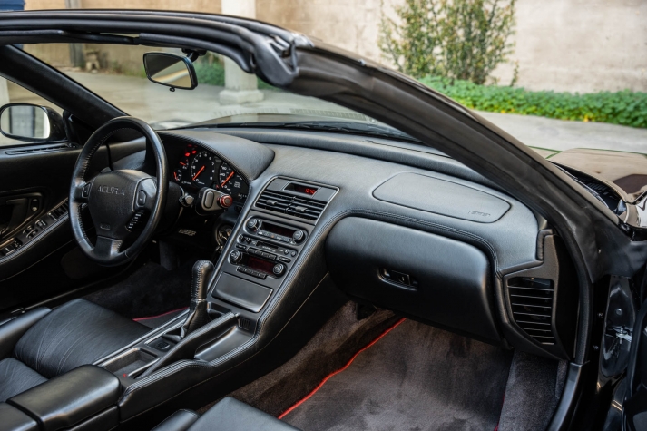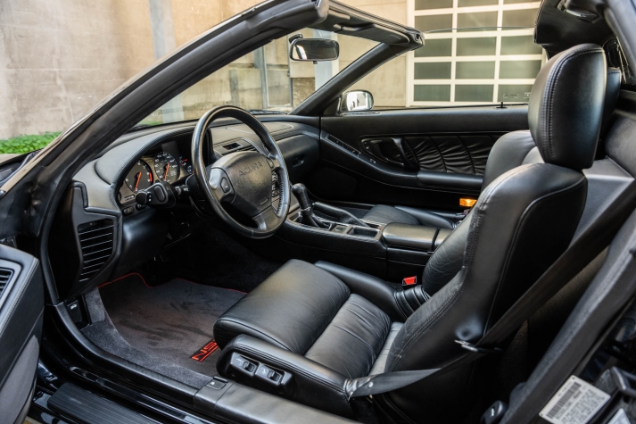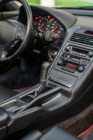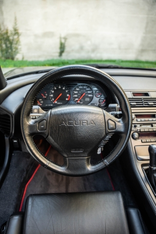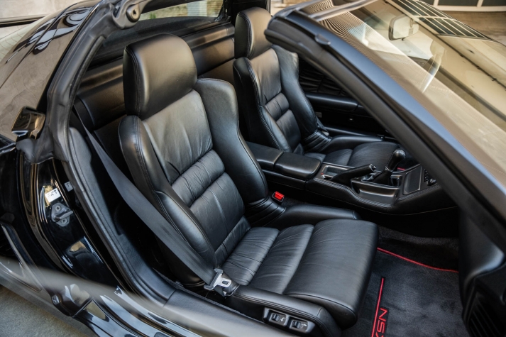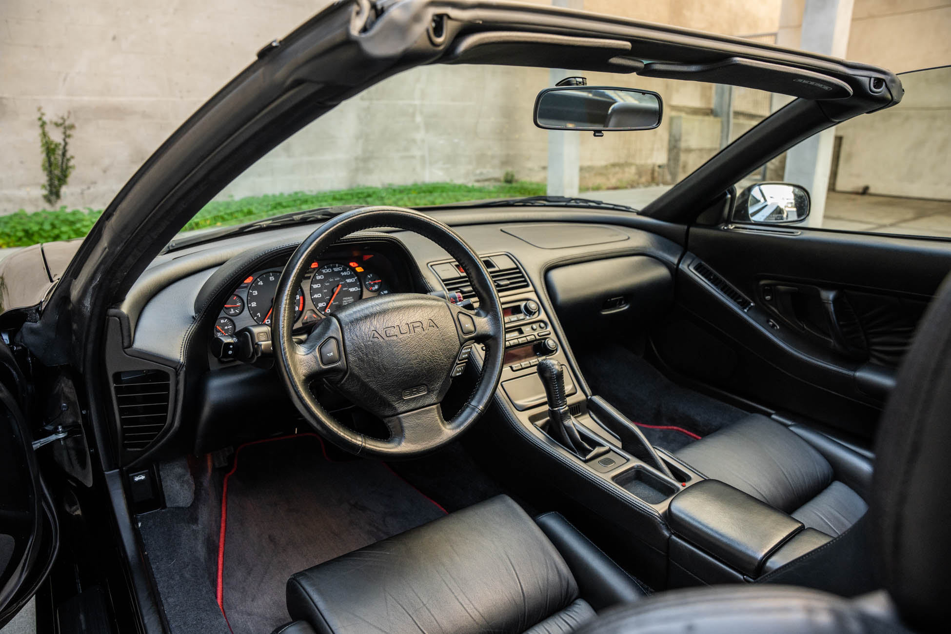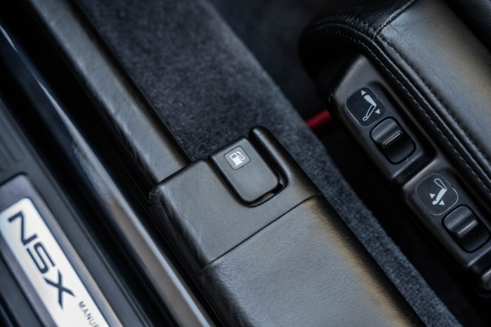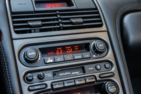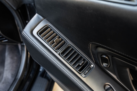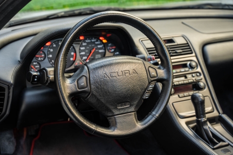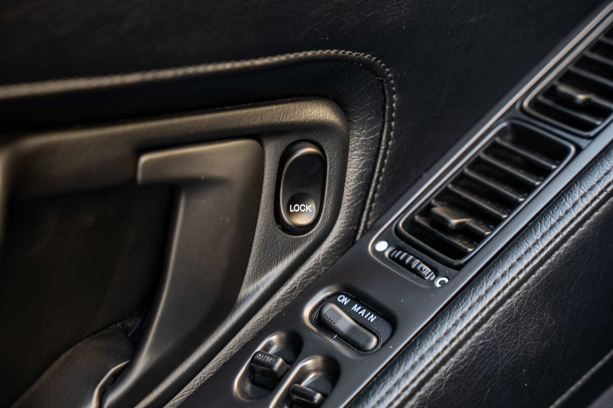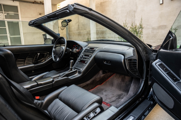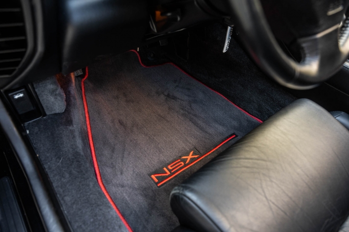 The cabin features power-adjustable sport seats upholstered in black leather, while NSX-branded floor mats line the footwells. Interior appointments include automatic climate control, cruise control, a Bose sound system, and a cassette stereo linked to a six-disc CD changer. The stainless-steel door sill plates are stamped with the car’s serial number. The driver’s seat outer bolster is worn.