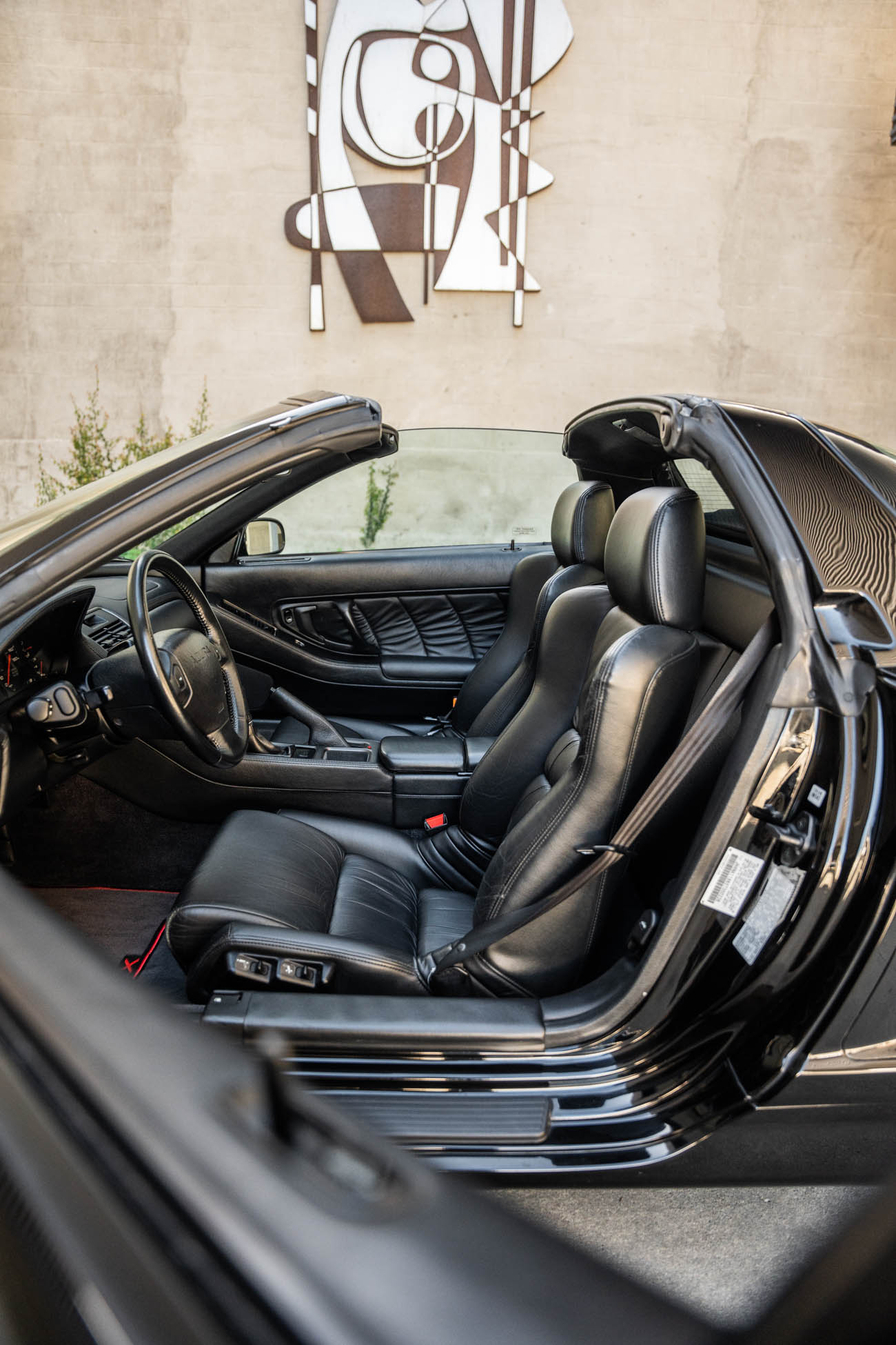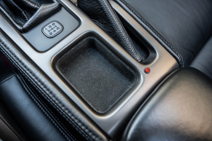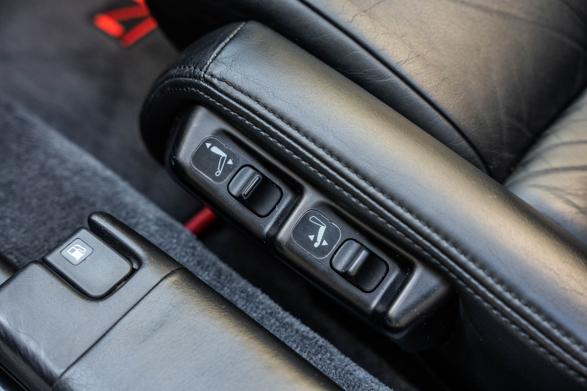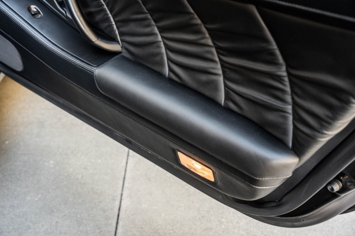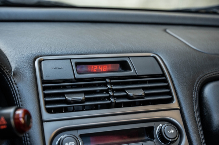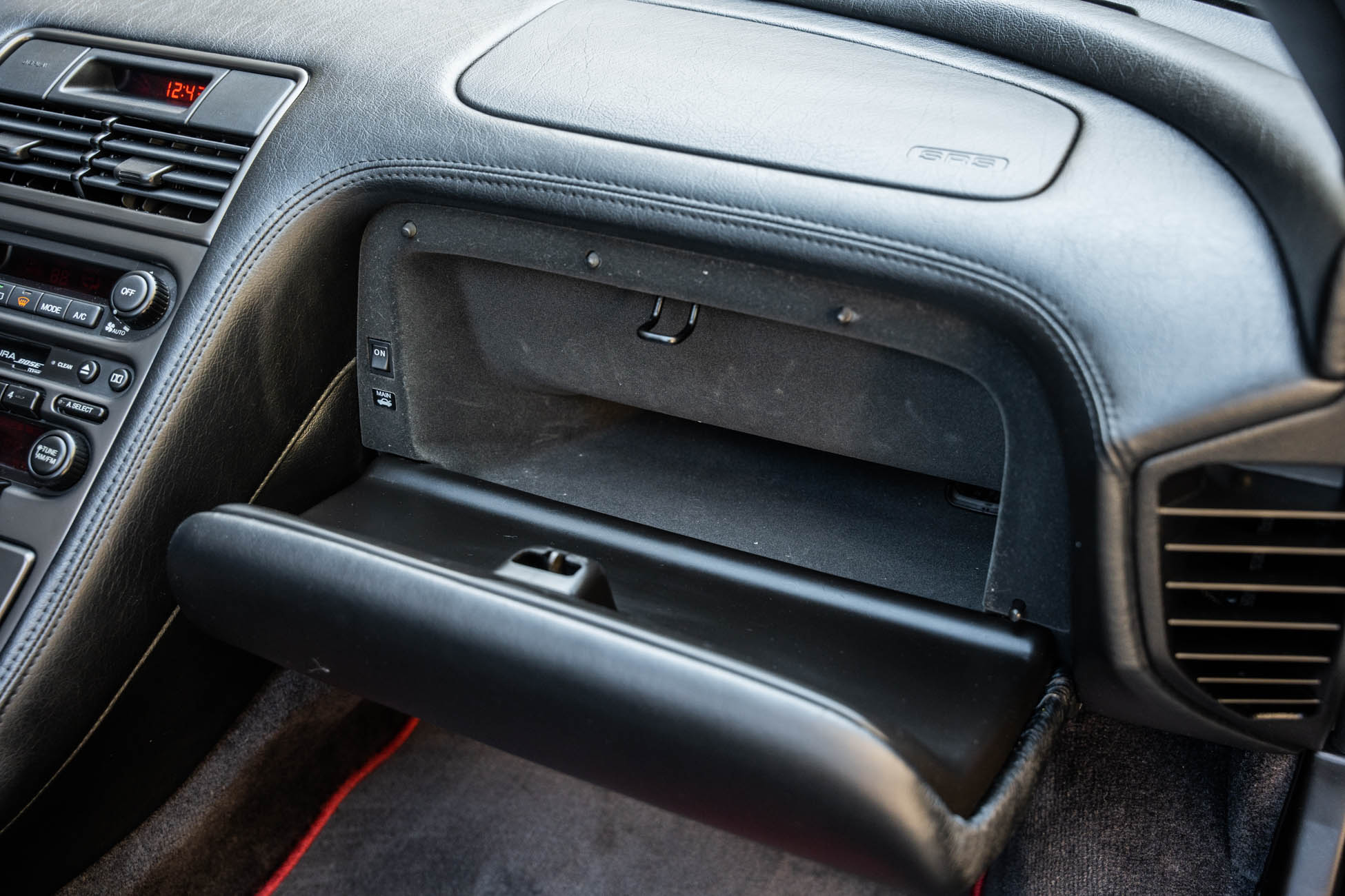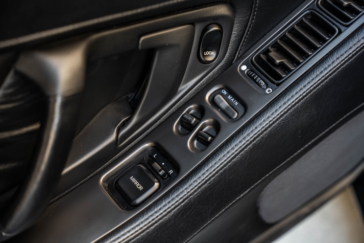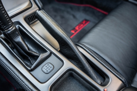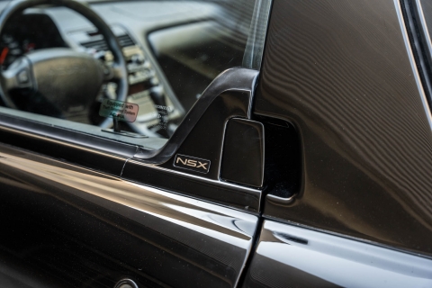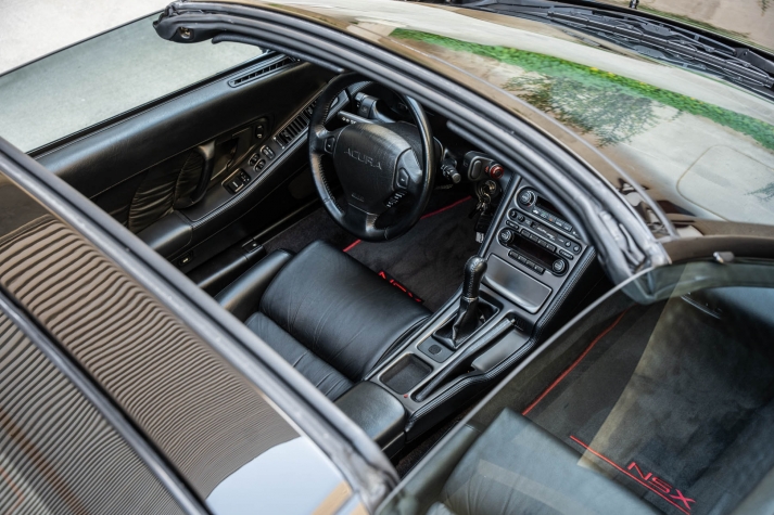 The cabin features power-adjustable sport seats upholstered in black leather, while NSX-branded floor mats line the footwells. Interior appointments include automatic climate control, cruise control, a Bose sound system, and a cassette stereo linked to a six-disc CD changer. The stainless-steel door sill plates are stamped with the car’s serial number. The driver’s seat outer bolster is worn.