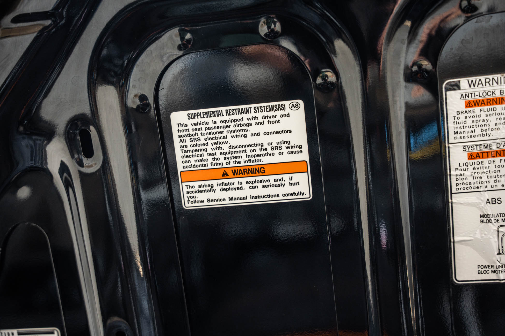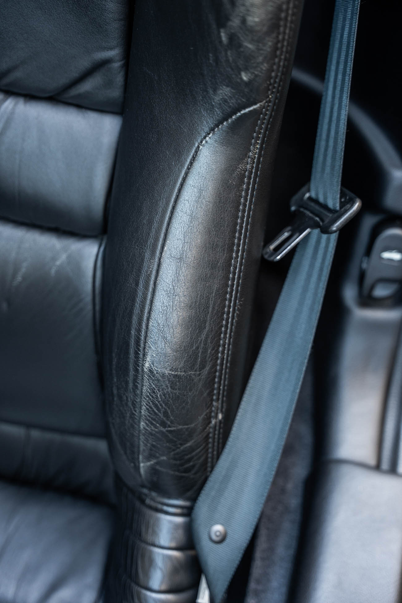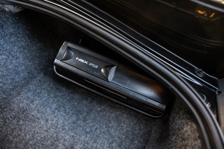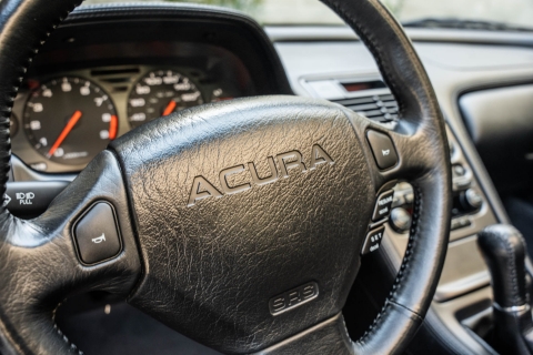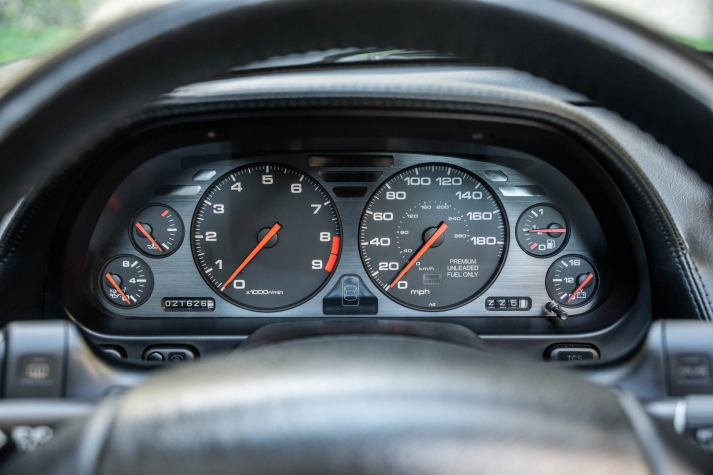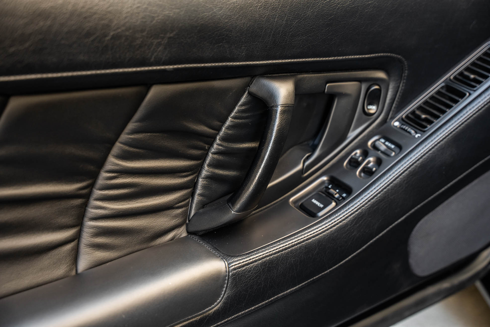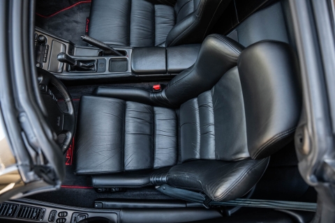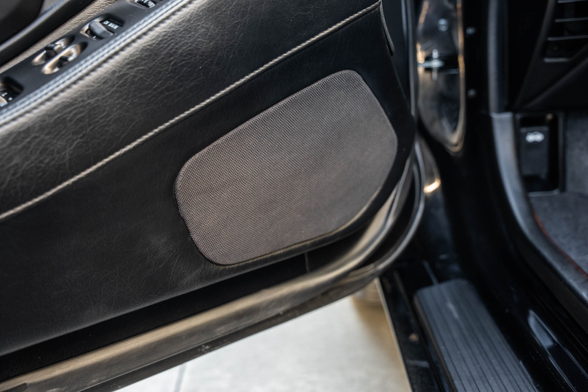 The cabin features power-adjustable sport seats upholstered in black leather, while NSX-branded floor mats line the footwells. Interior appointments include automatic climate control, cruise control, a Bose sound system, and a cassette stereo linked to a six-disc CD changer. The stainless-steel door sill plates are stamped with the car’s serial number. The driver’s seat outer bolster is worn.