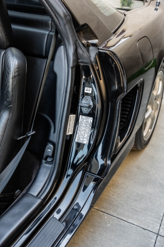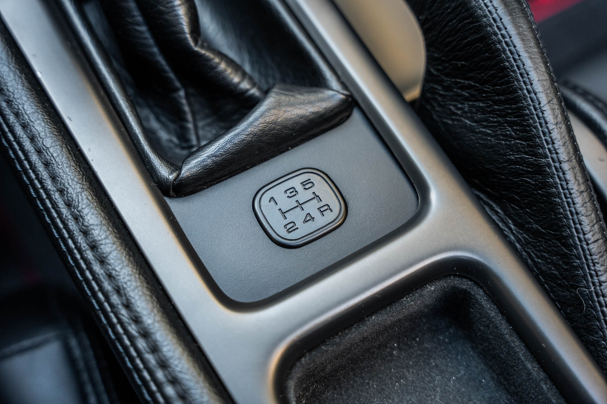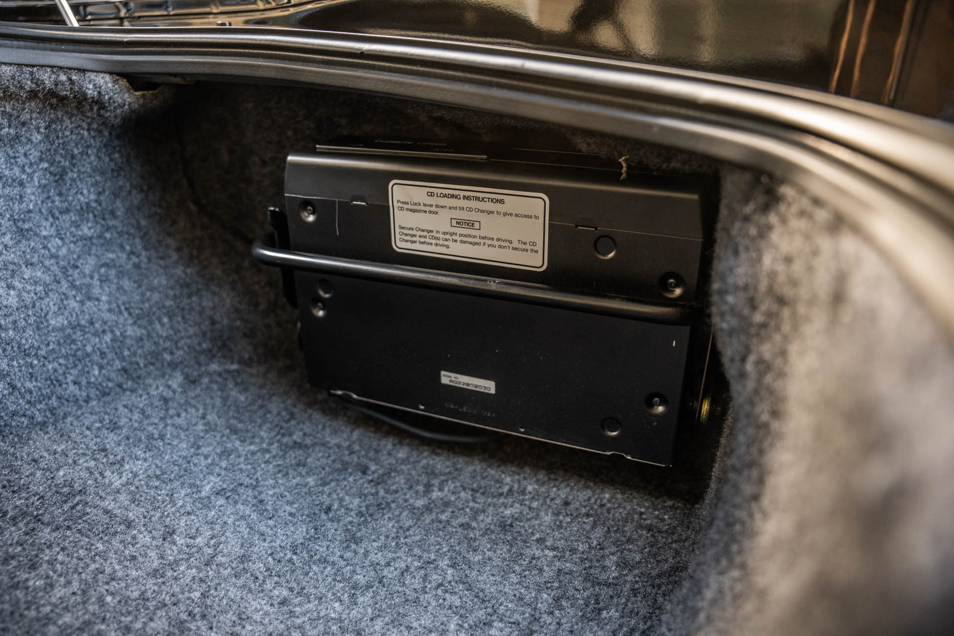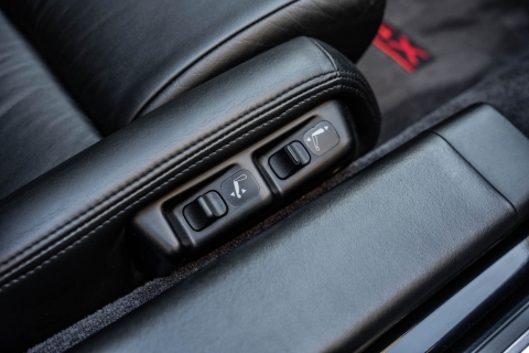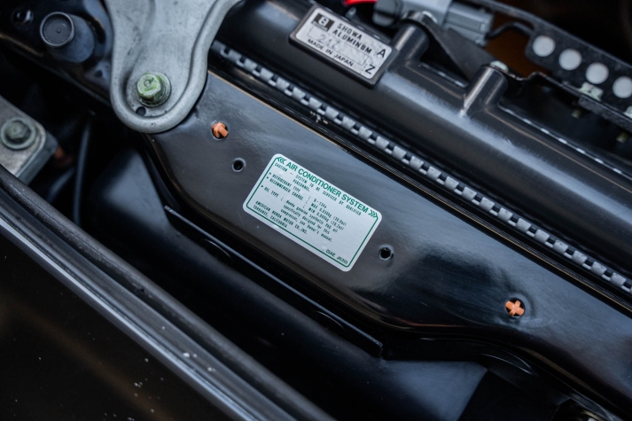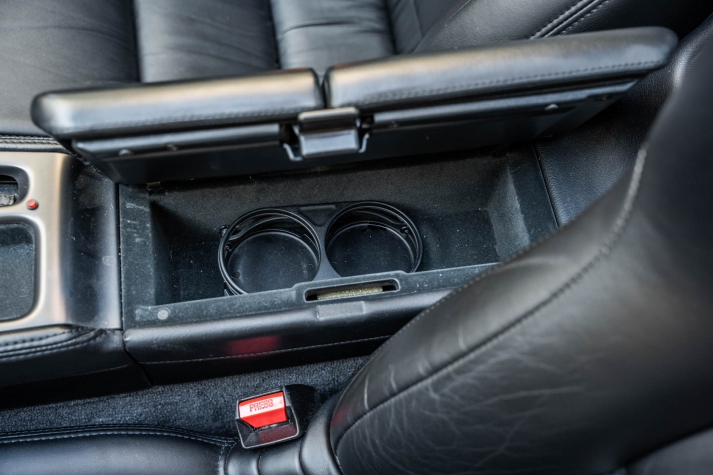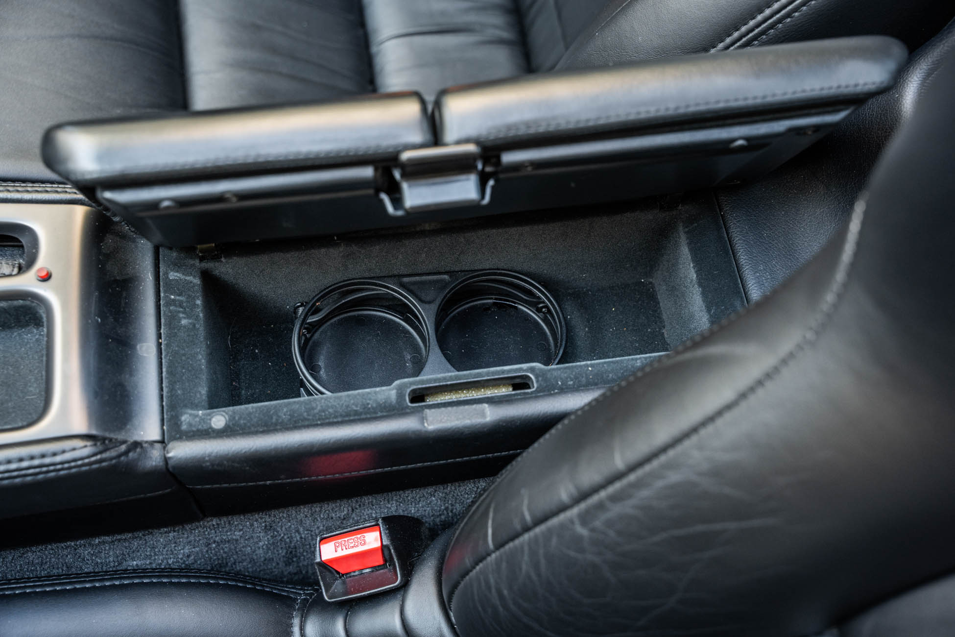 The cabin features power-adjustable sport seats upholstered in black leather, while NSX-branded floor mats line the footwells. Interior appointments include automatic climate control, cruise control, a Bose sound system, and a cassette stereo linked to a six-disc CD changer. The stainless-steel door sill plates are stamped with the car’s serial number. The driver’s seat outer bolster is worn.
