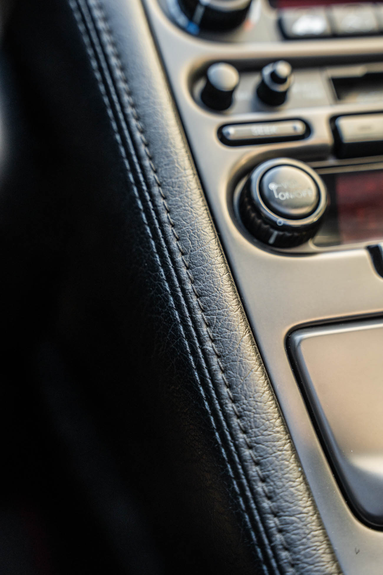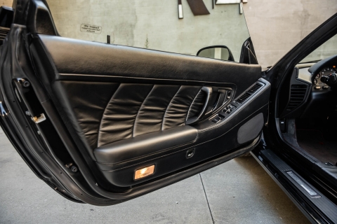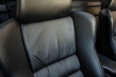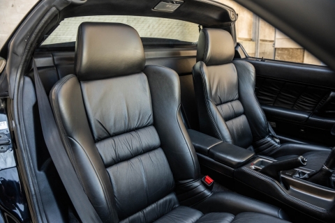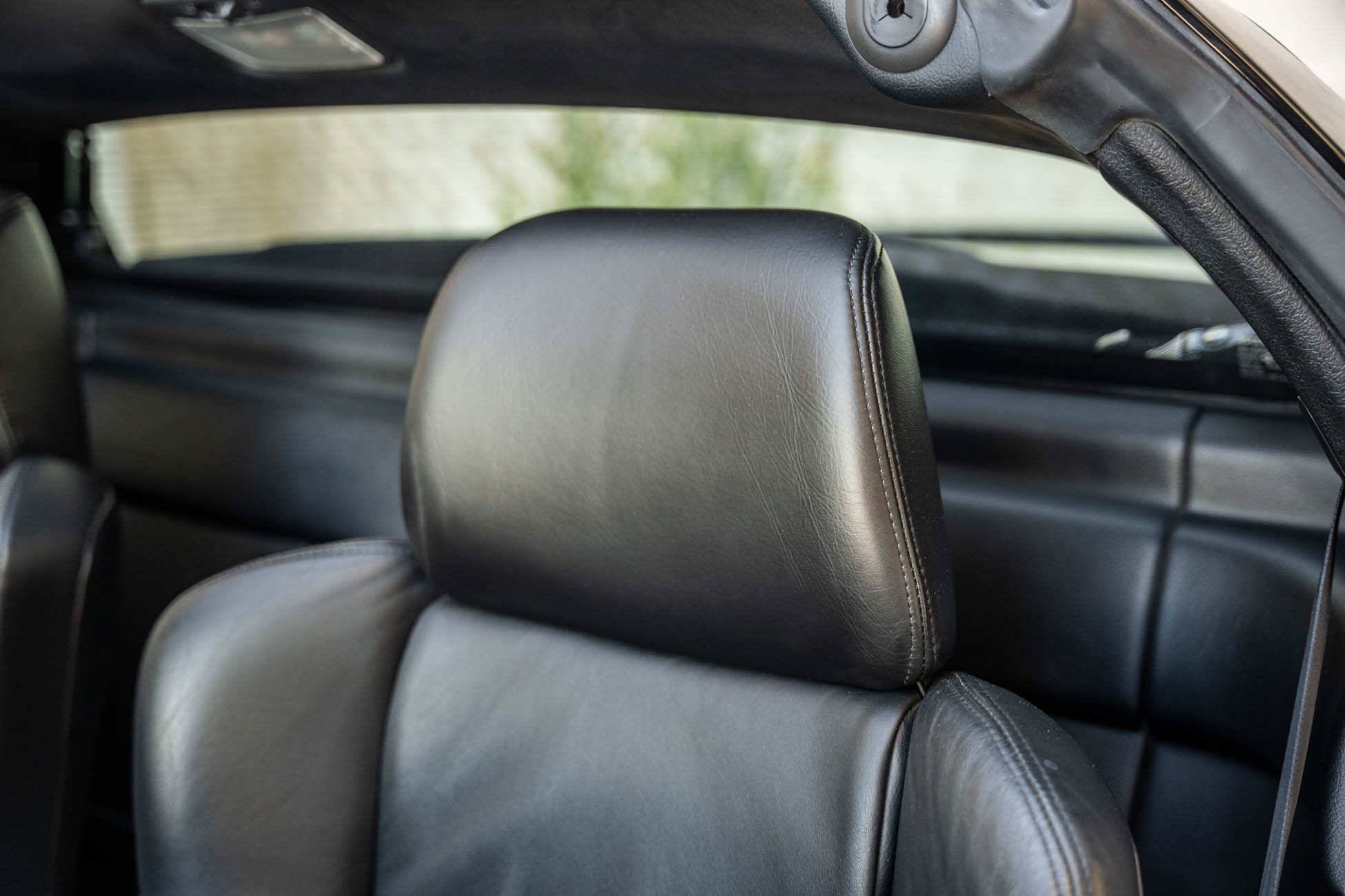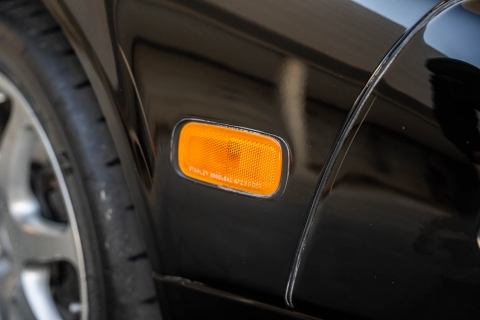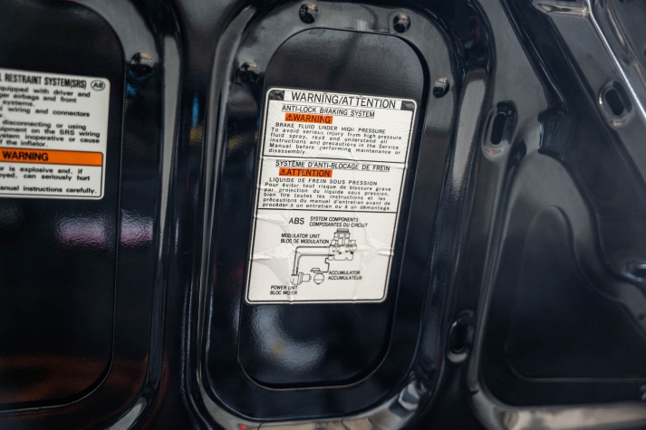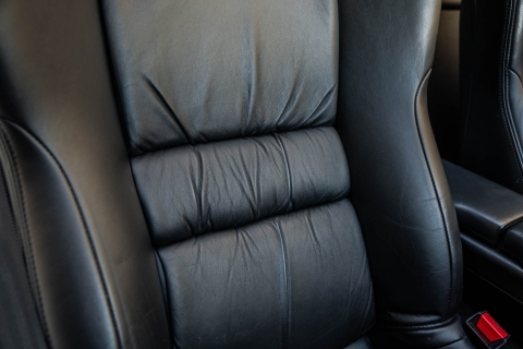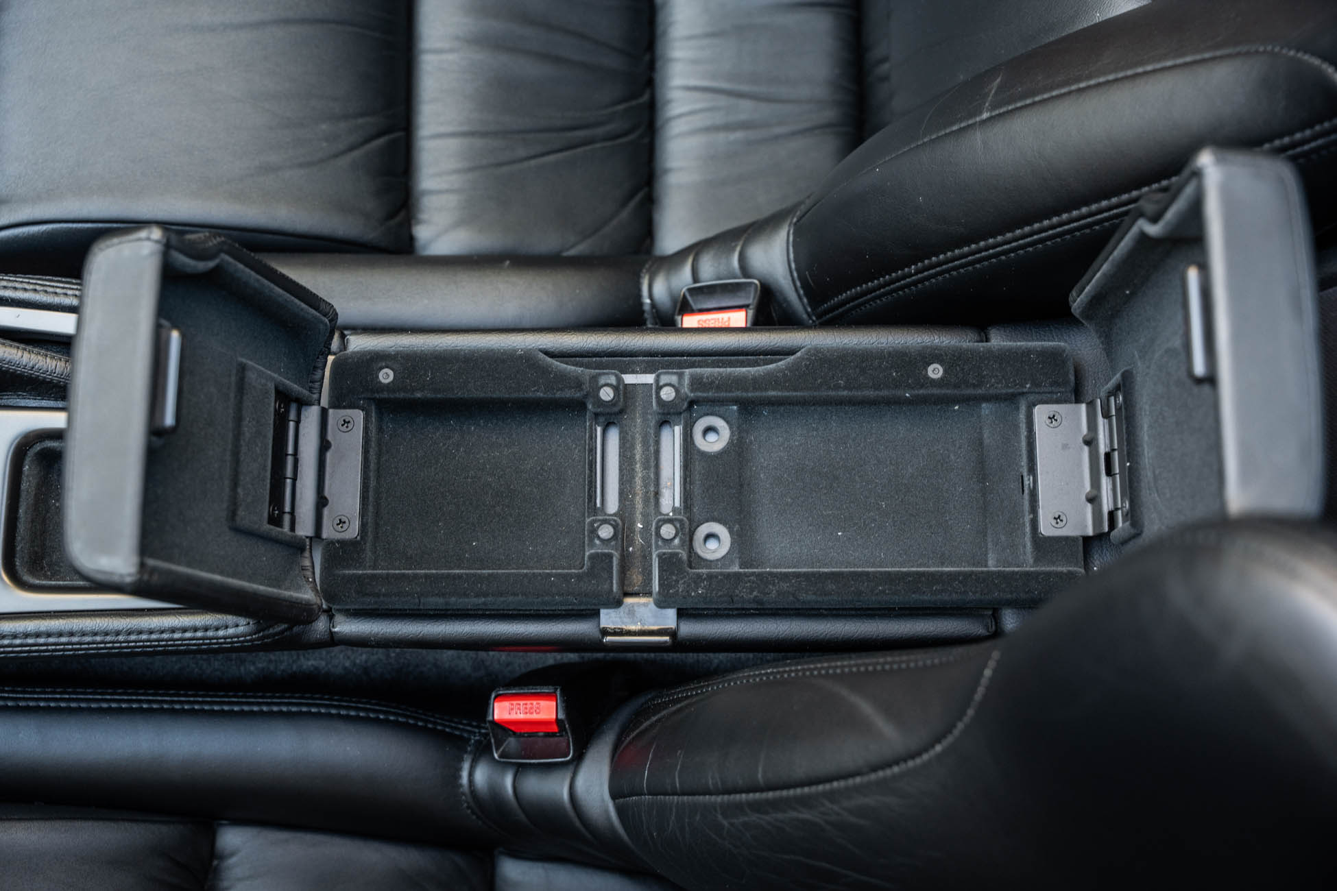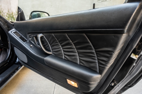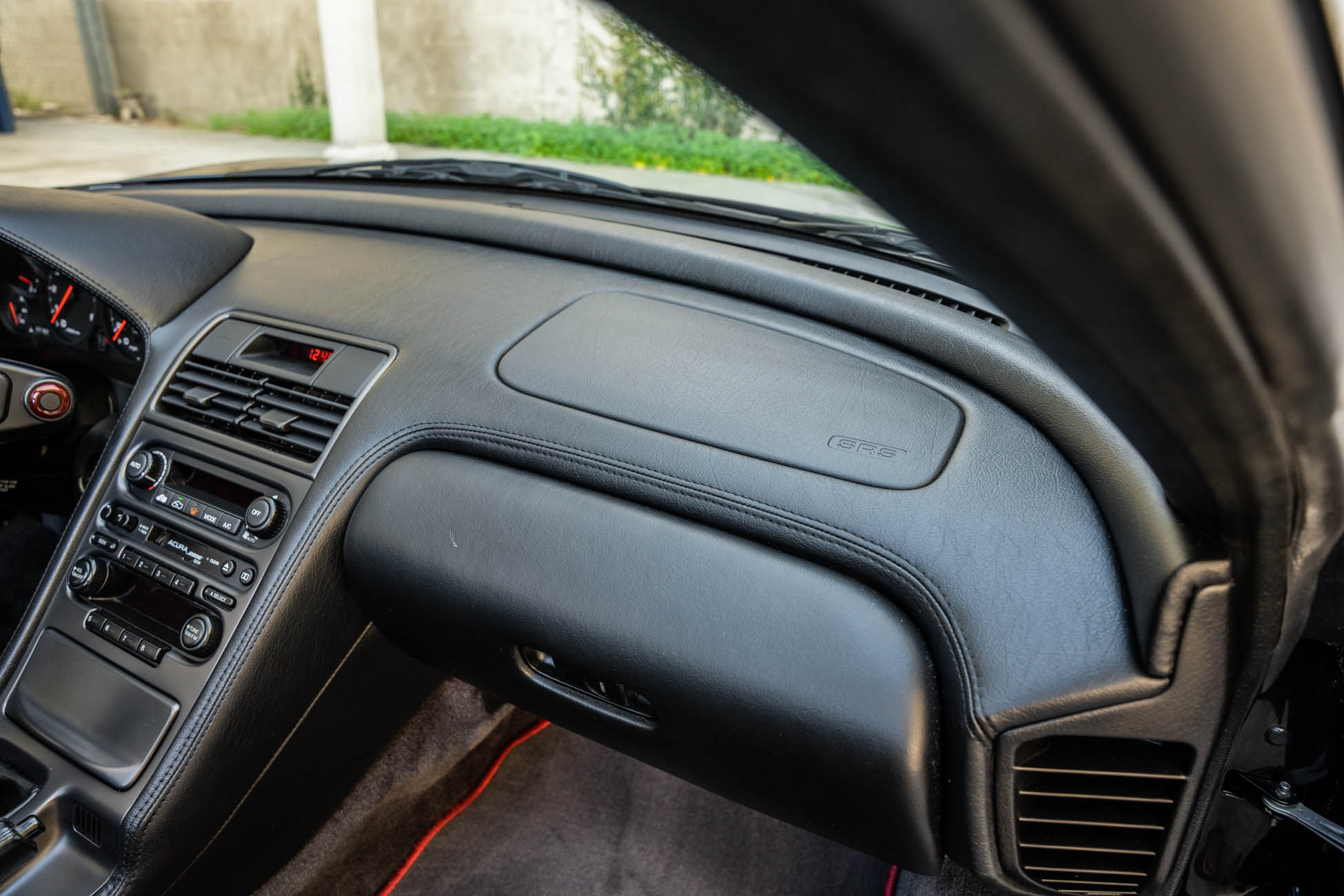 The cabin features power-adjustable sport seats upholstered in black leather, while NSX-branded floor mats line the footwells. Interior appointments include automatic climate control, cruise control, a Bose sound system, and a cassette stereo linked to a six-disc CD changer. The stainless-steel door sill plates are stamped with the car’s serial number. The driver’s seat outer bolster is worn.