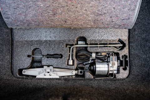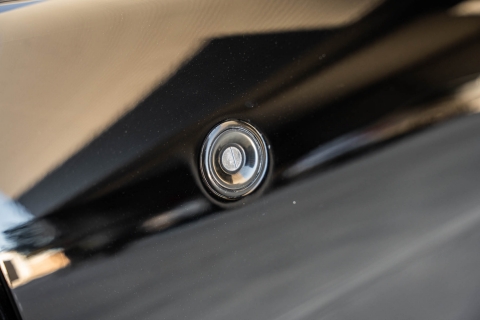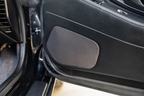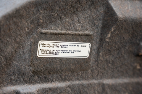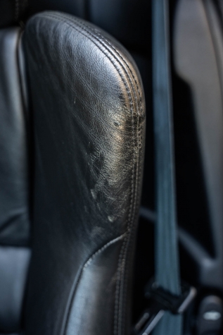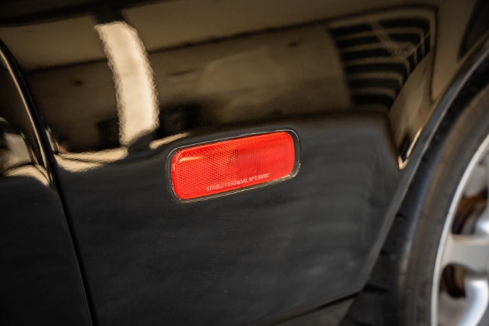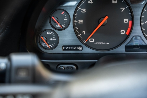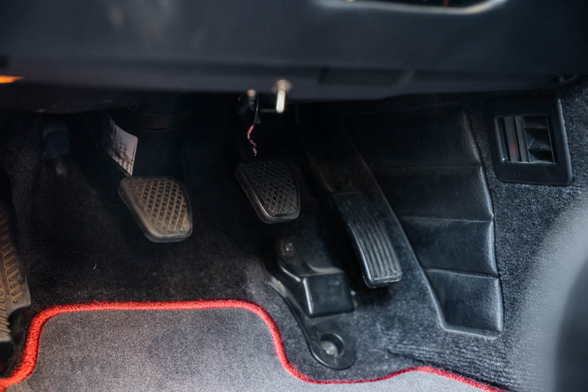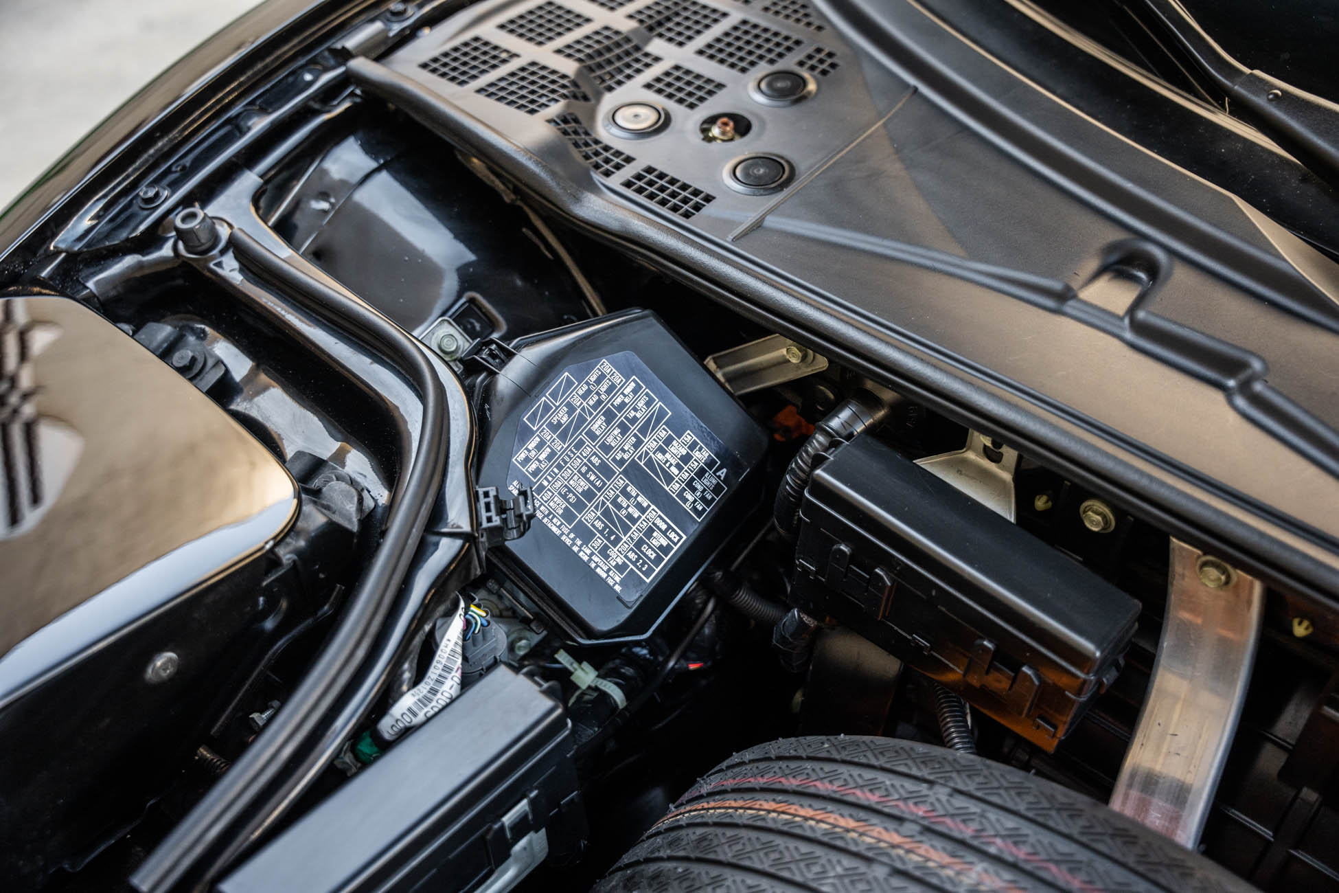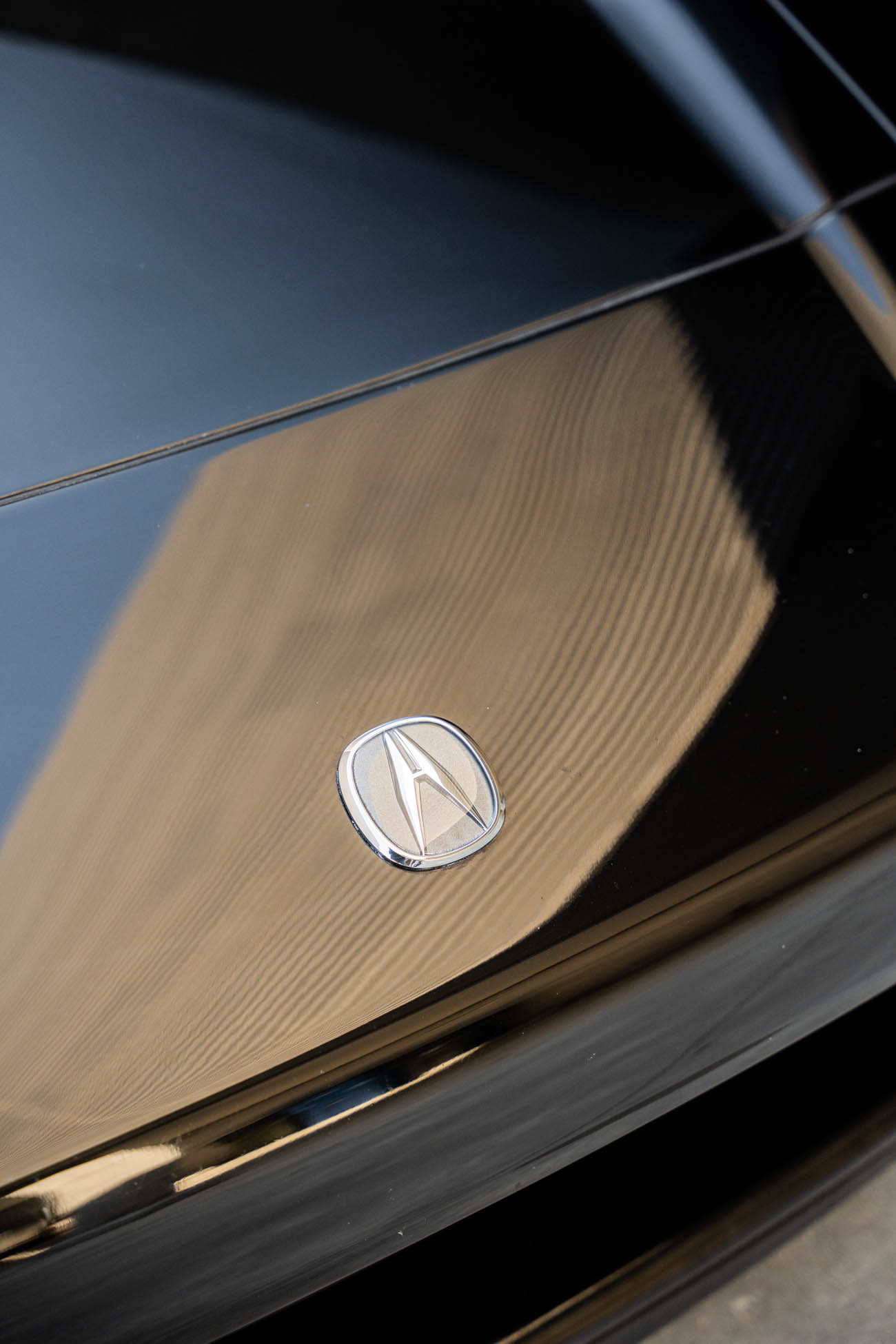 The cabin features power-adjustable sport seats upholstered in black leather, while NSX-branded floor mats line the footwells. Interior appointments include automatic climate control, cruise control, a Bose sound system, and a cassette stereo linked to a six-disc CD changer. The stainless-steel door sill plates are stamped with the car’s serial number. The driver’s seat outer bolster is worn.