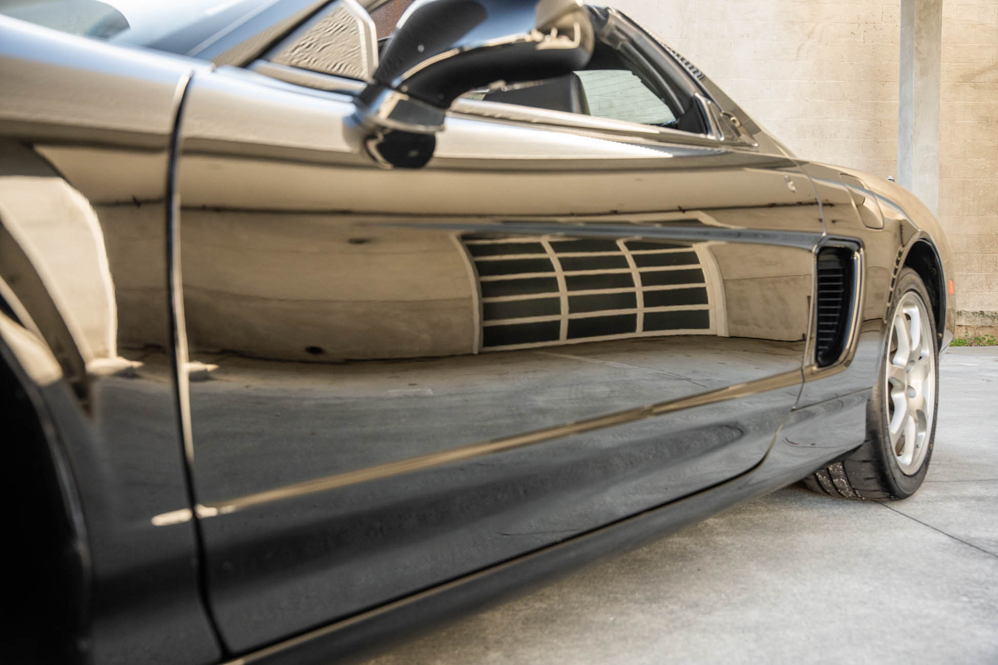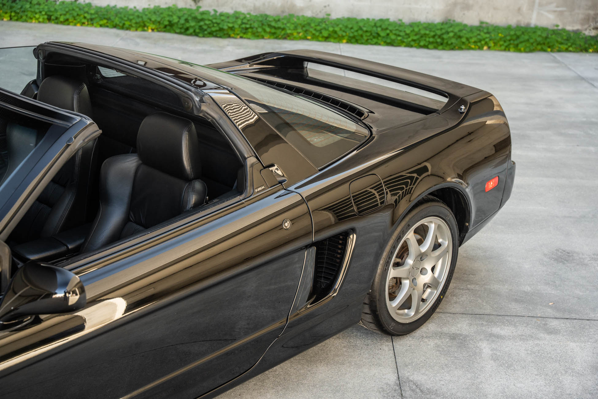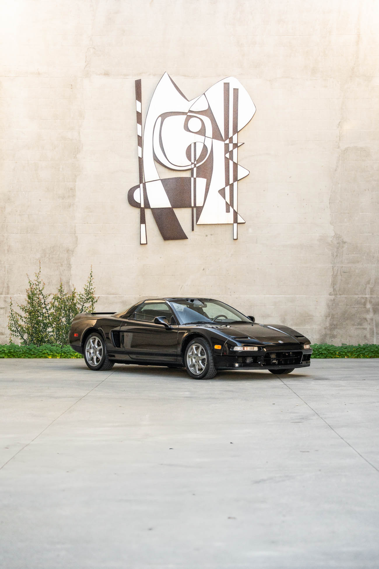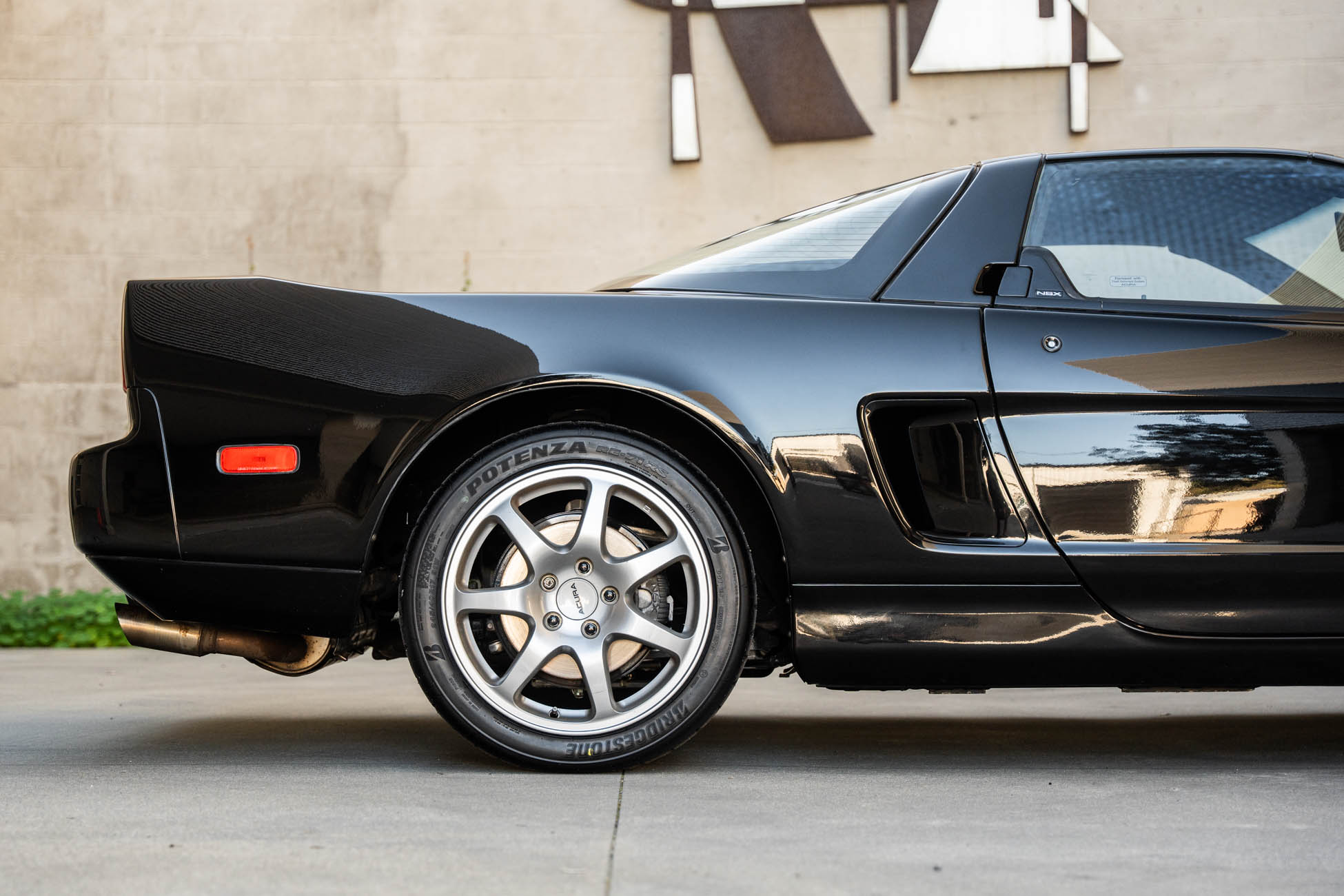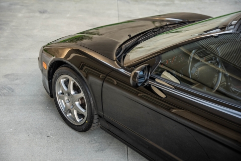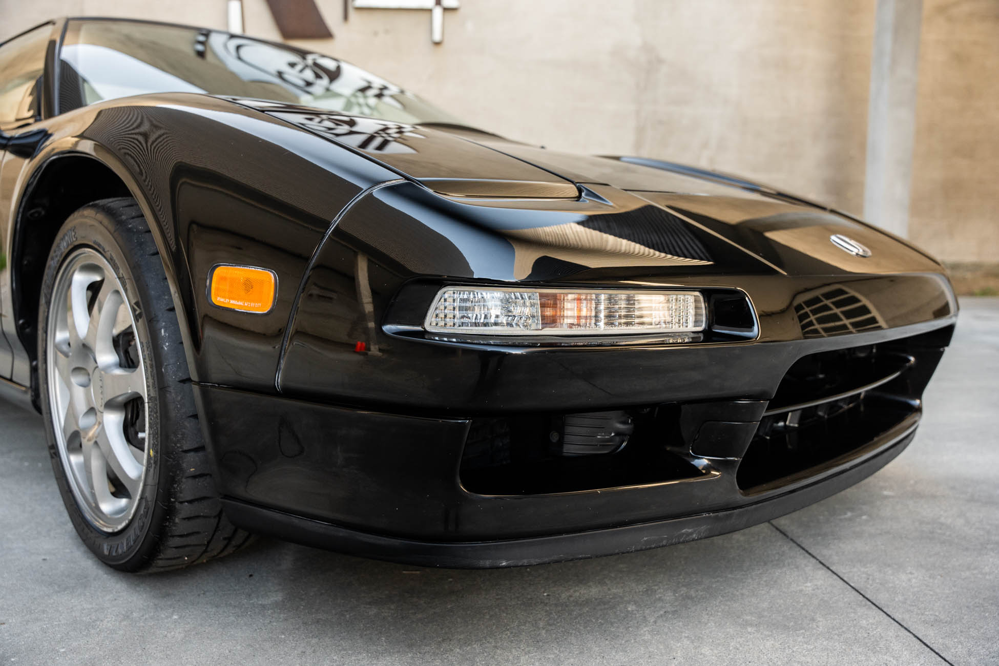 The NSX featured aluminum bodywork, and this example is finished in Berlina Black with a body-color removable roof panel. Exterior details include pop-up headlights, an integrated rear wing, side air intakes, power-adjustable side mirrors, and dual exhaust outlets. Paint meter readings are provided in the gallery.