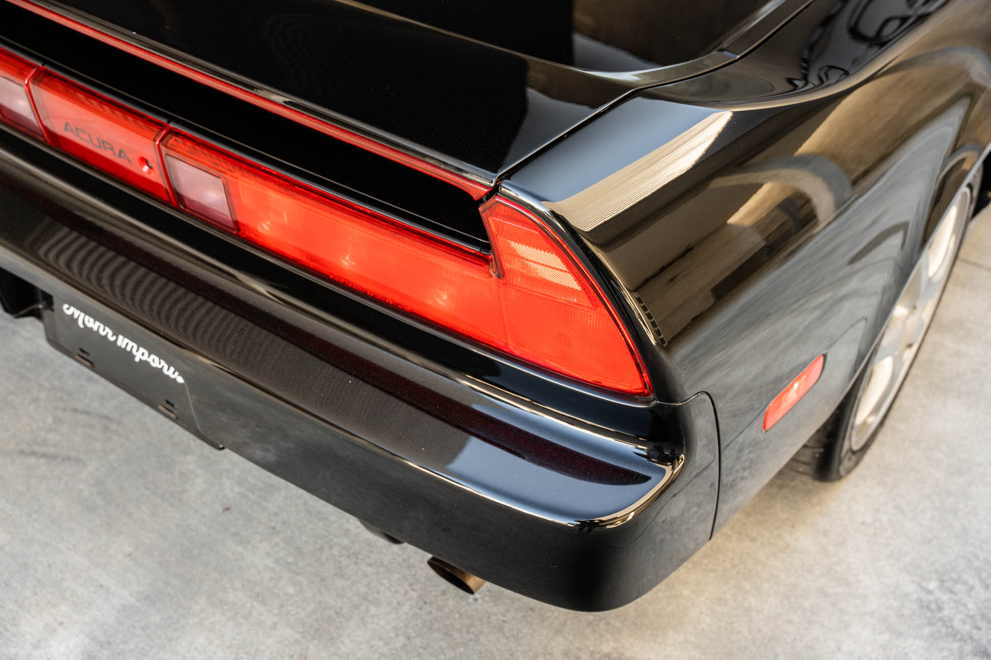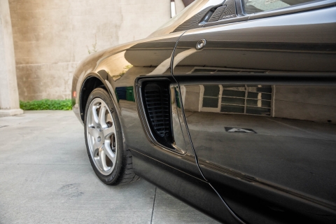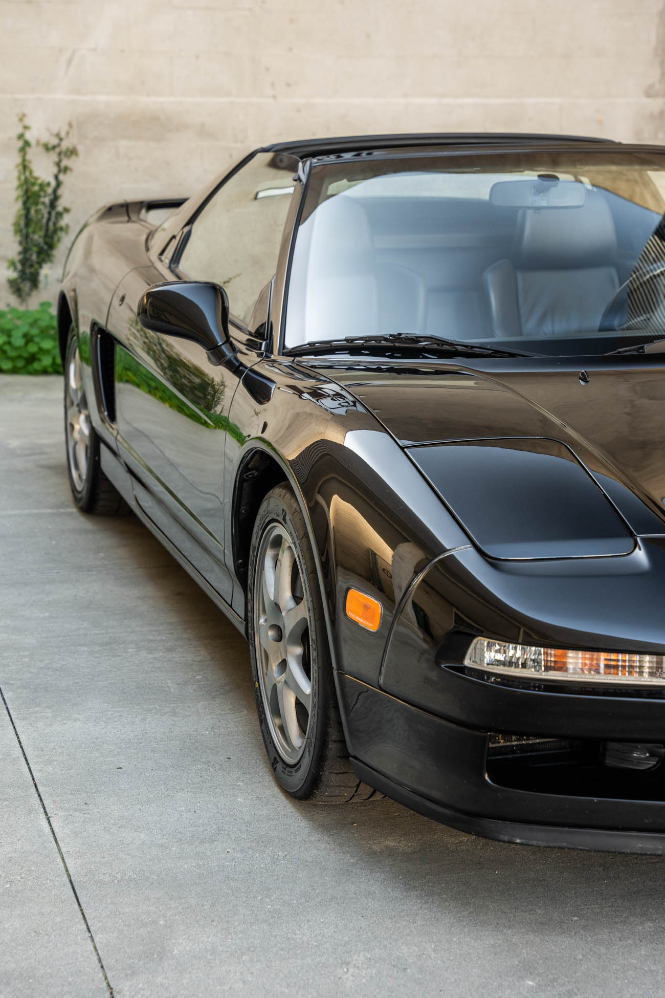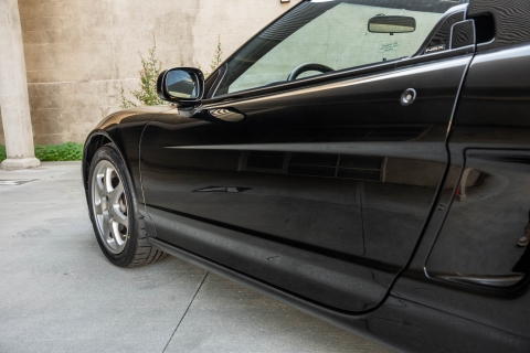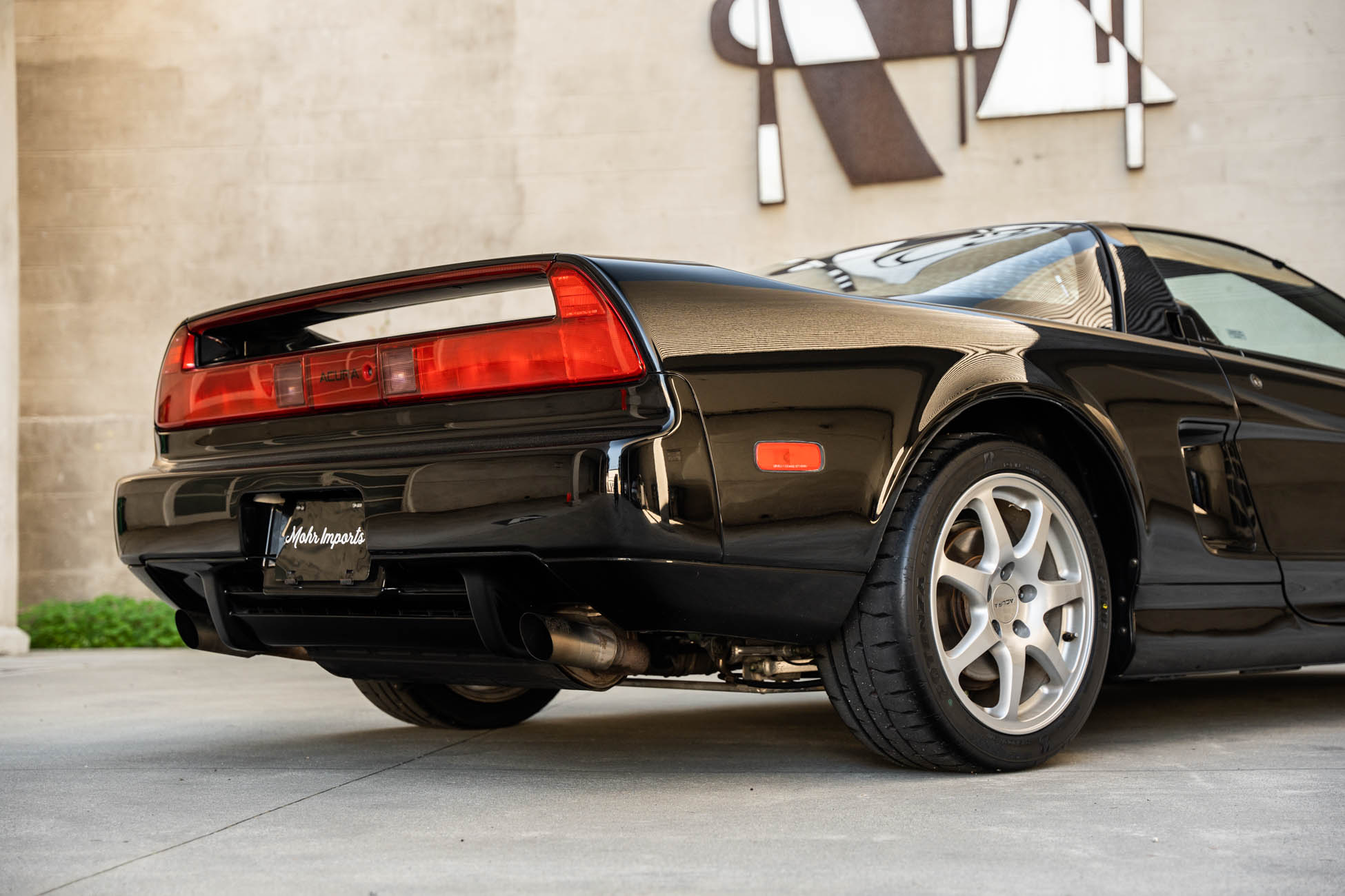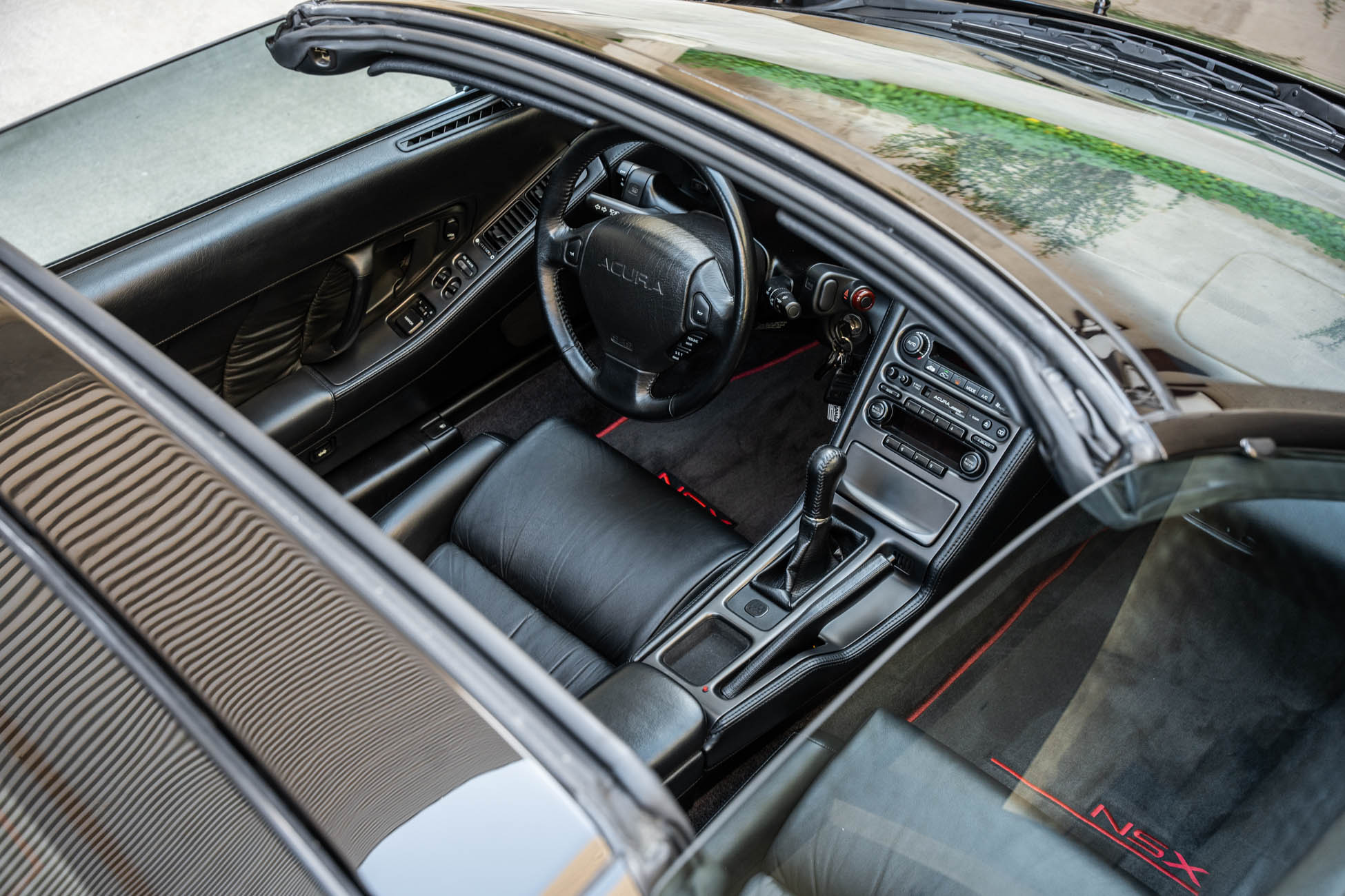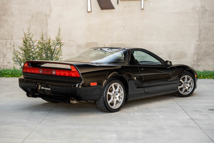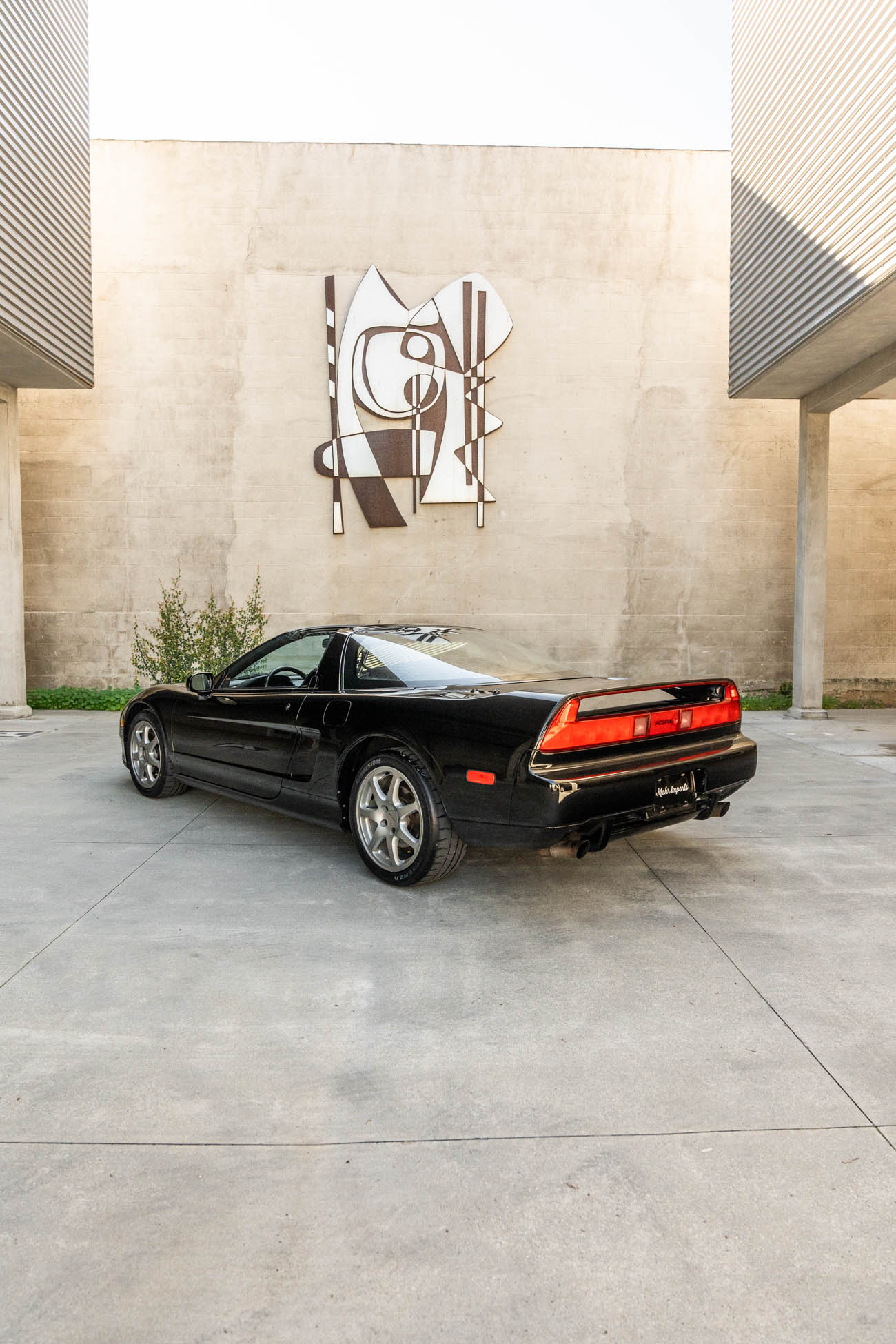 The NSX featured aluminum bodywork, and this example is finished in Berlina Black with a body-color removable roof panel. Exterior details include pop-up headlights, an integrated rear wing, side air intakes, power-adjustable side mirrors, and dual exhaust outlets. Paint meter readings are provided in the gallery.