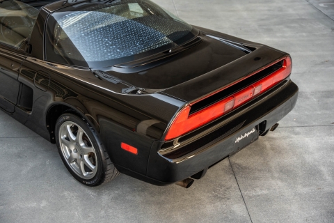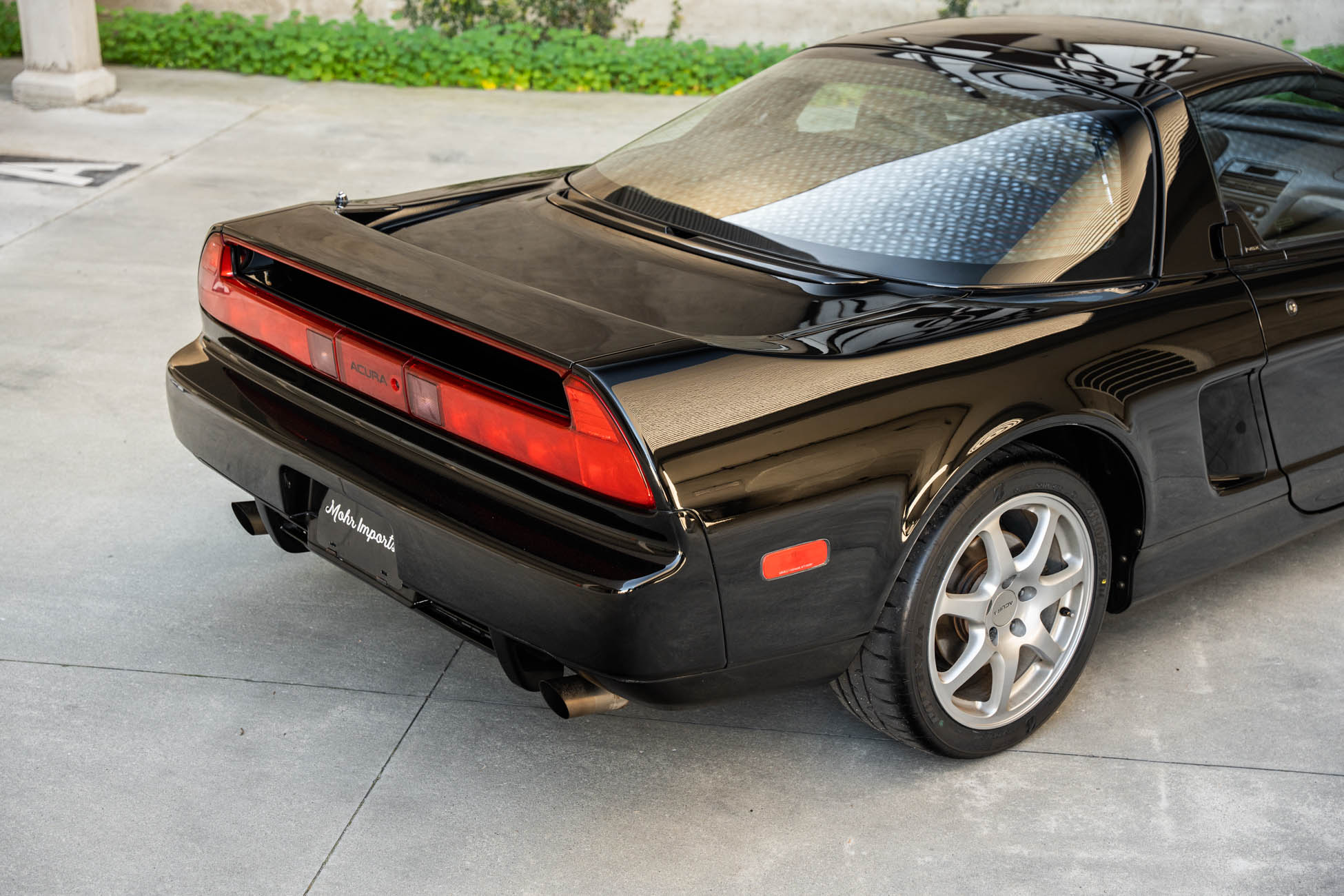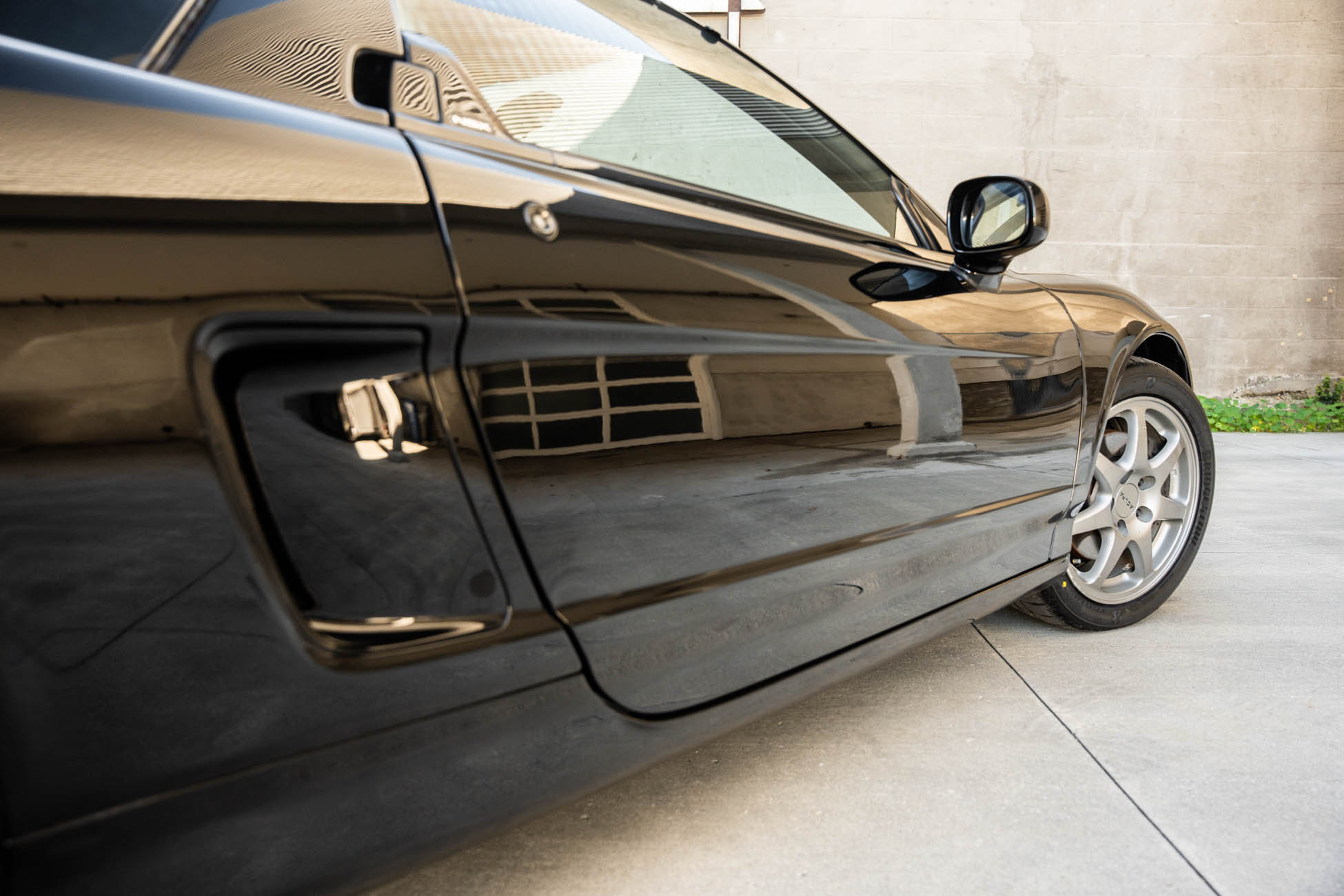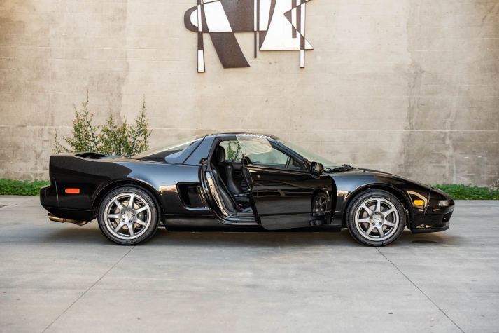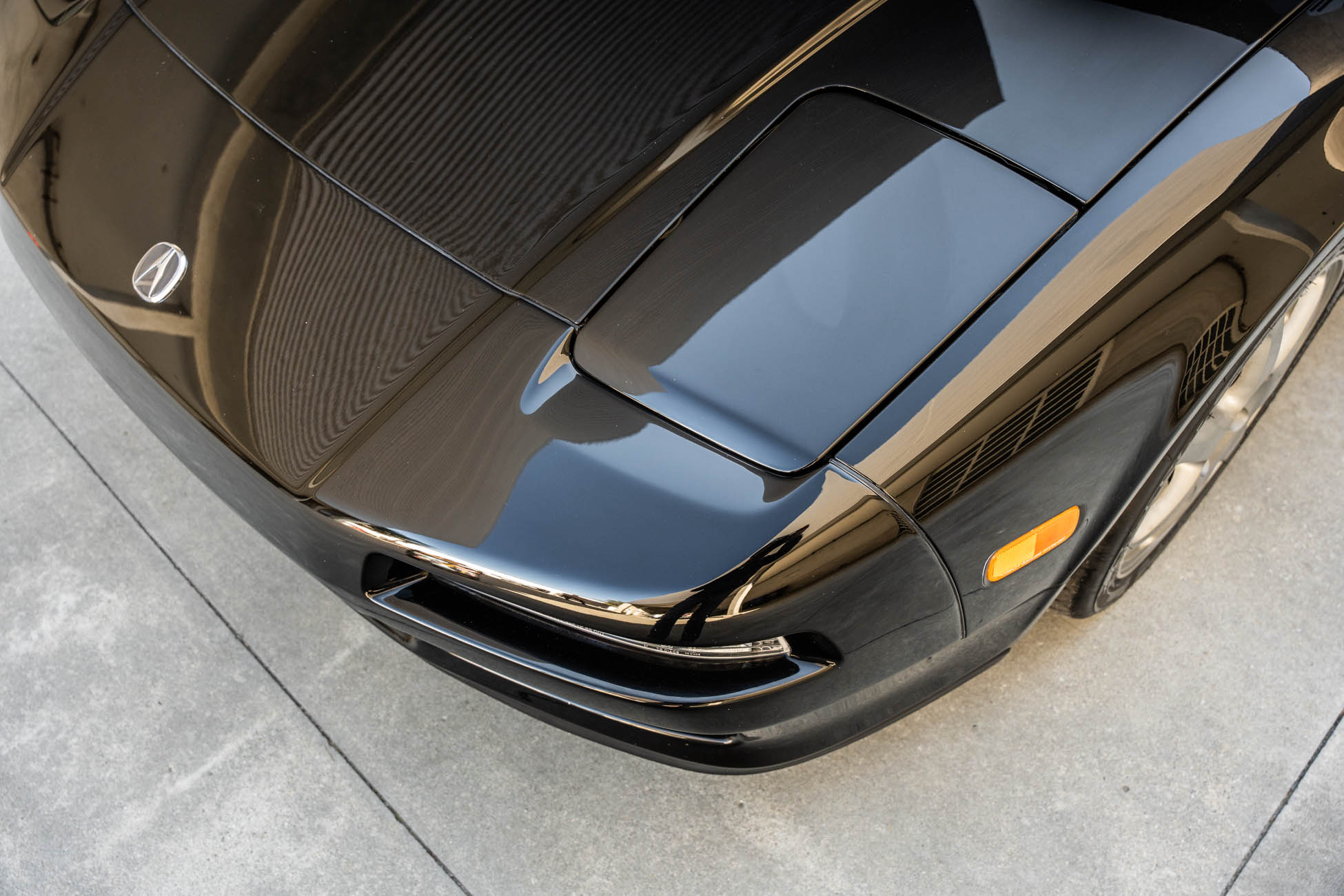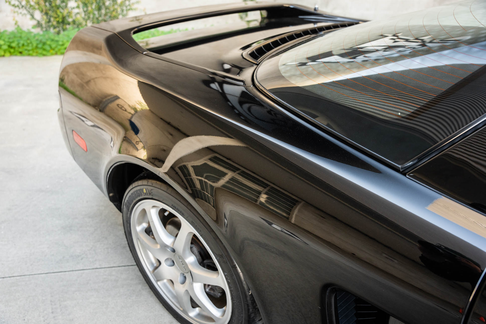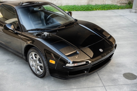 The NSX featured aluminum bodywork, and this example is finished in Berlina Black with a body-color removable roof panel. Exterior details include pop-up headlights, an integrated rear wing, side air intakes, power-adjustable side mirrors, and dual exhaust outlets. Paint meter readings are provided in the gallery.