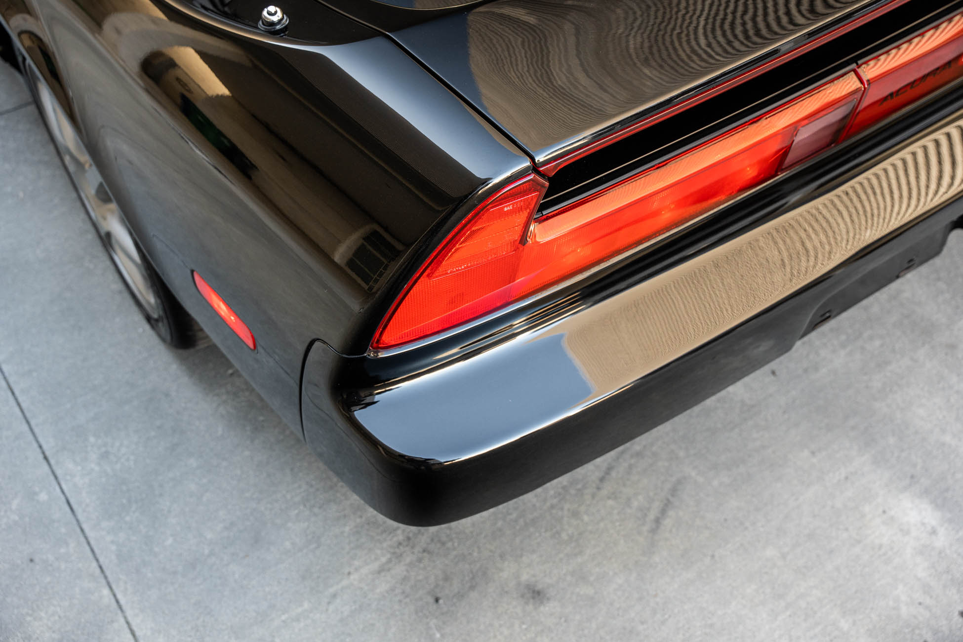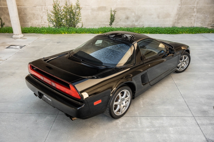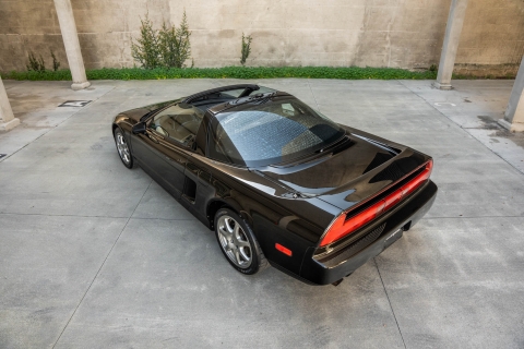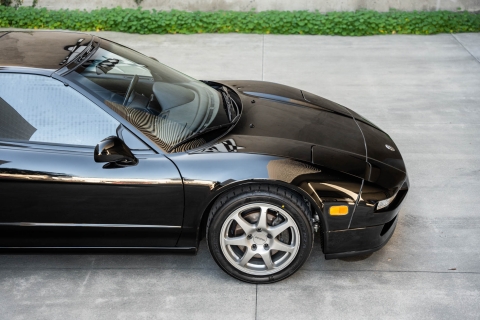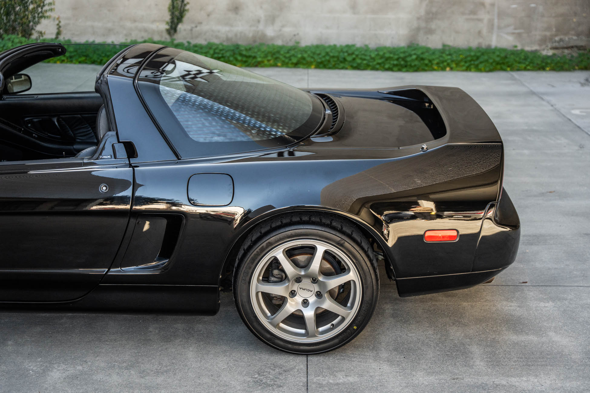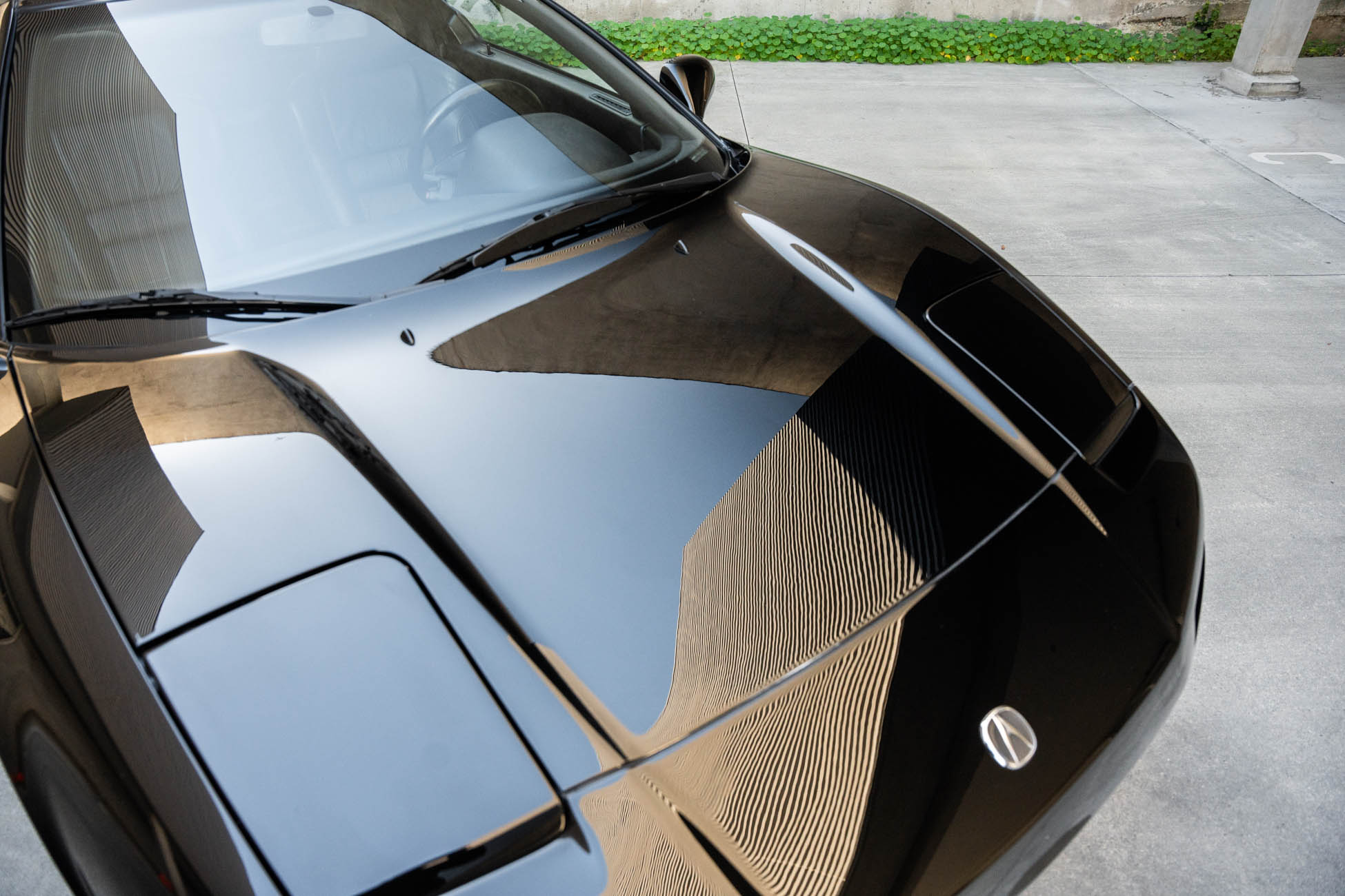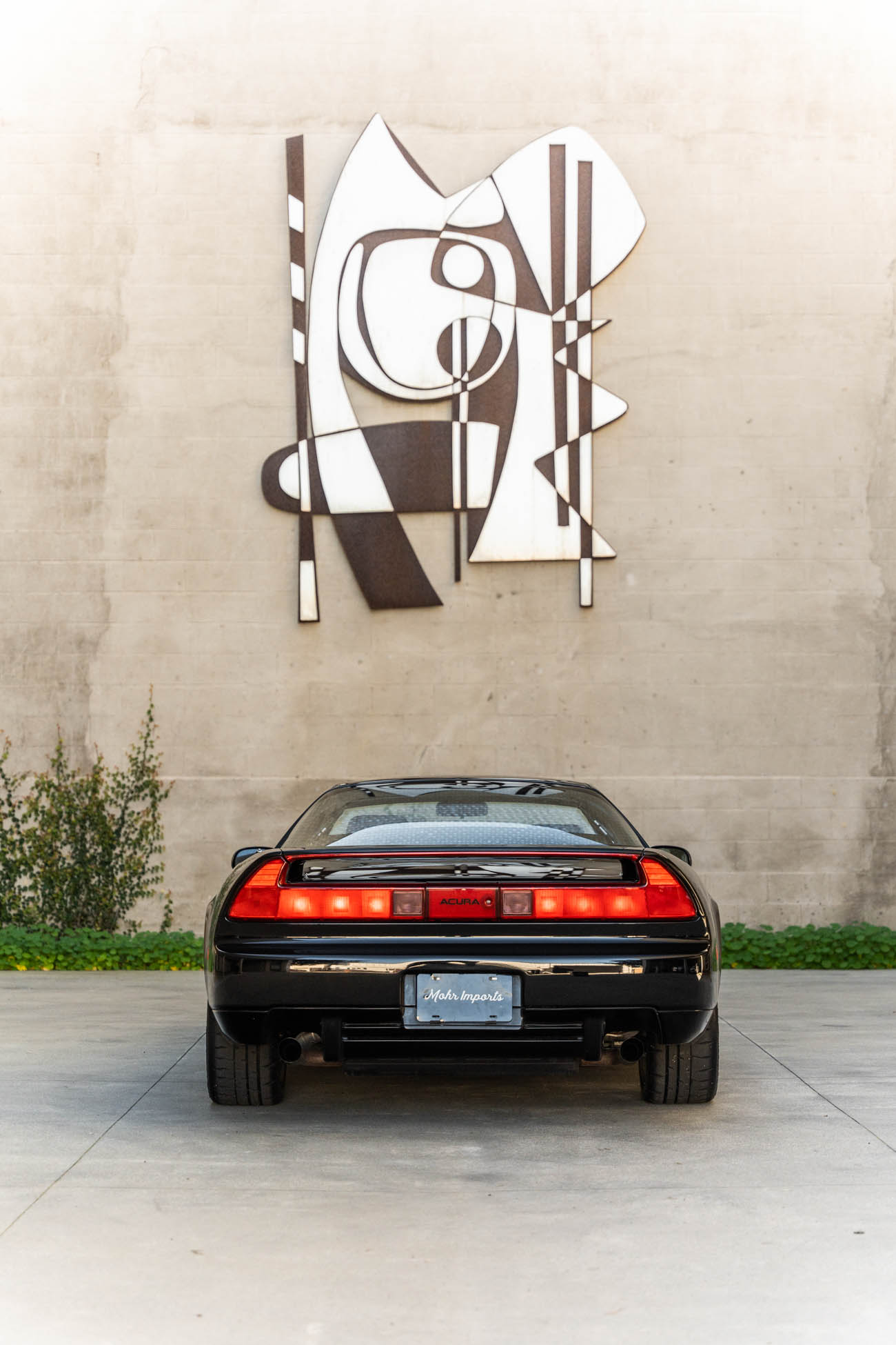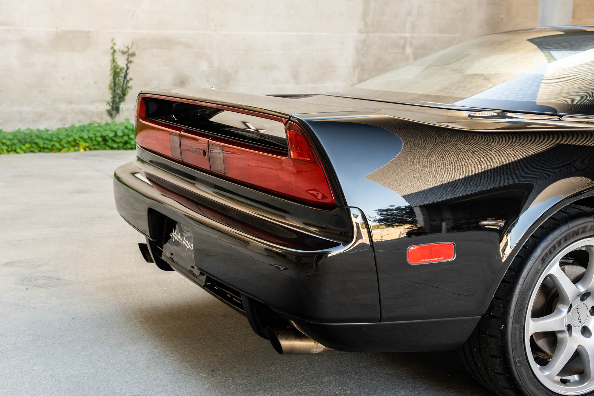 The NSX featured aluminum bodywork, and this example is finished in Berlina Black with a body-color removable roof panel. Exterior details include pop-up headlights, an integrated rear wing, side air intakes, power-adjustable side mirrors, and dual exhaust outlets. Paint meter readings are provided in the gallery.