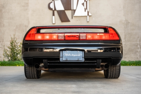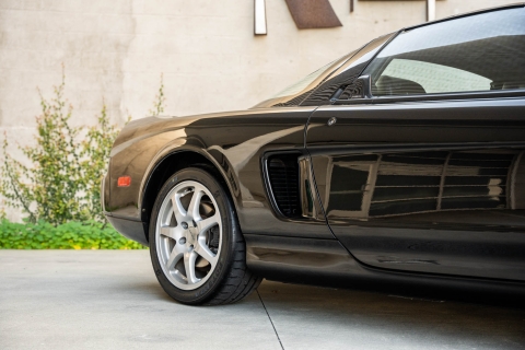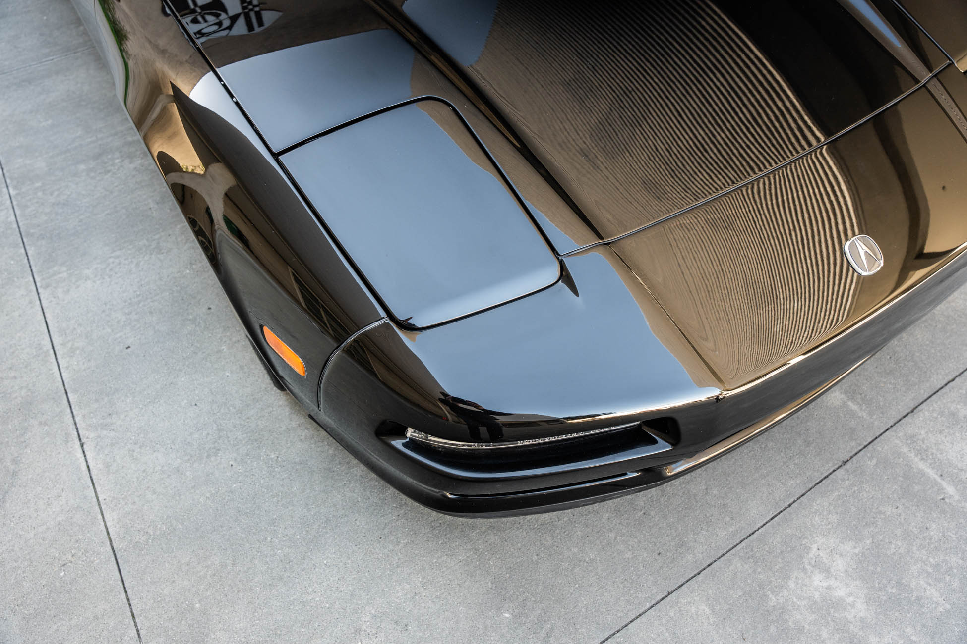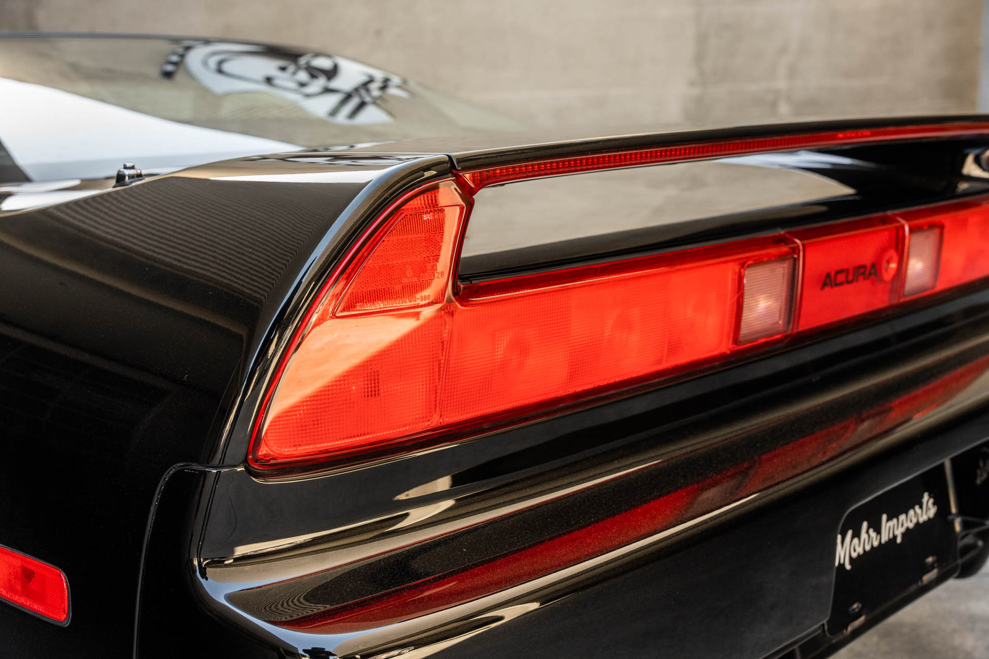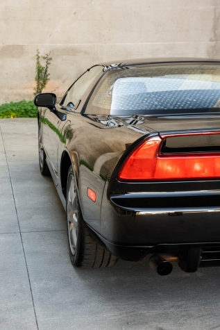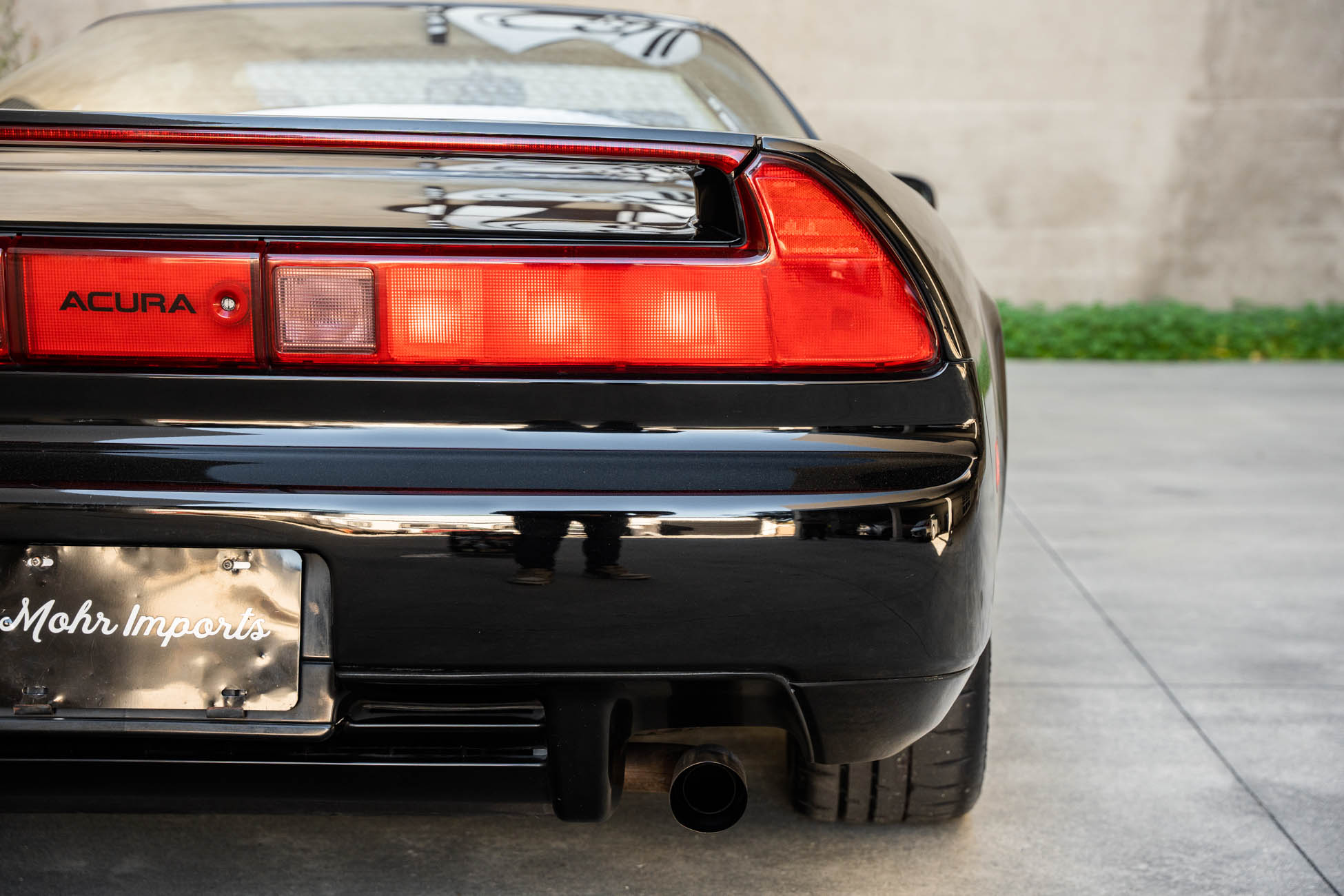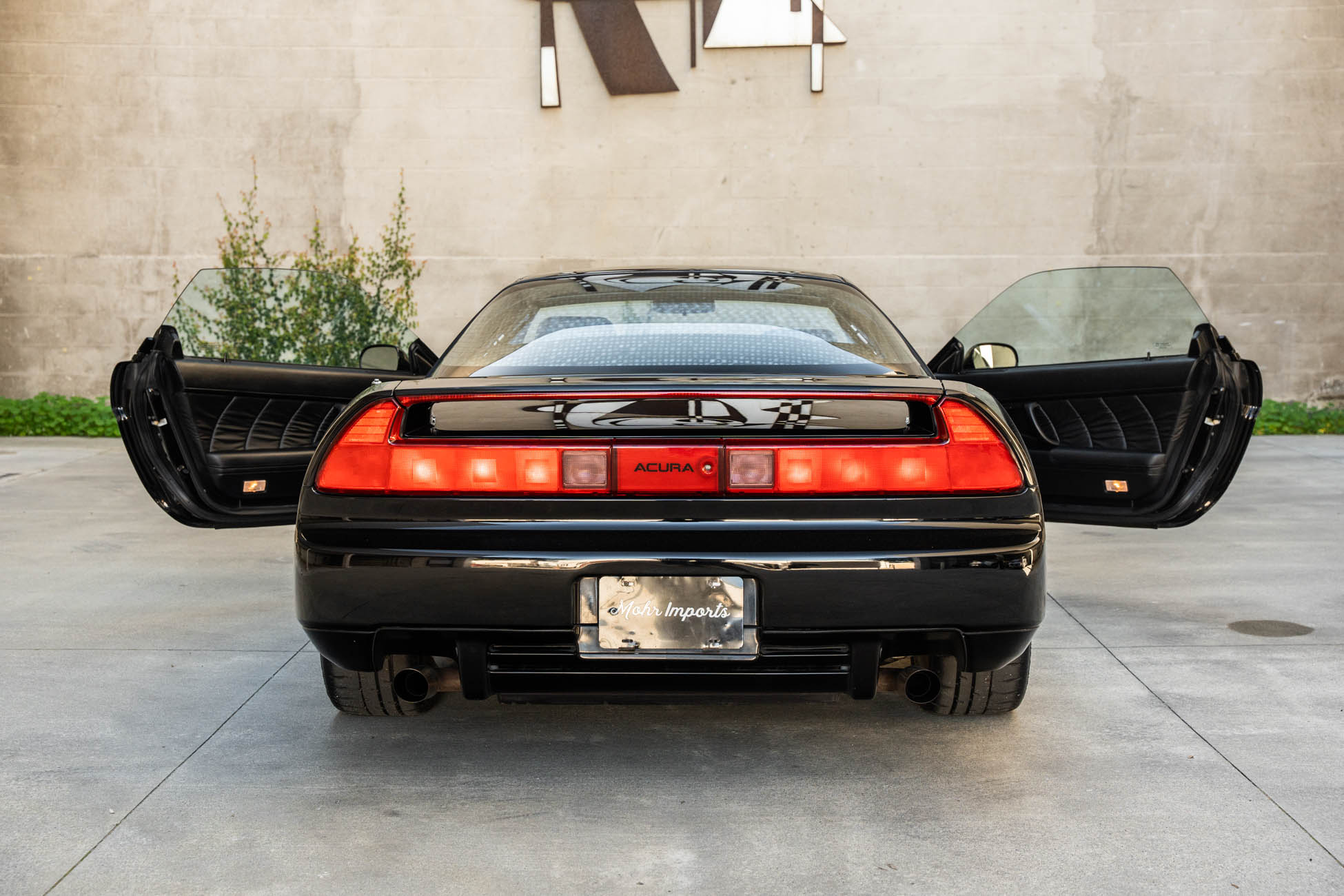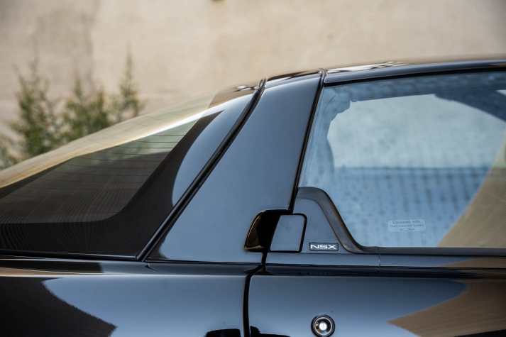 The NSX featured aluminum bodywork, and this example is finished in Berlina Black with a body-color removable roof panel. Exterior details include pop-up headlights, an integrated rear wing, side air intakes, power-adjustable side mirrors, and dual exhaust outlets. Paint meter readings are provided in the gallery.