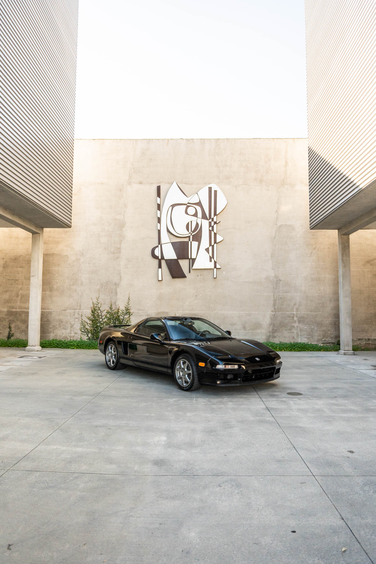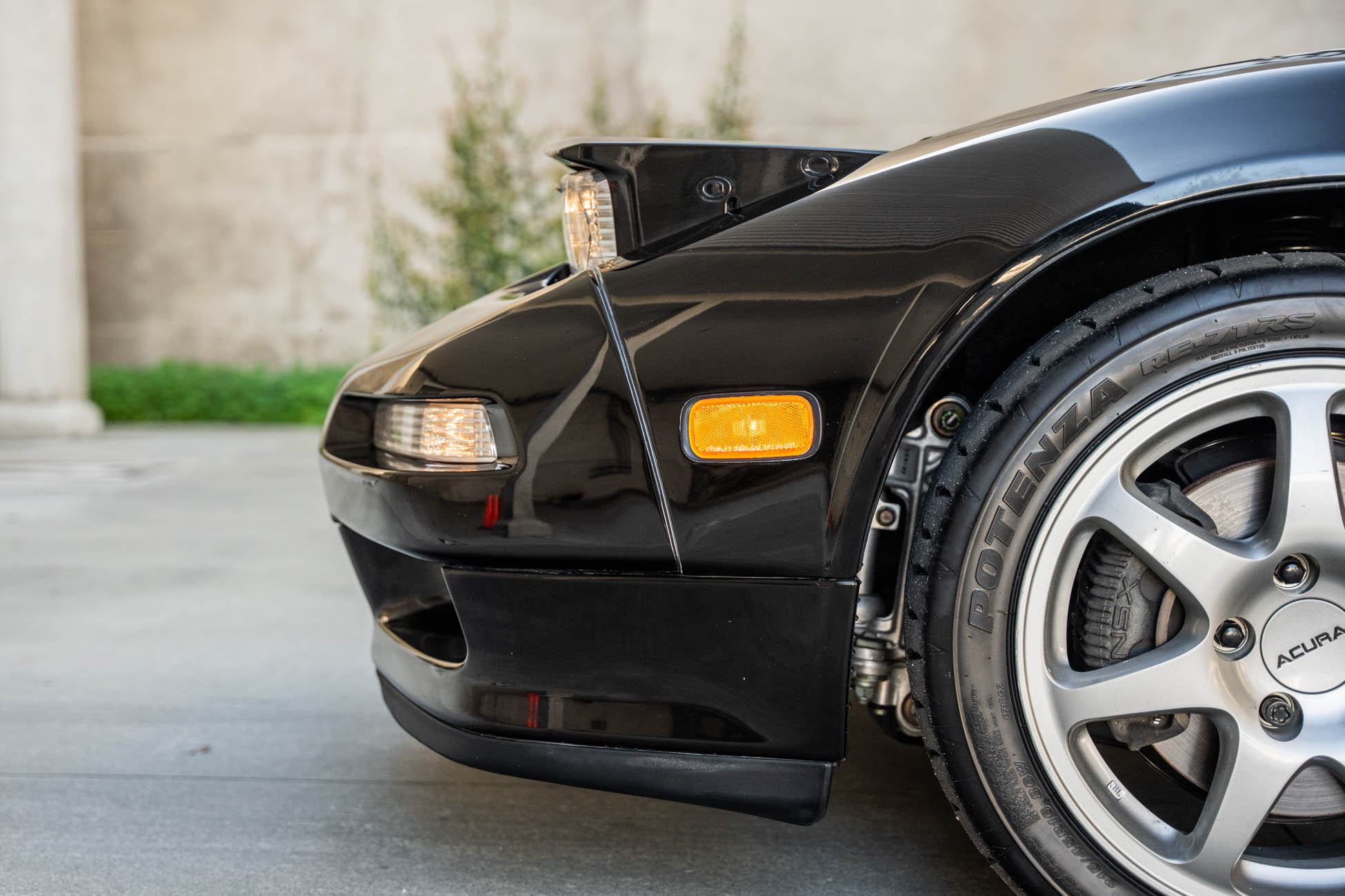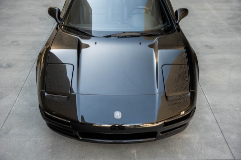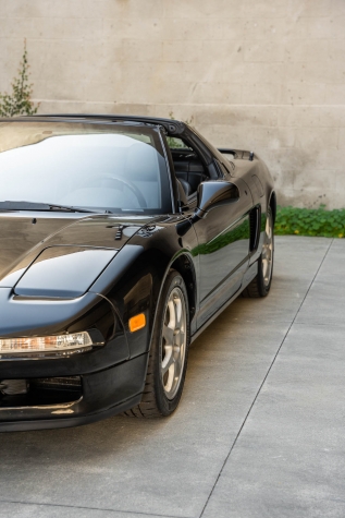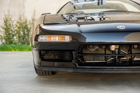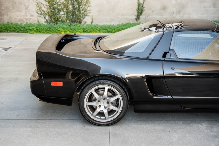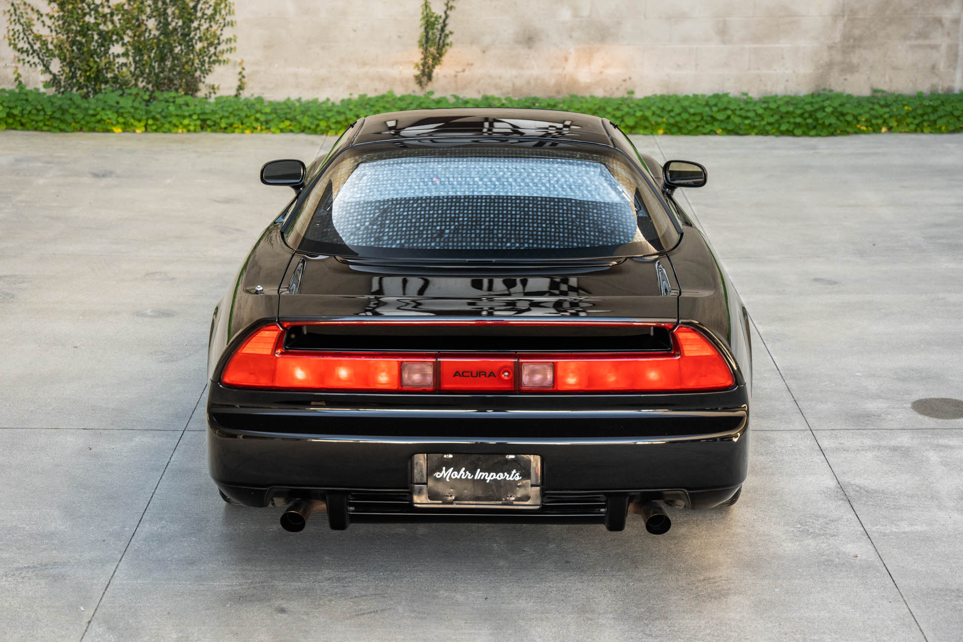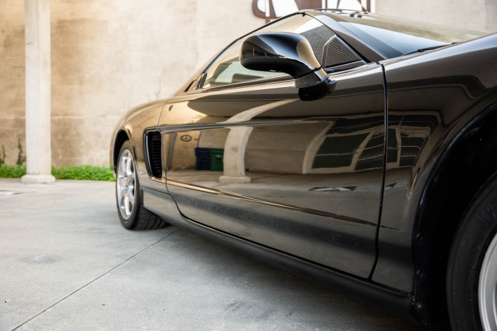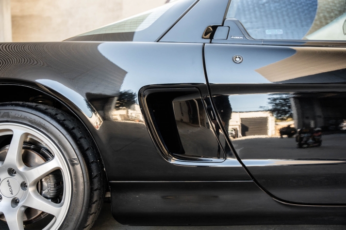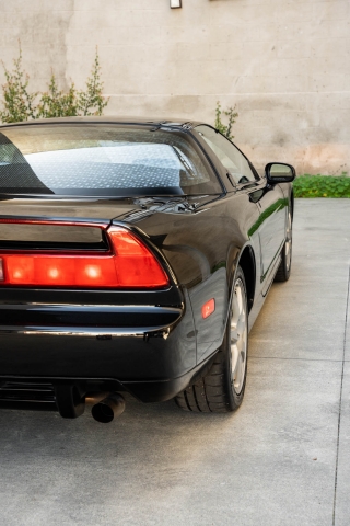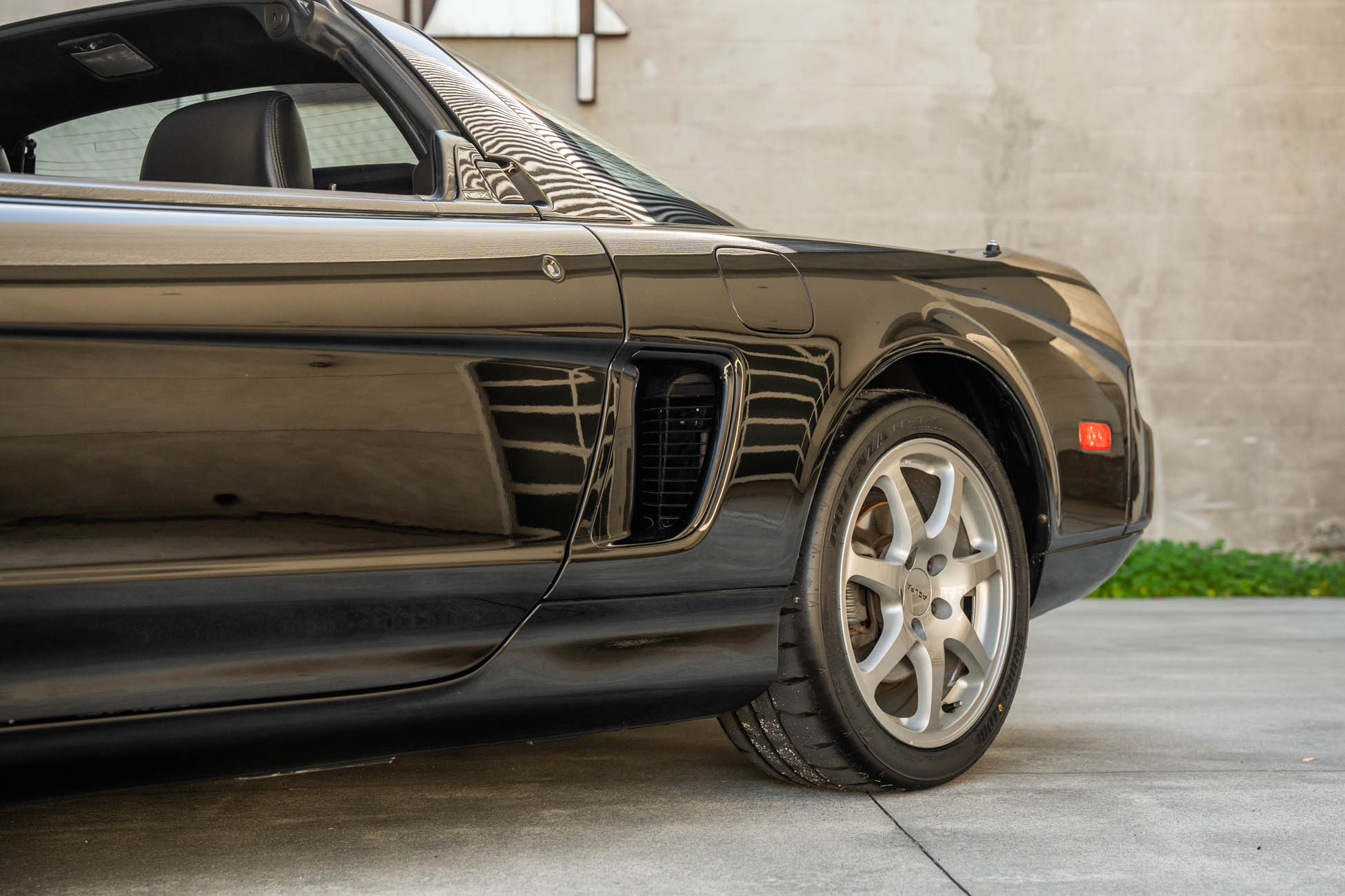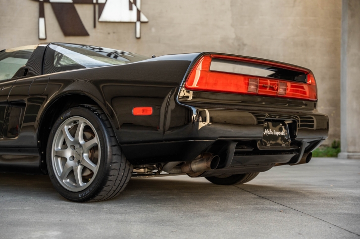 The NSX featured aluminum bodywork, and this example is finished in Berlina Black with a body-color removable roof panel. Exterior details include pop-up headlights, an integrated rear wing, side air intakes, power-adjustable side mirrors, and dual exhaust outlets. Paint meter readings are provided in the gallery.