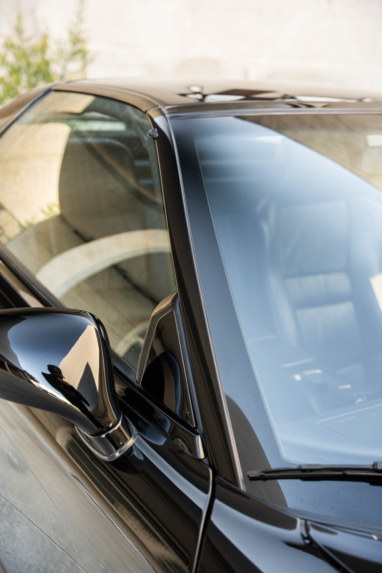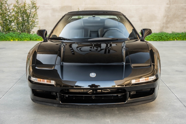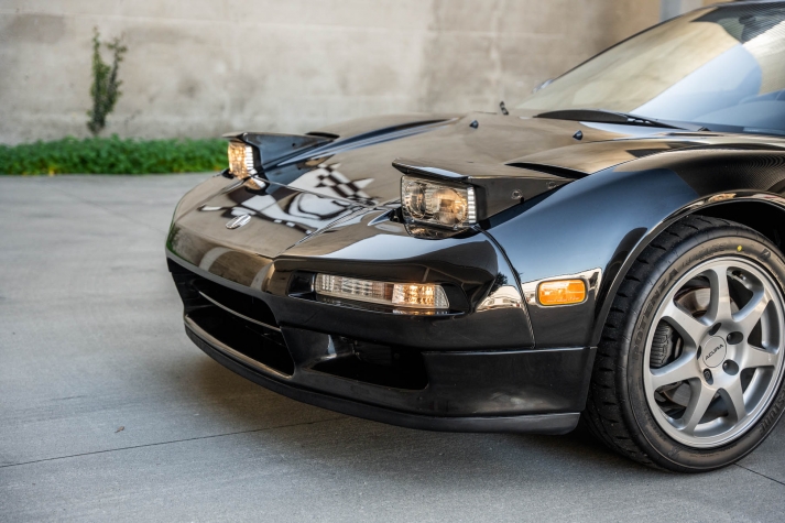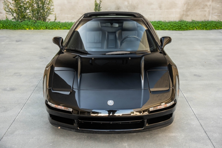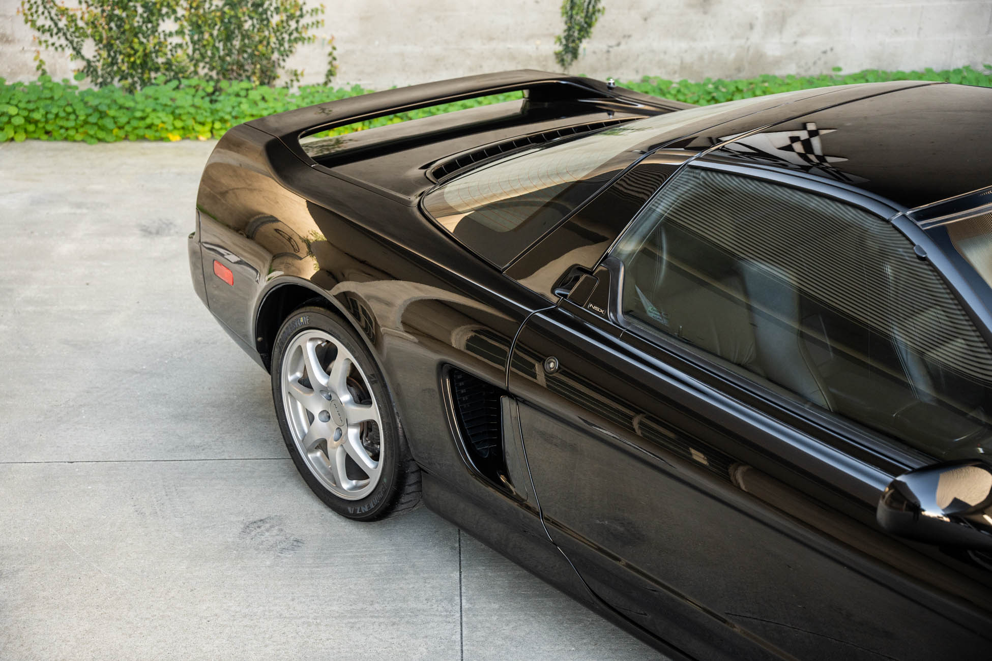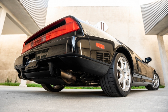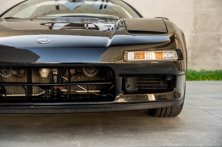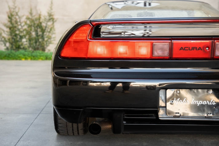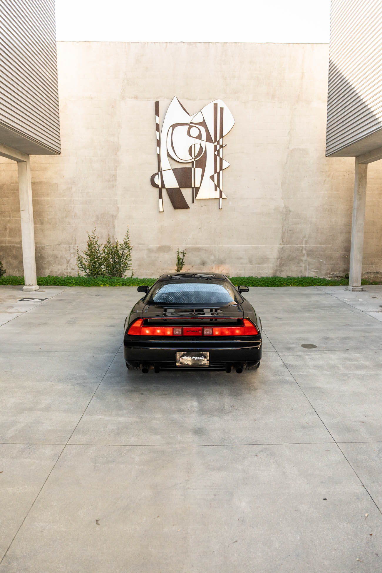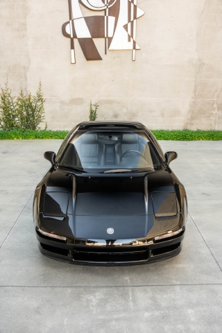 The NSX featured aluminum bodywork, and this example is finished in Berlina Black with a body-color removable roof panel. Exterior details include pop-up headlights, an integrated rear wing, side air intakes, power-adjustable side mirrors, and dual exhaust outlets. Paint meter readings are provided in the gallery.