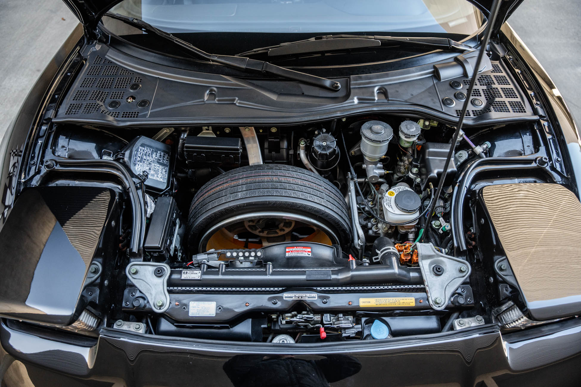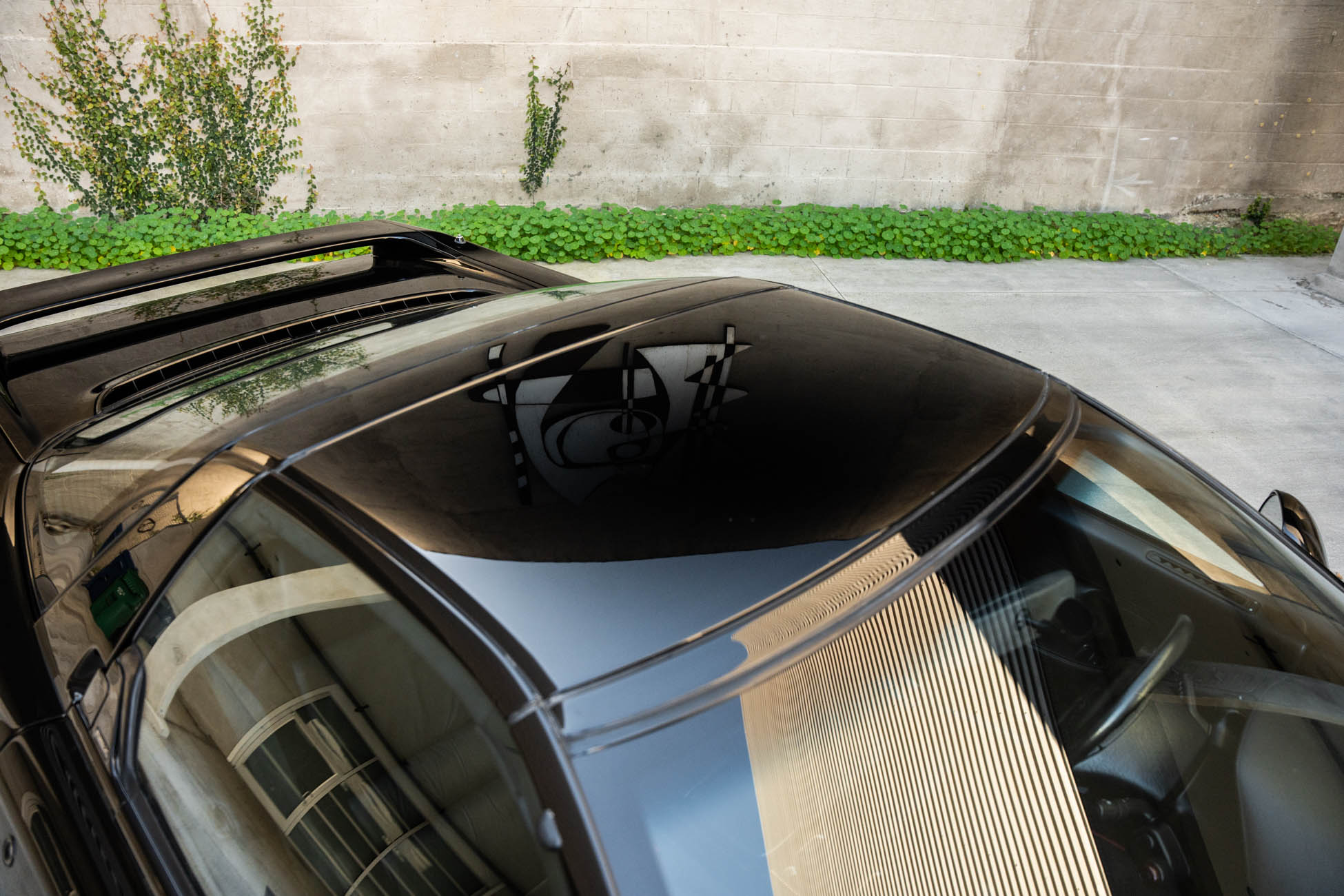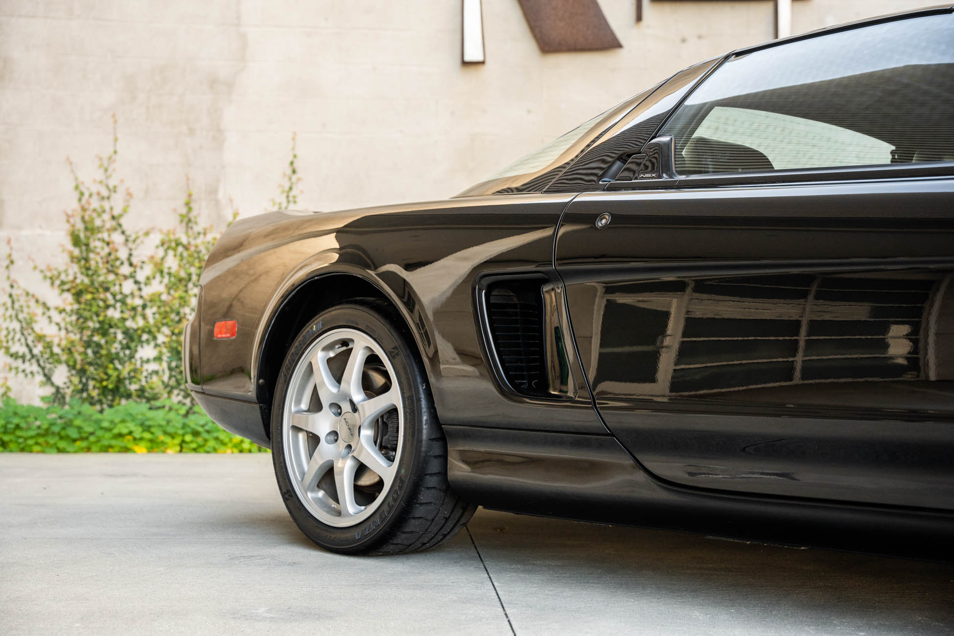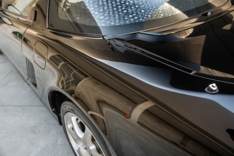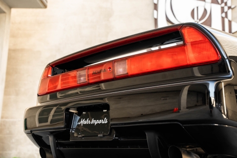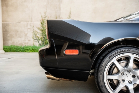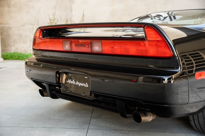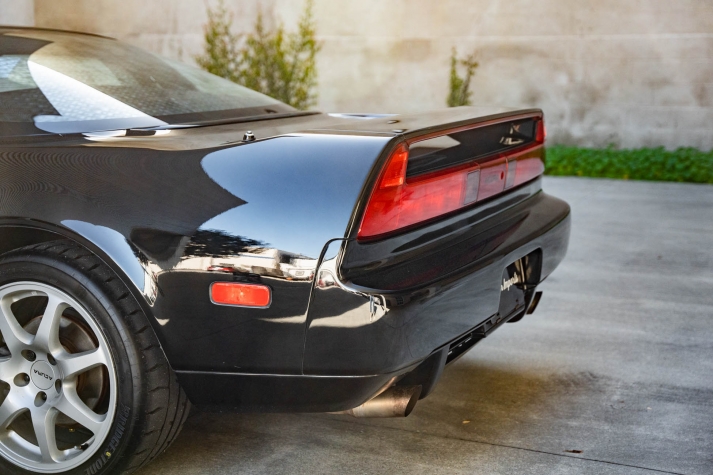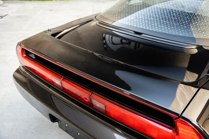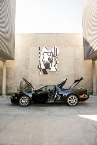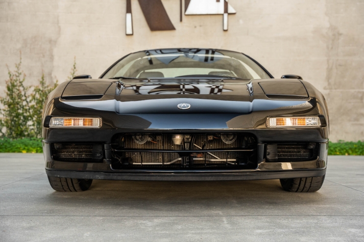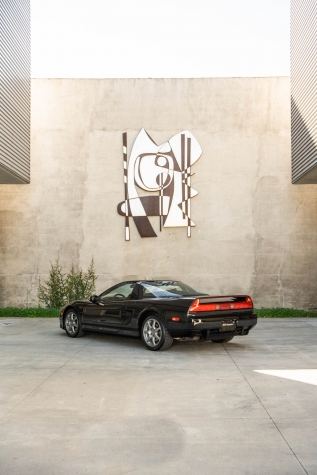 The NSX featured aluminum bodywork, and this example is finished in Berlina Black with a body-color removable roof panel. Exterior details include pop-up headlights, an integrated rear wing, side air intakes, power-adjustable side mirrors, and dual exhaust outlets. Paint meter readings are provided in the gallery.