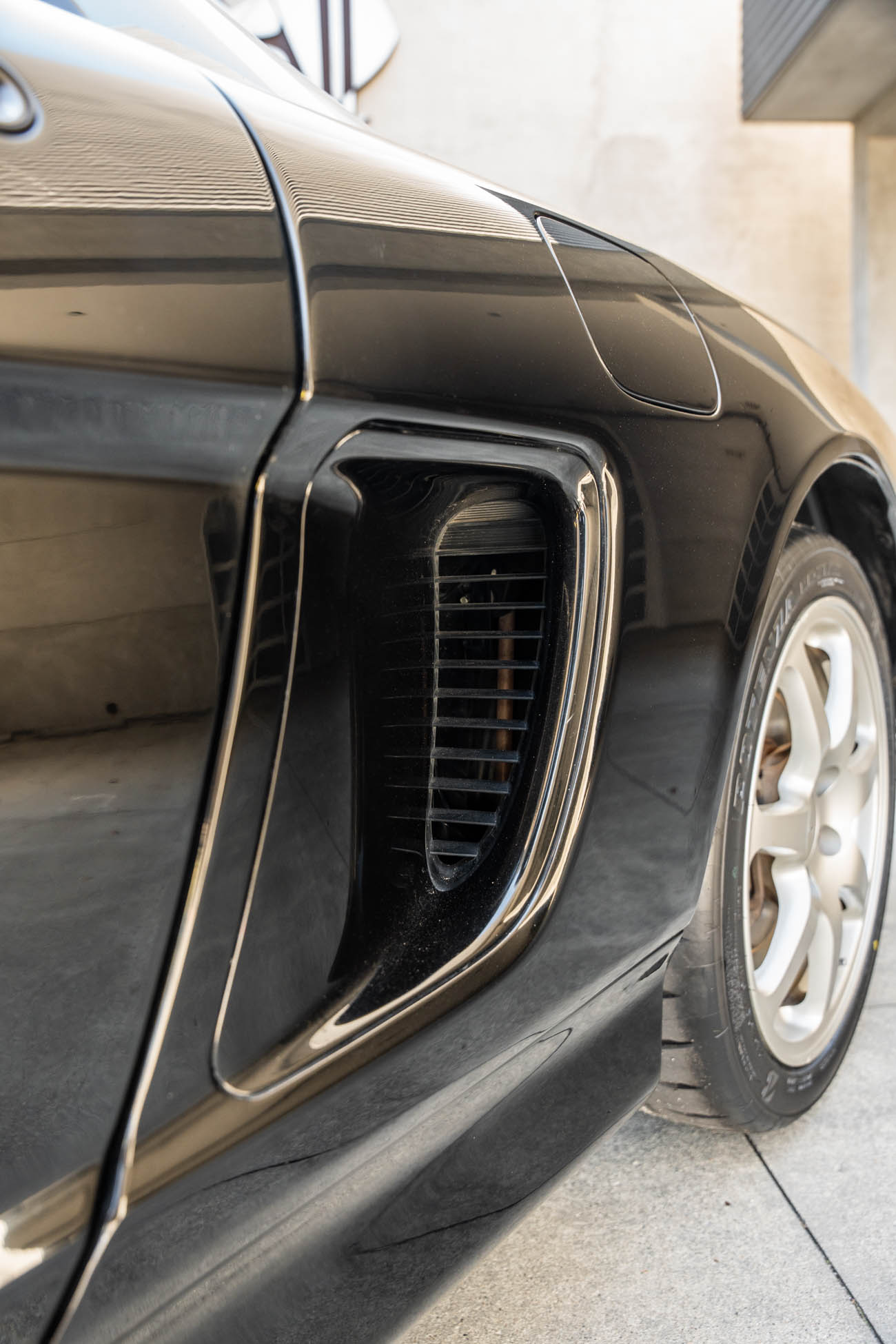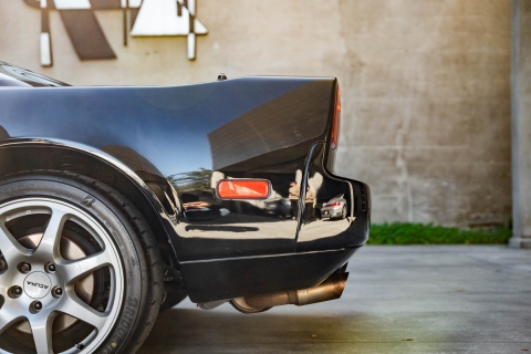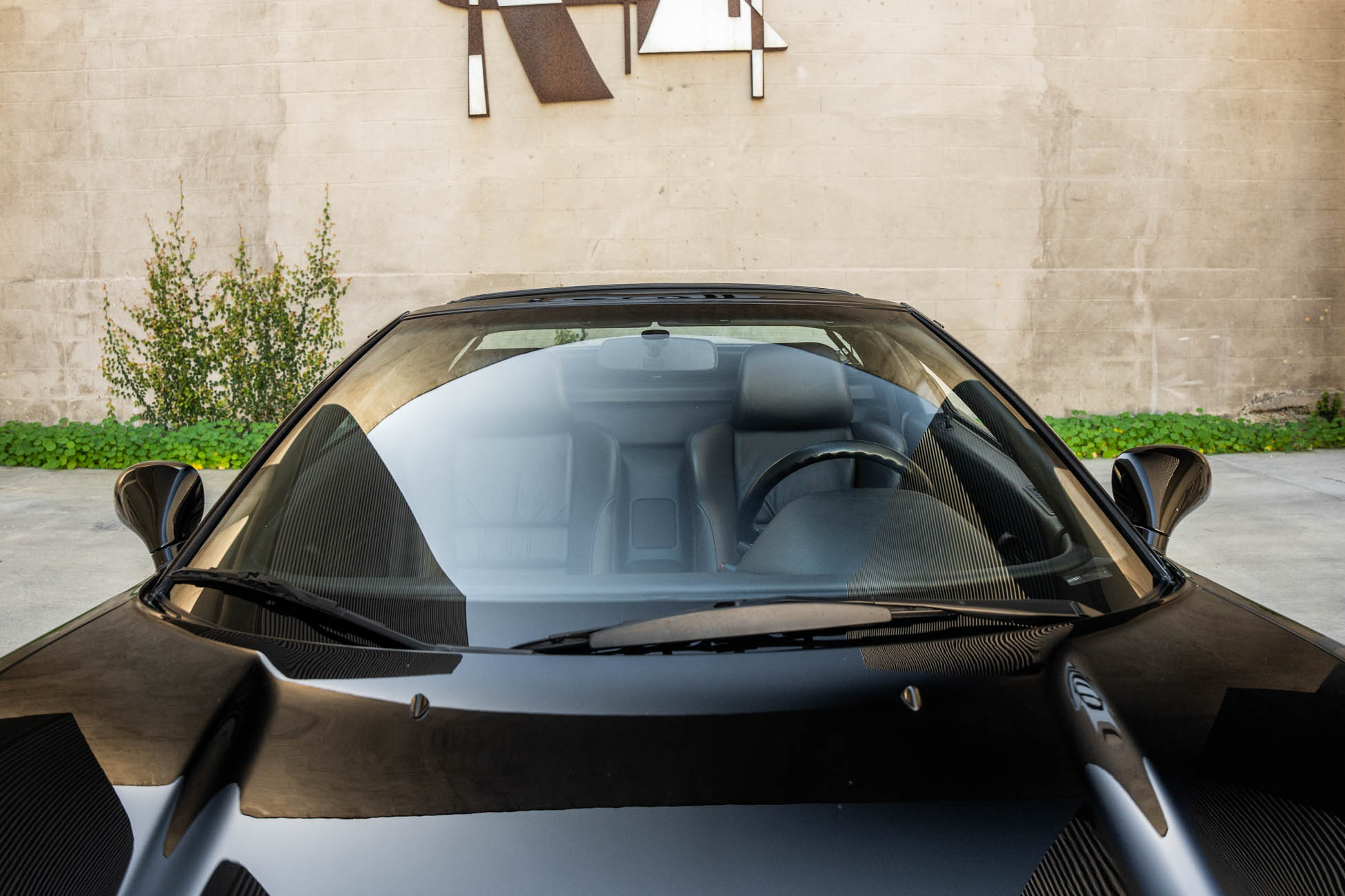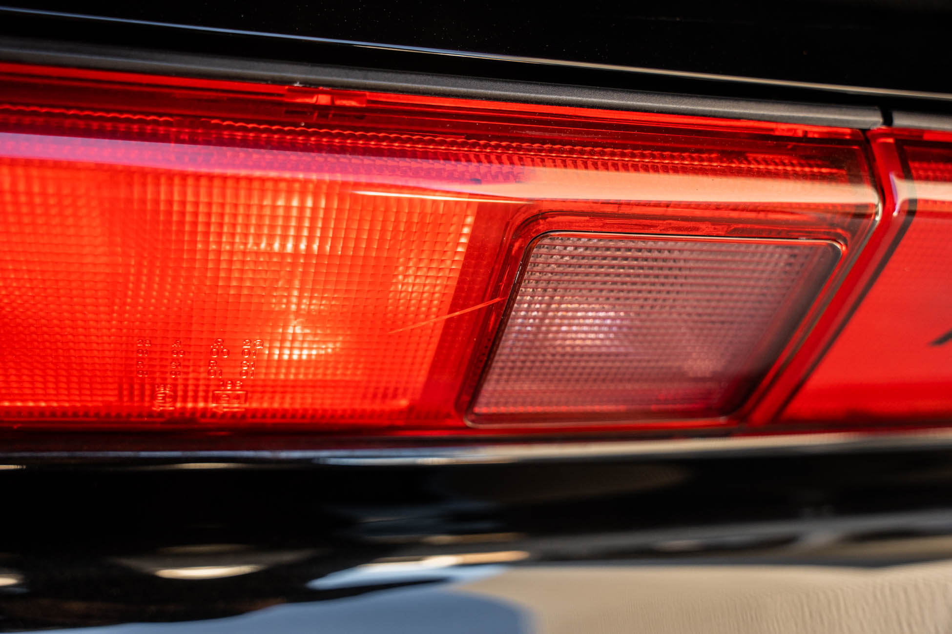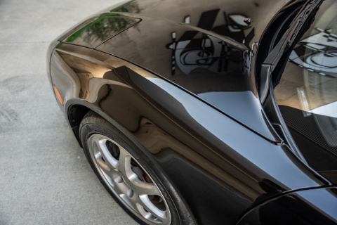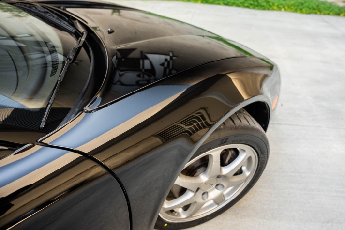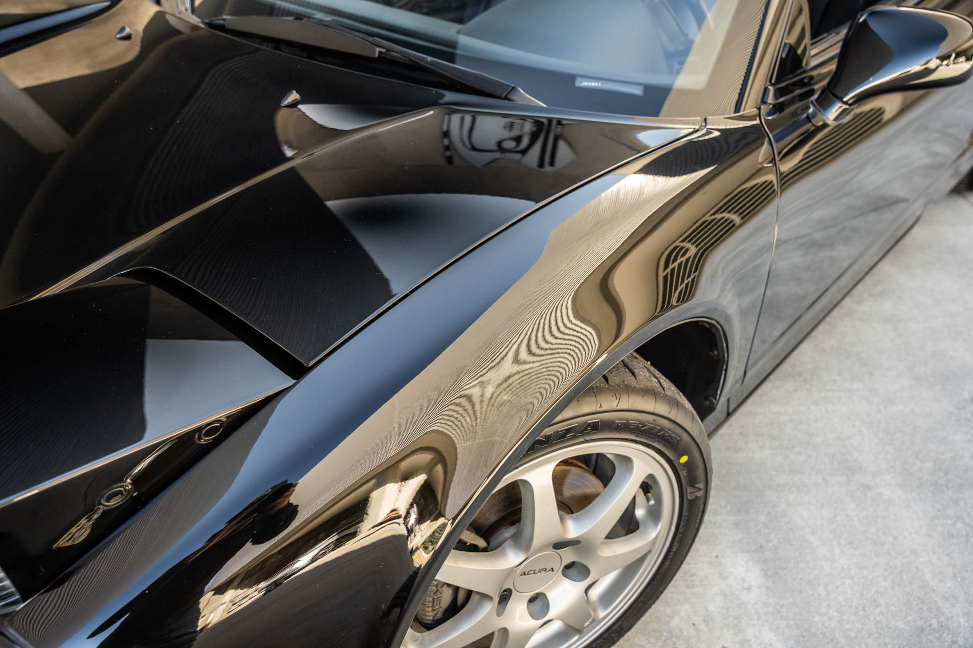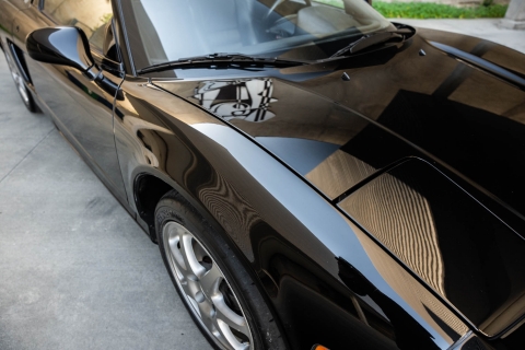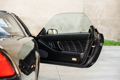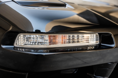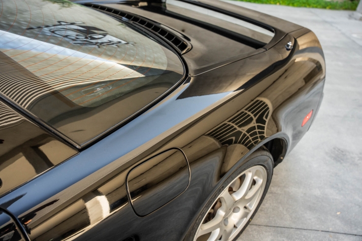The NSX featured aluminum bodywork, and this example is finished in Berlina Black with a body-color removable roof panel. Exterior details include pop-up headlights, an integrated rear wing, side air intakes, power-adjustable side mirrors, and dual exhaust outlets. Paint meter readings are provided in the gallery.