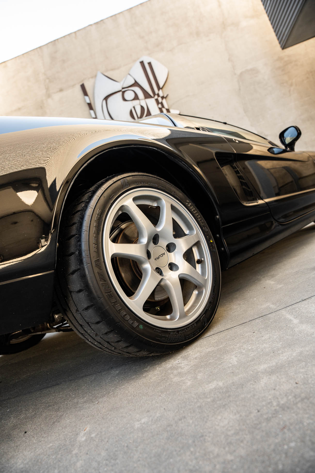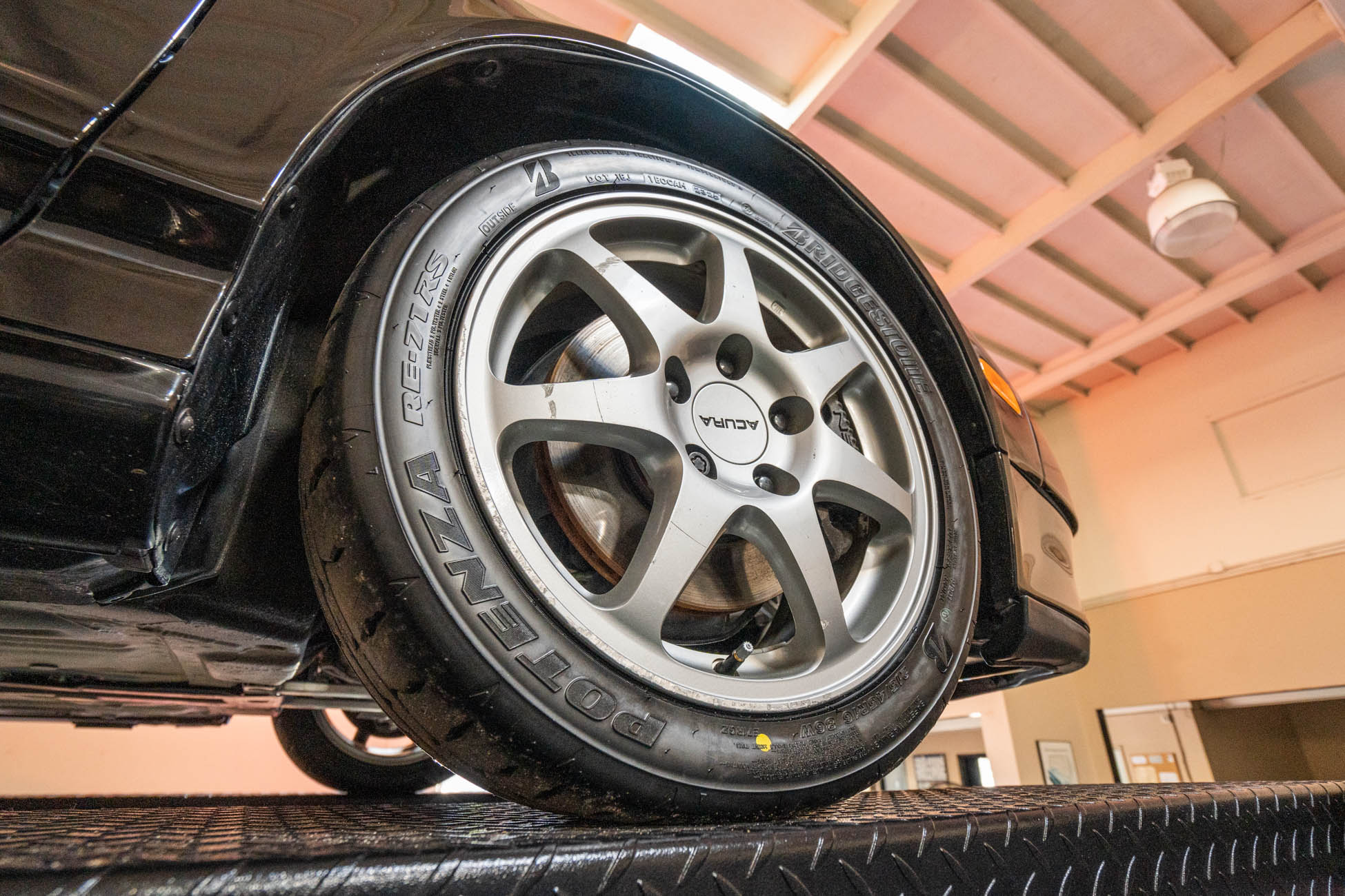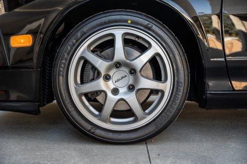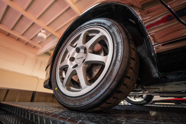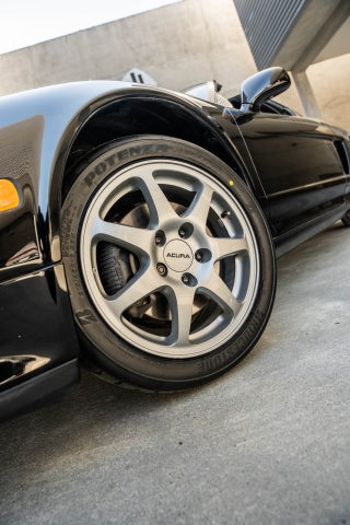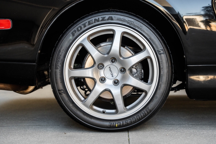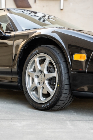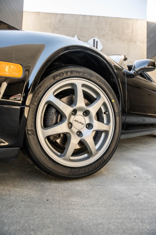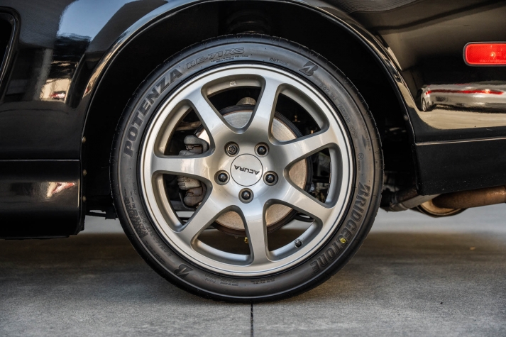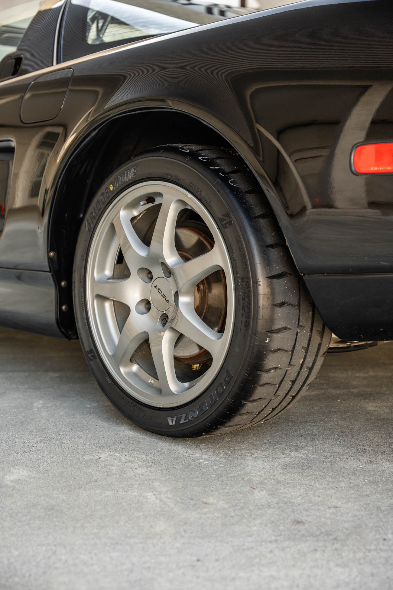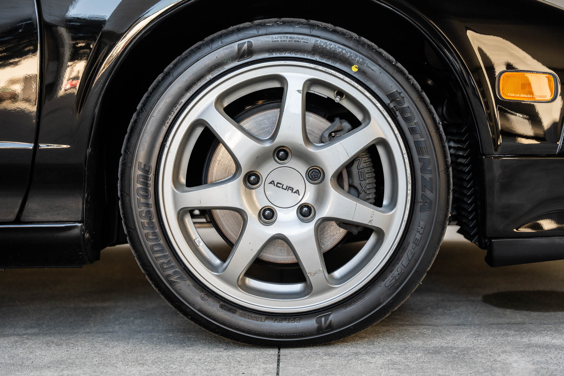 Staggered-diameter 16” and 17” seven-spoke aluminum wheels wear Bridgestone tires that were mounted in January 2026. The car features a four-wheel double-wishbone suspension with front and rear stabilizer bars, and braking is handled by NSX-branded calipers over vented rotors at each corner. The power steering control module was repaired in preparation for the sale. Multiple wheels have curb damage.