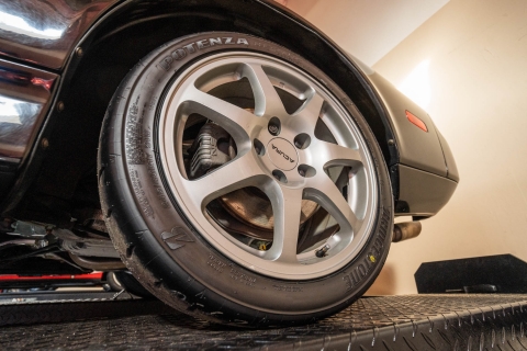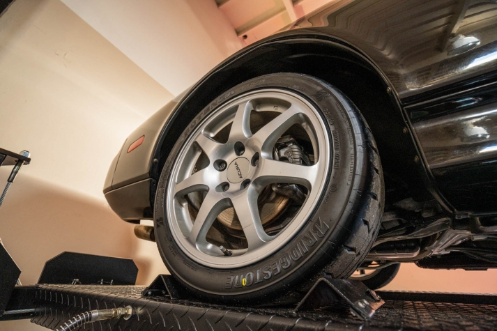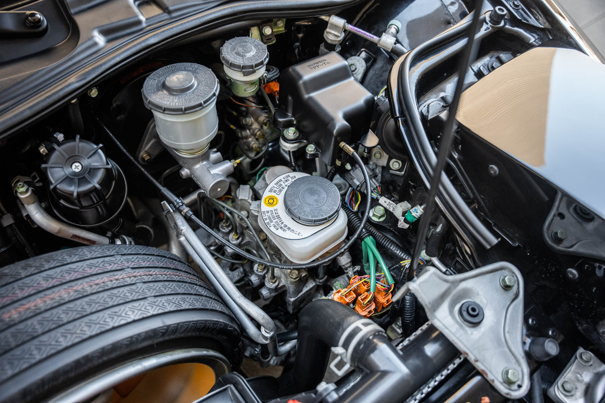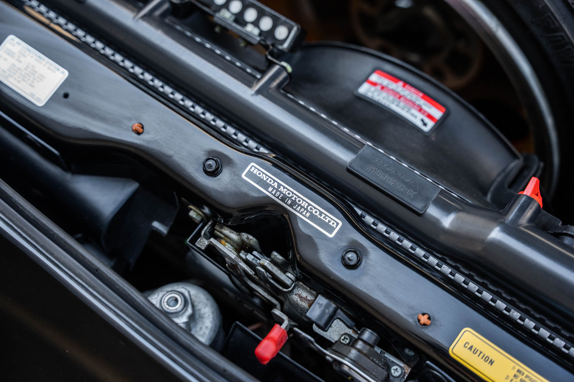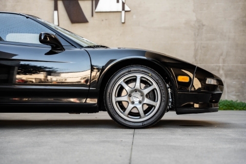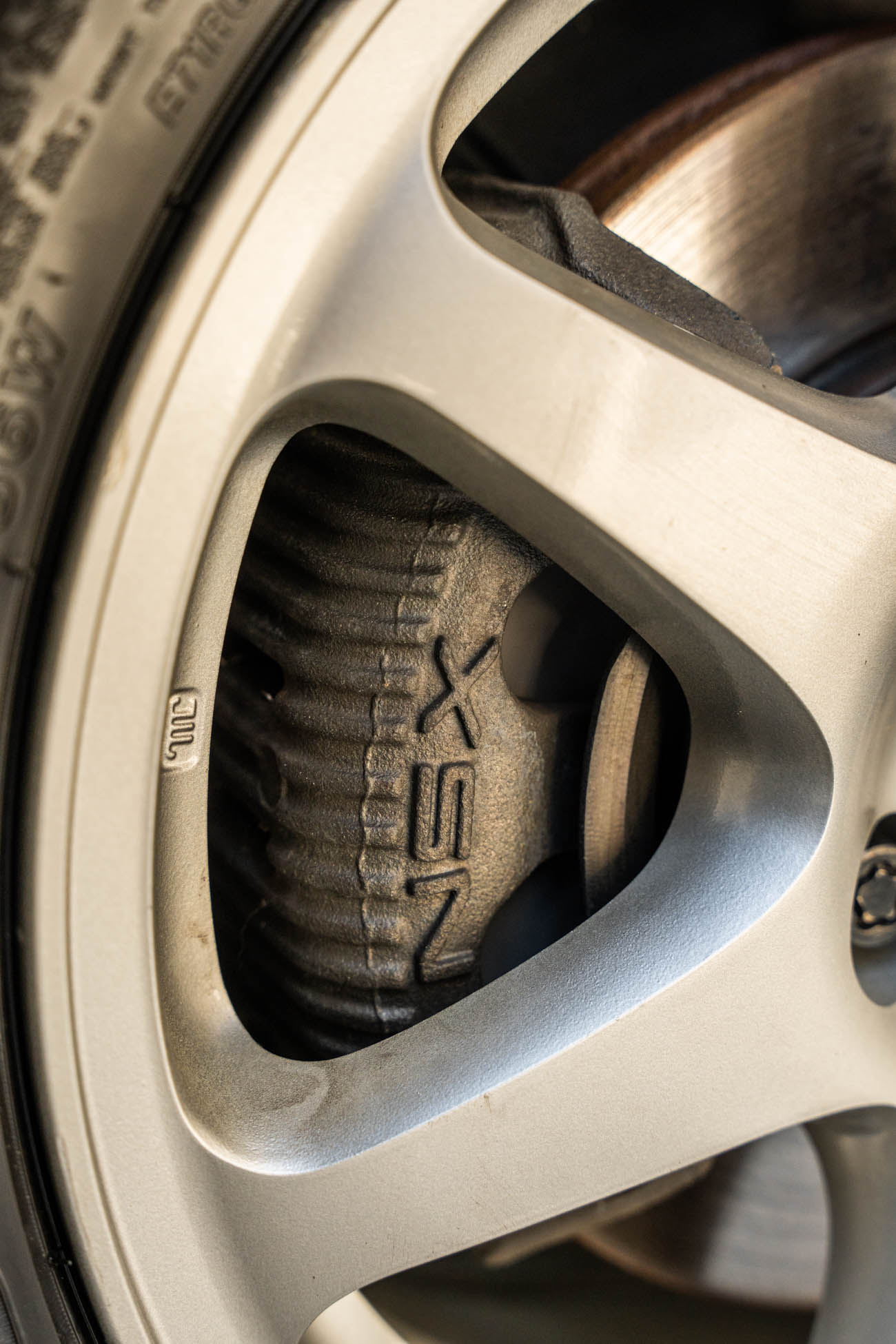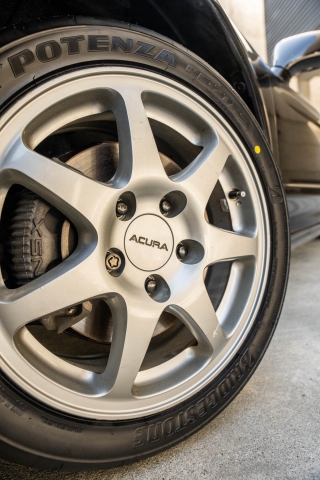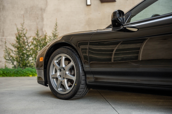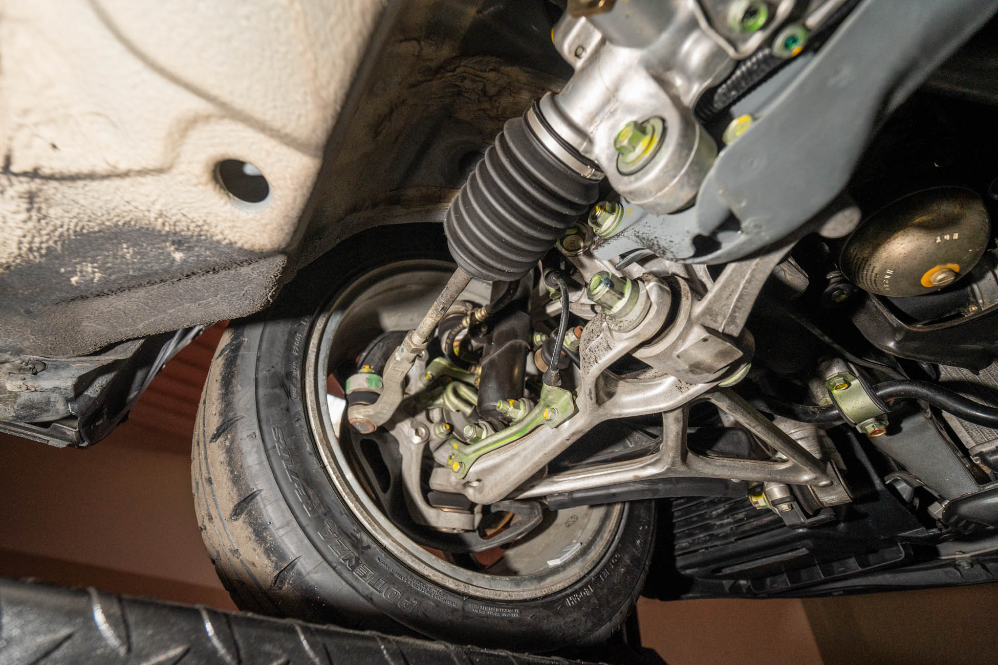 Staggered-diameter 16” and 17” seven-spoke aluminum wheels wear Bridgestone tires that were mounted in January 2026. The car features a four-wheel double-wishbone suspension with front and rear stabilizer bars, and braking is handled by NSX-branded calipers over vented rotors at each corner. The power steering control module was repaired in preparation for the sale. Multiple wheels have curb damage.