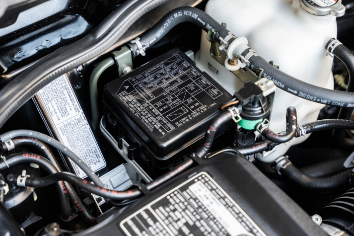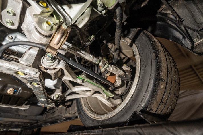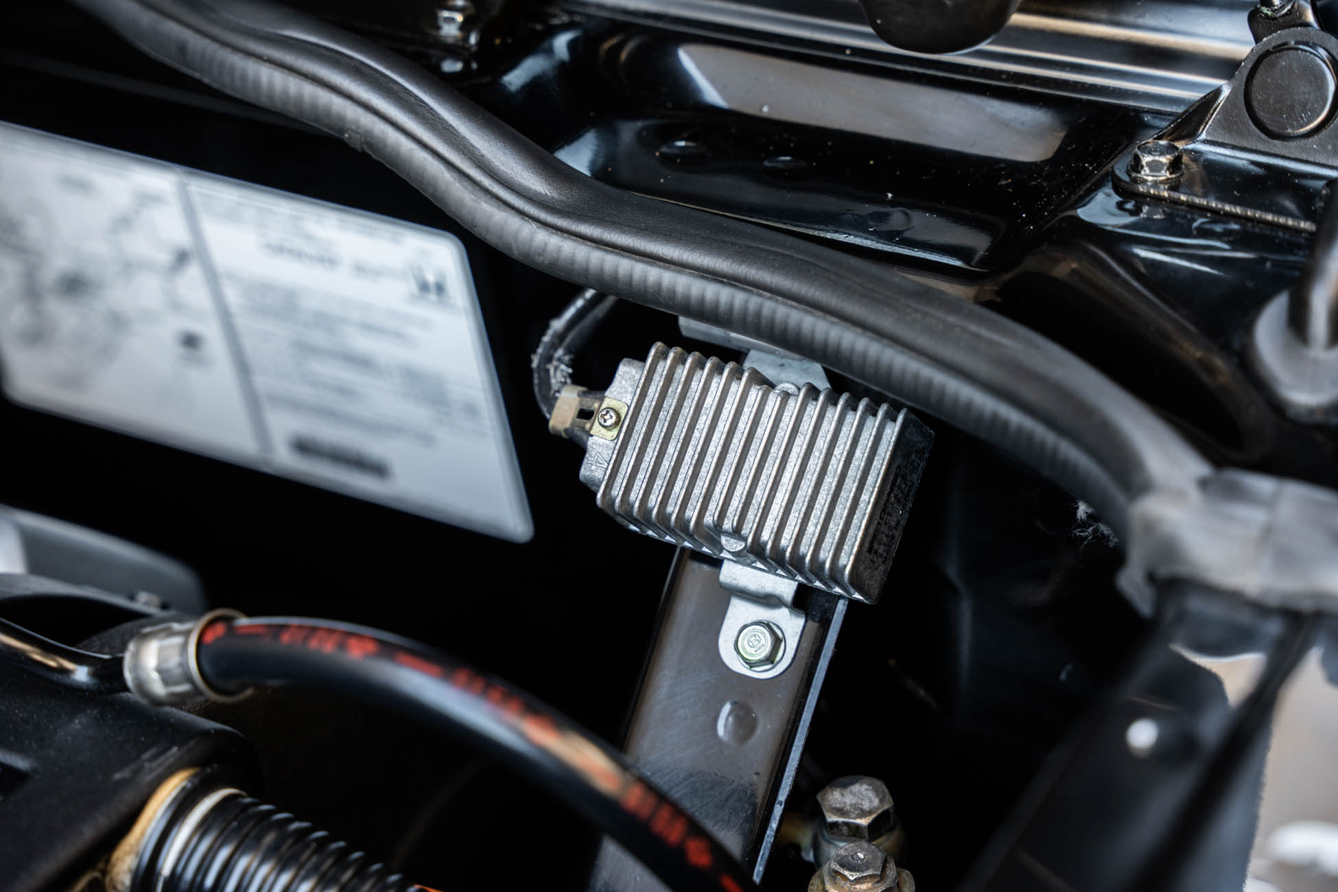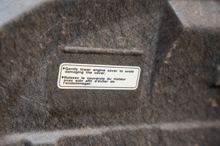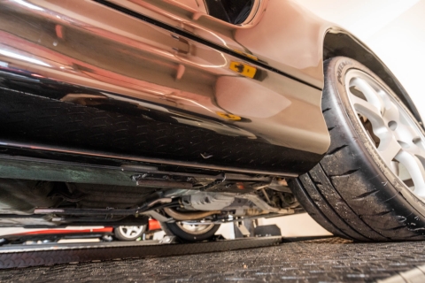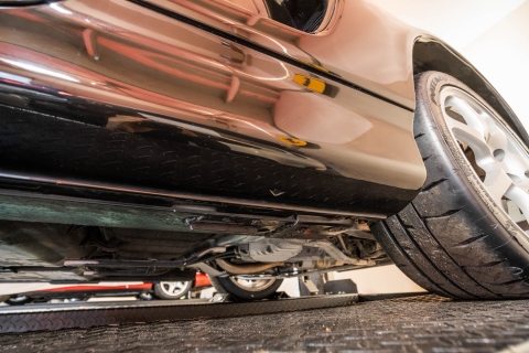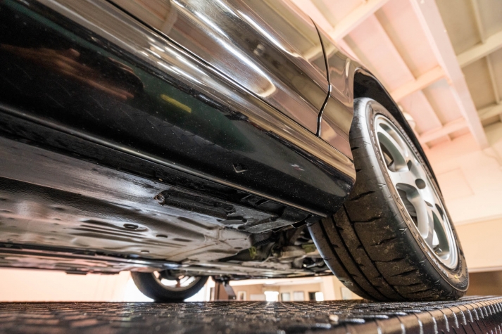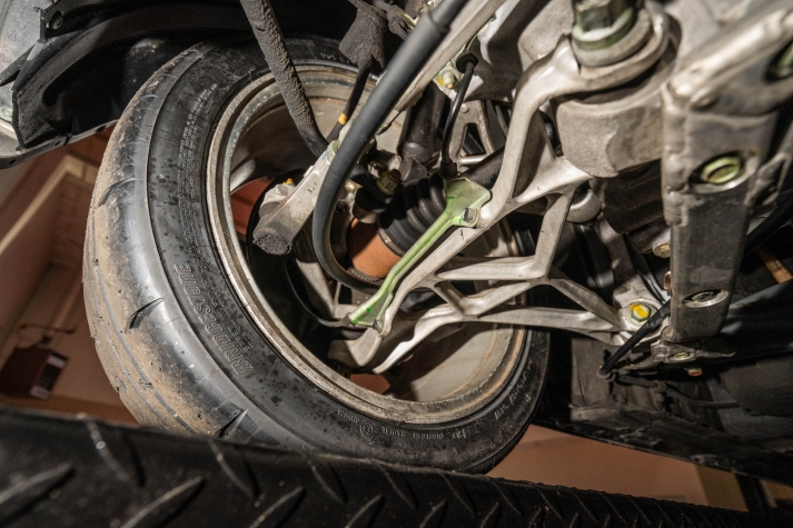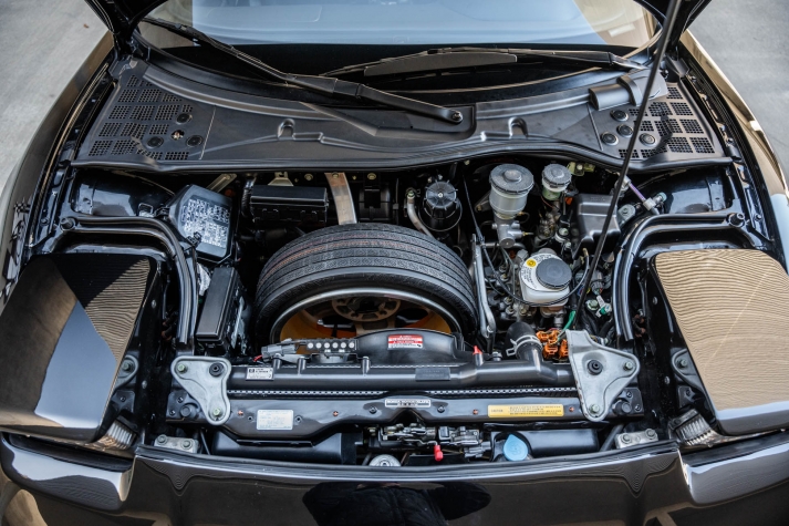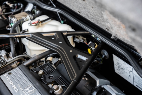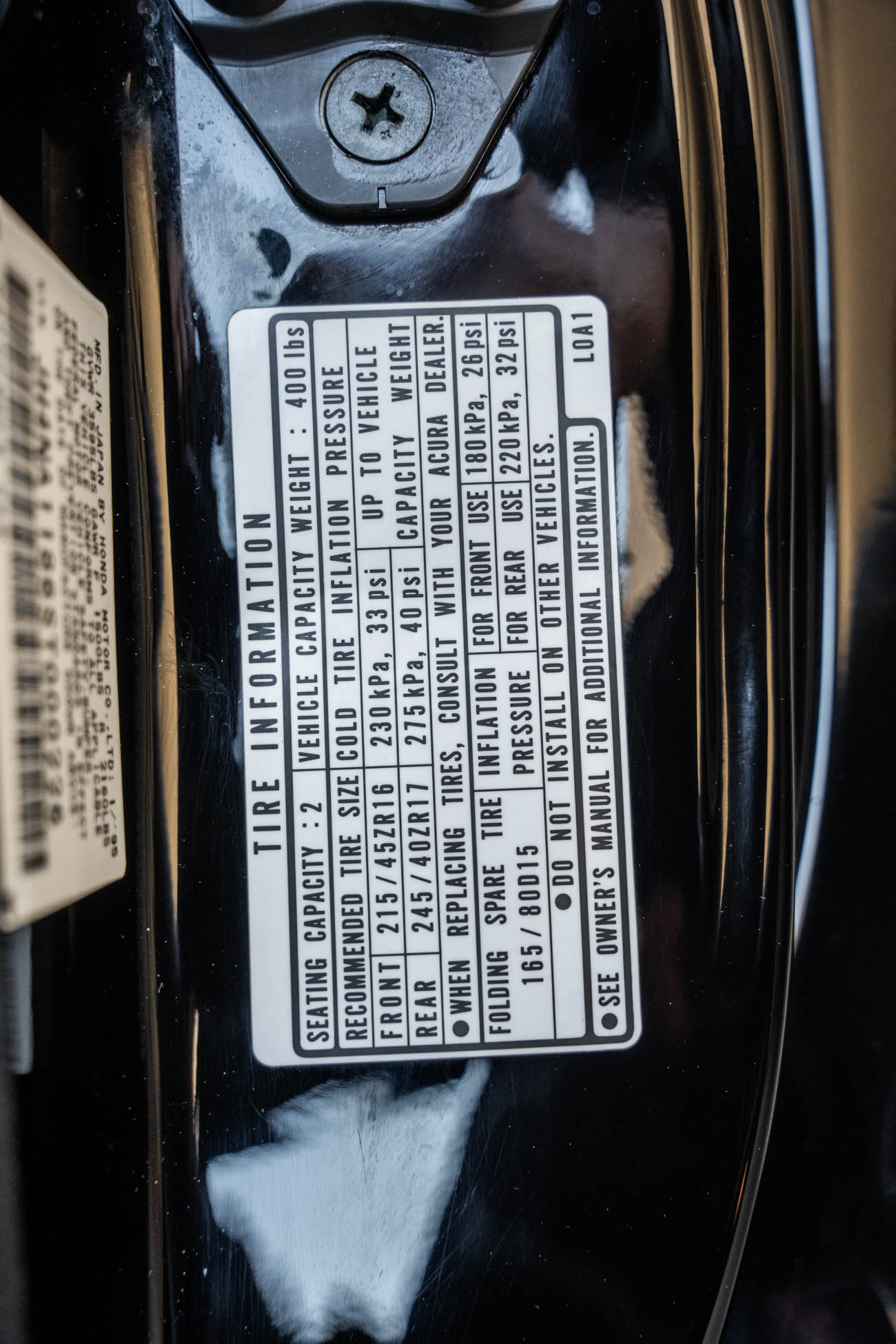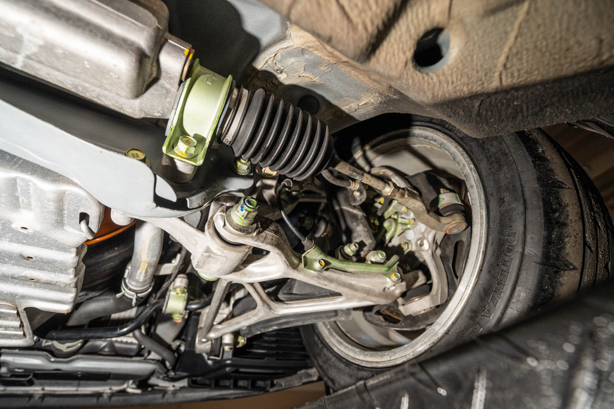 Staggered-diameter 16” and 17” seven-spoke aluminum wheels wear Bridgestone tires that were mounted in January 2026. The car features a four-wheel double-wishbone suspension with front and rear stabilizer bars, and braking is handled by NSX-branded calipers over vented rotors at each corner. The power steering control module was repaired in preparation for the sale. Multiple wheels have curb damage.