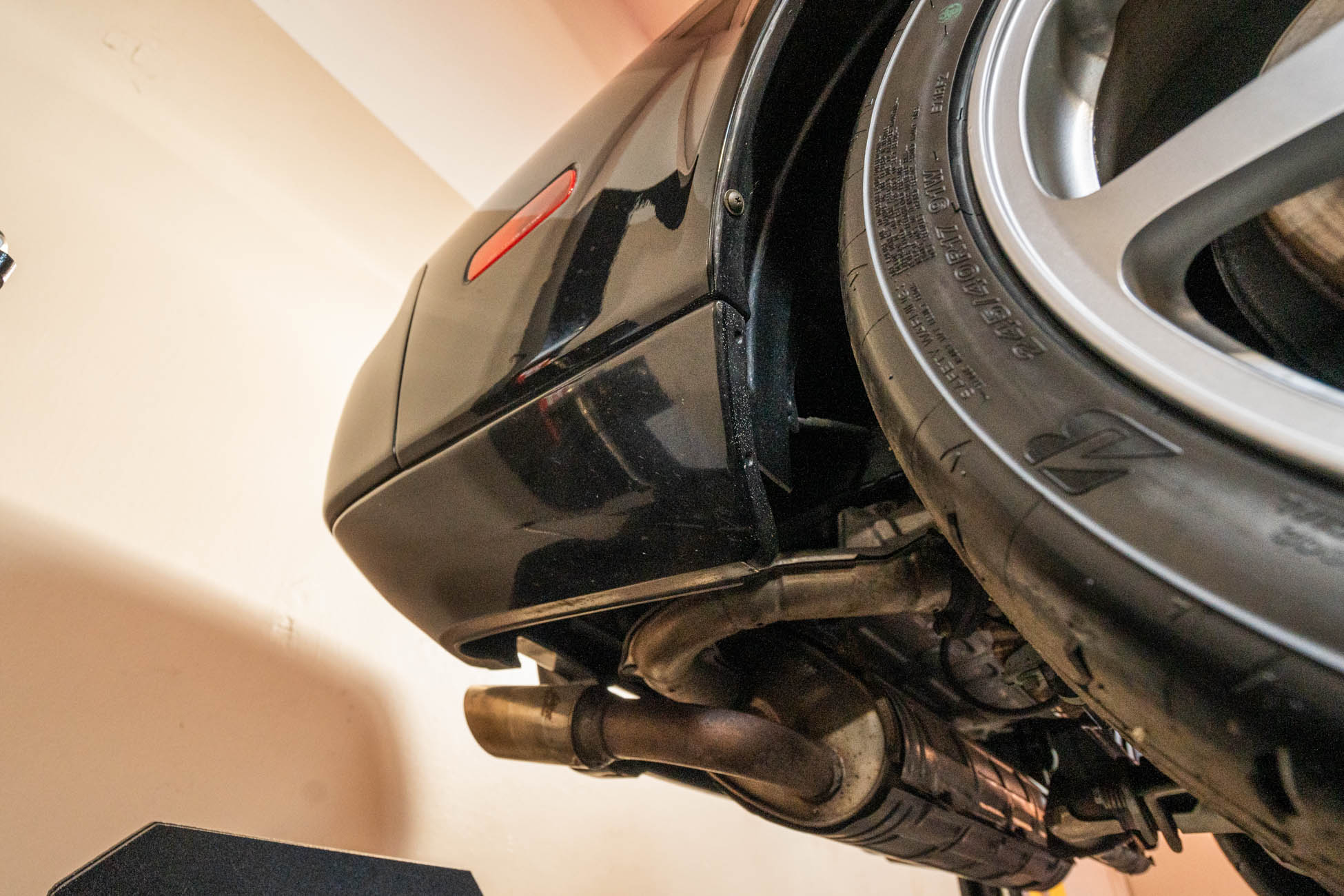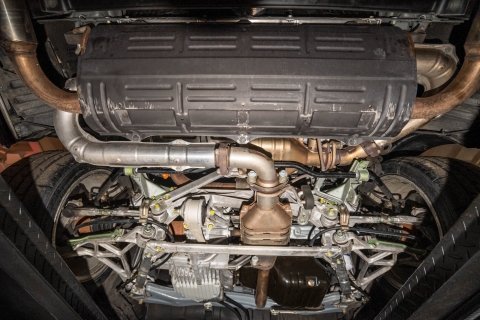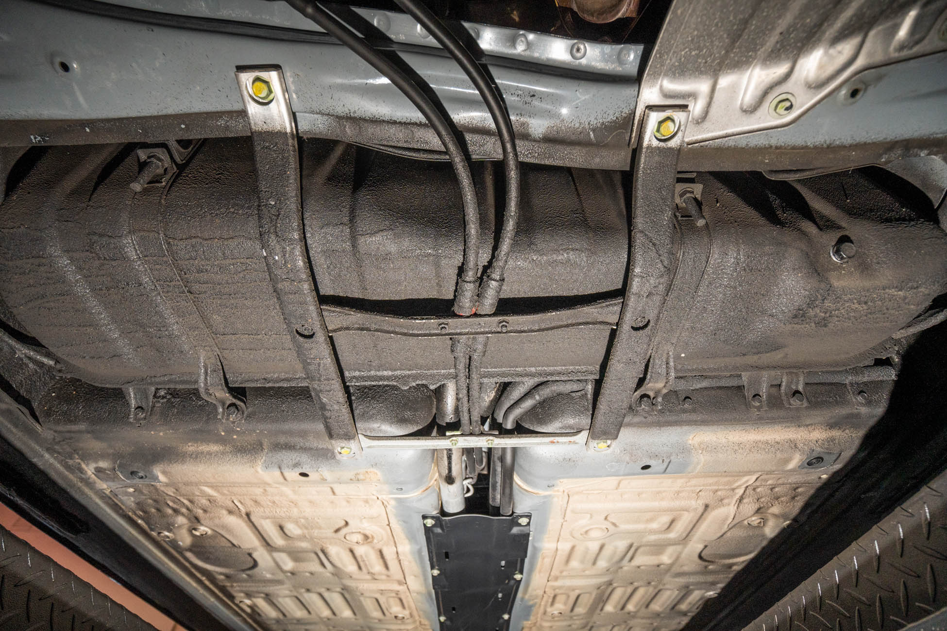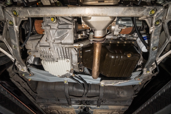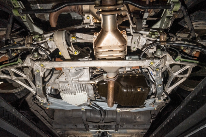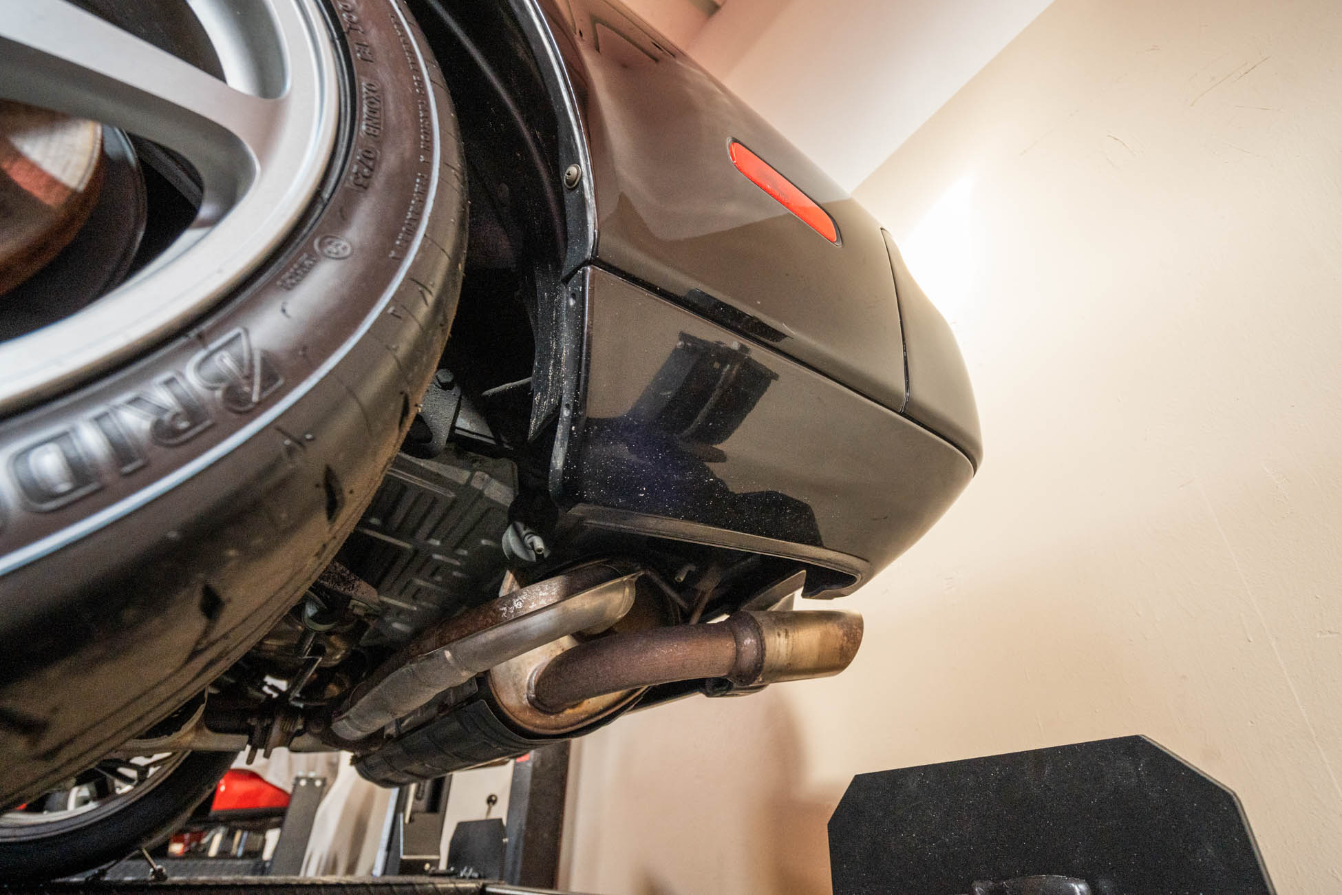 Power is routed to the rear wheels via a five-speed manual transaxle and a limited-slip differential. An August 2024 invoice states that the catalytic converter core requires replacement. Additional photos of the underside are provided in the gallery.