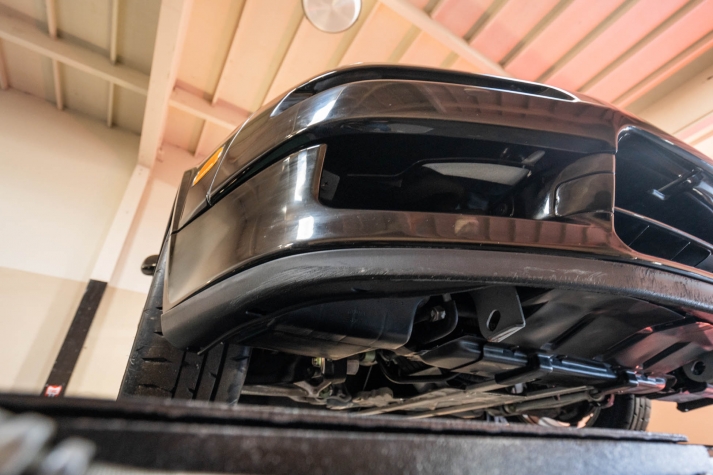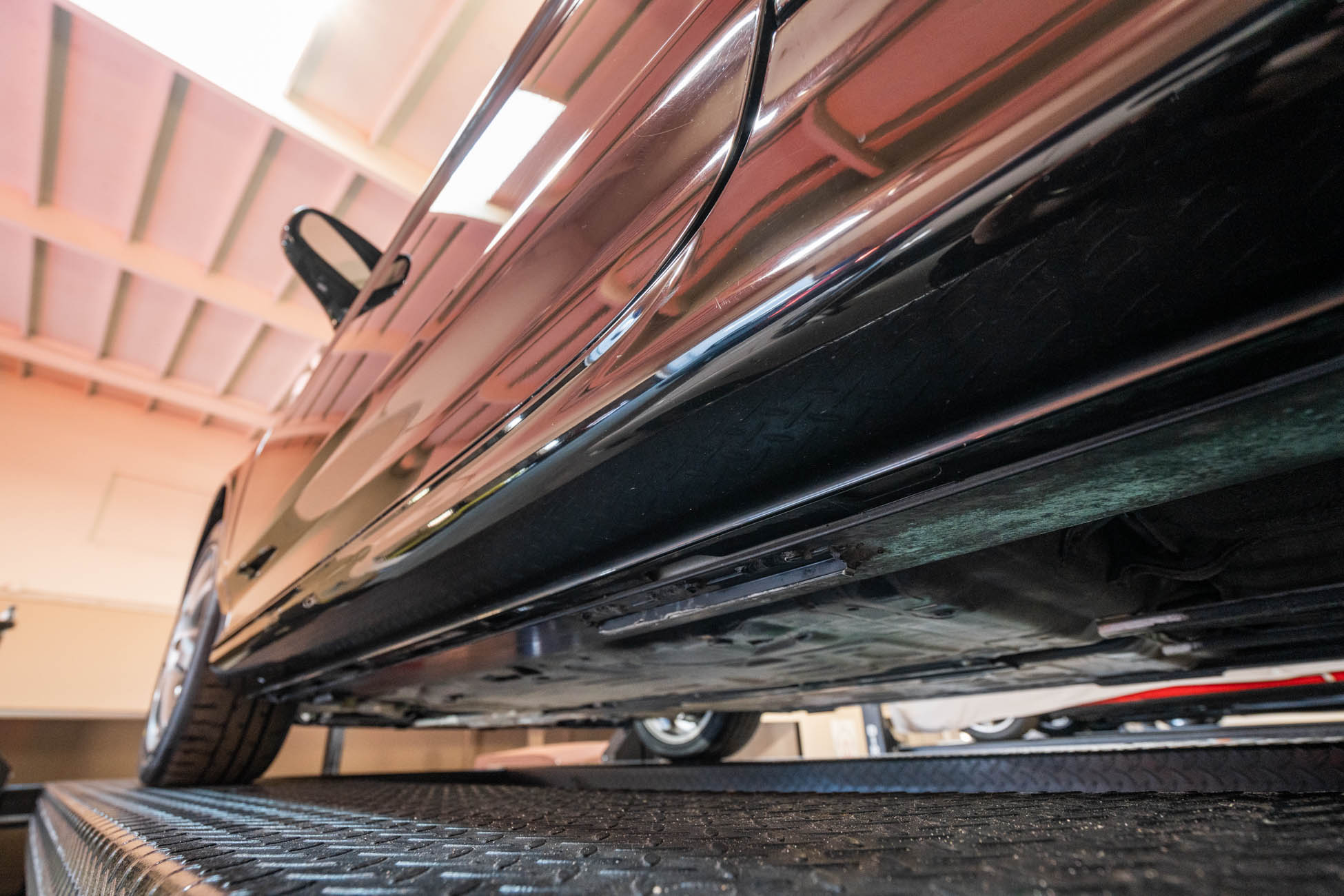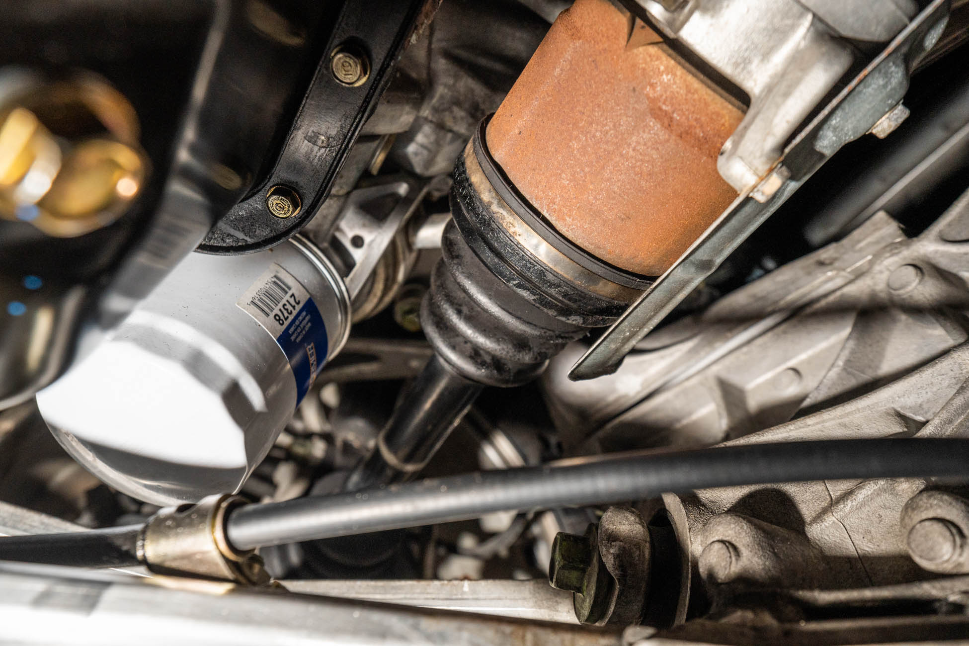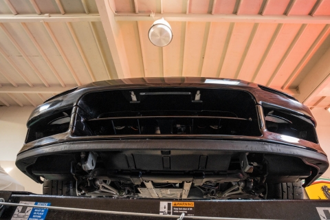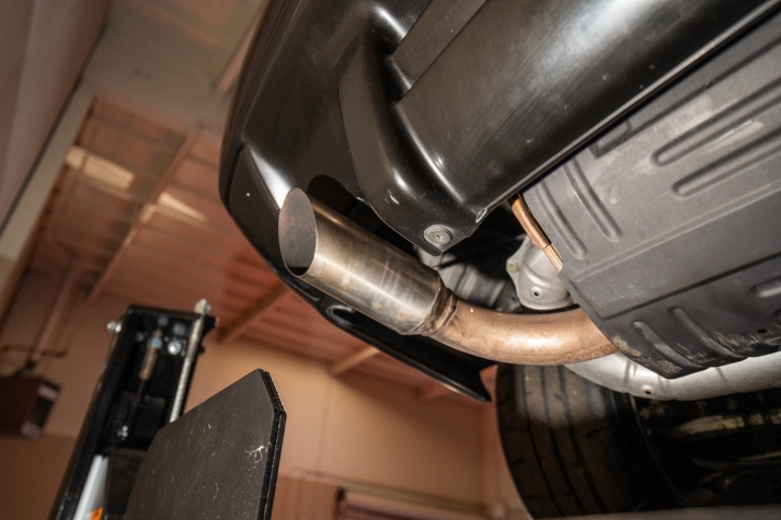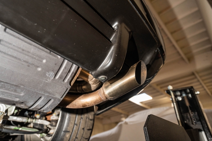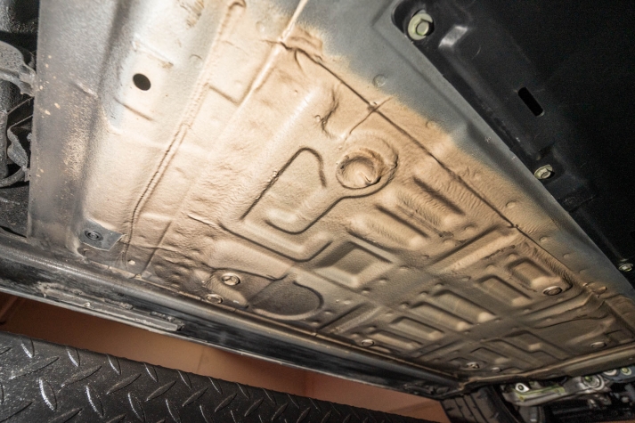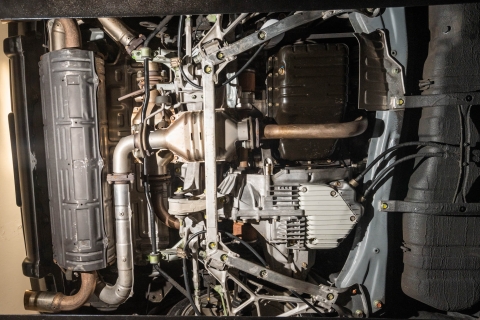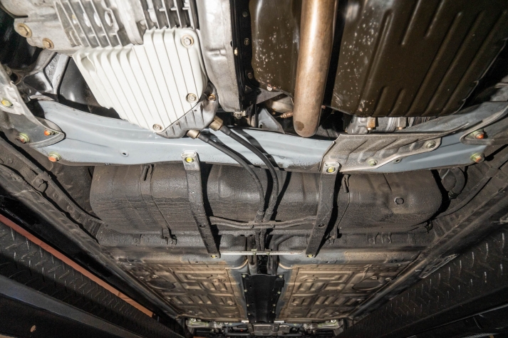 Power is routed to the rear wheels via a five-speed manual transaxle and a limited-slip differential. An August 2024 invoice states that the catalytic converter core requires replacement. Additional photos of the underside are provided in the gallery.