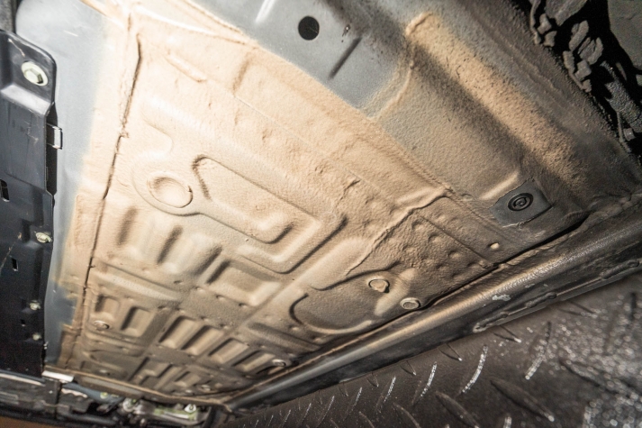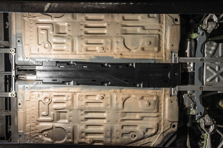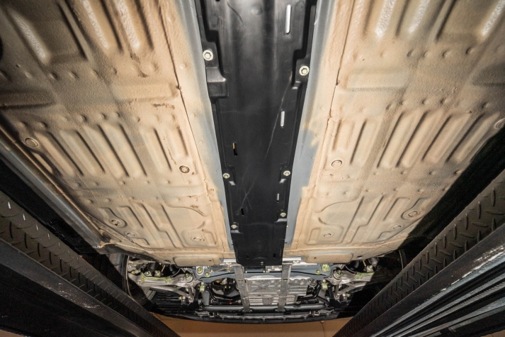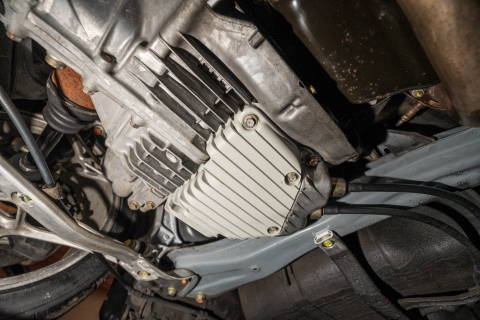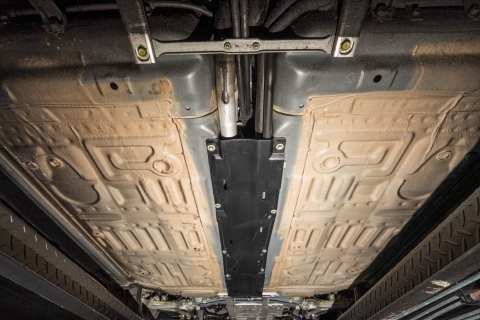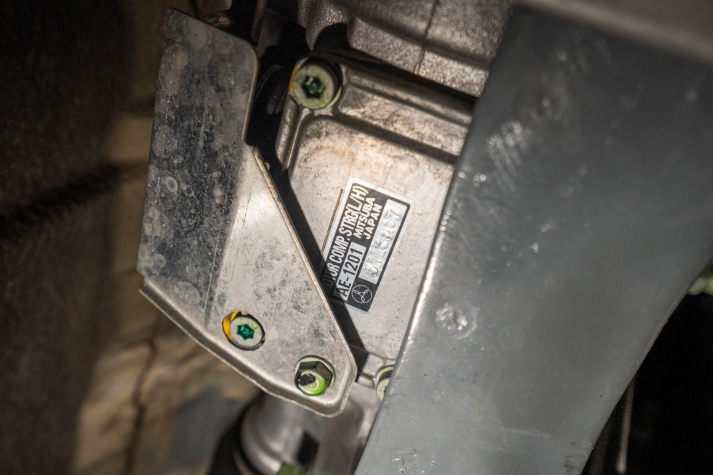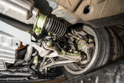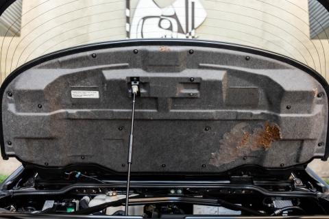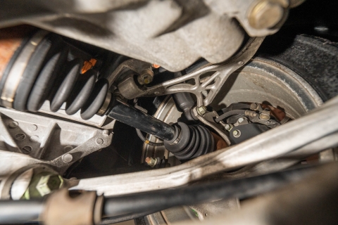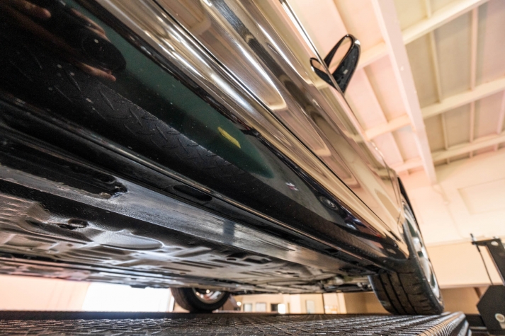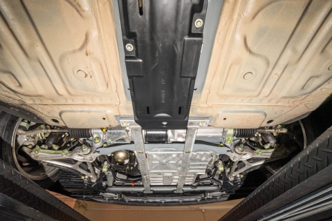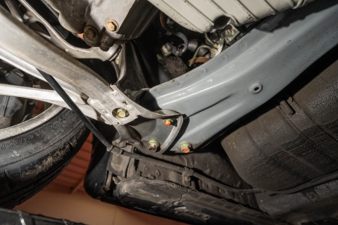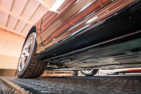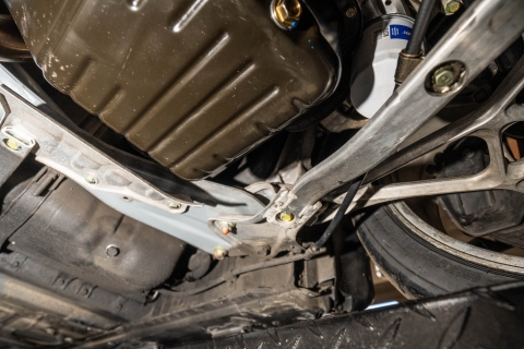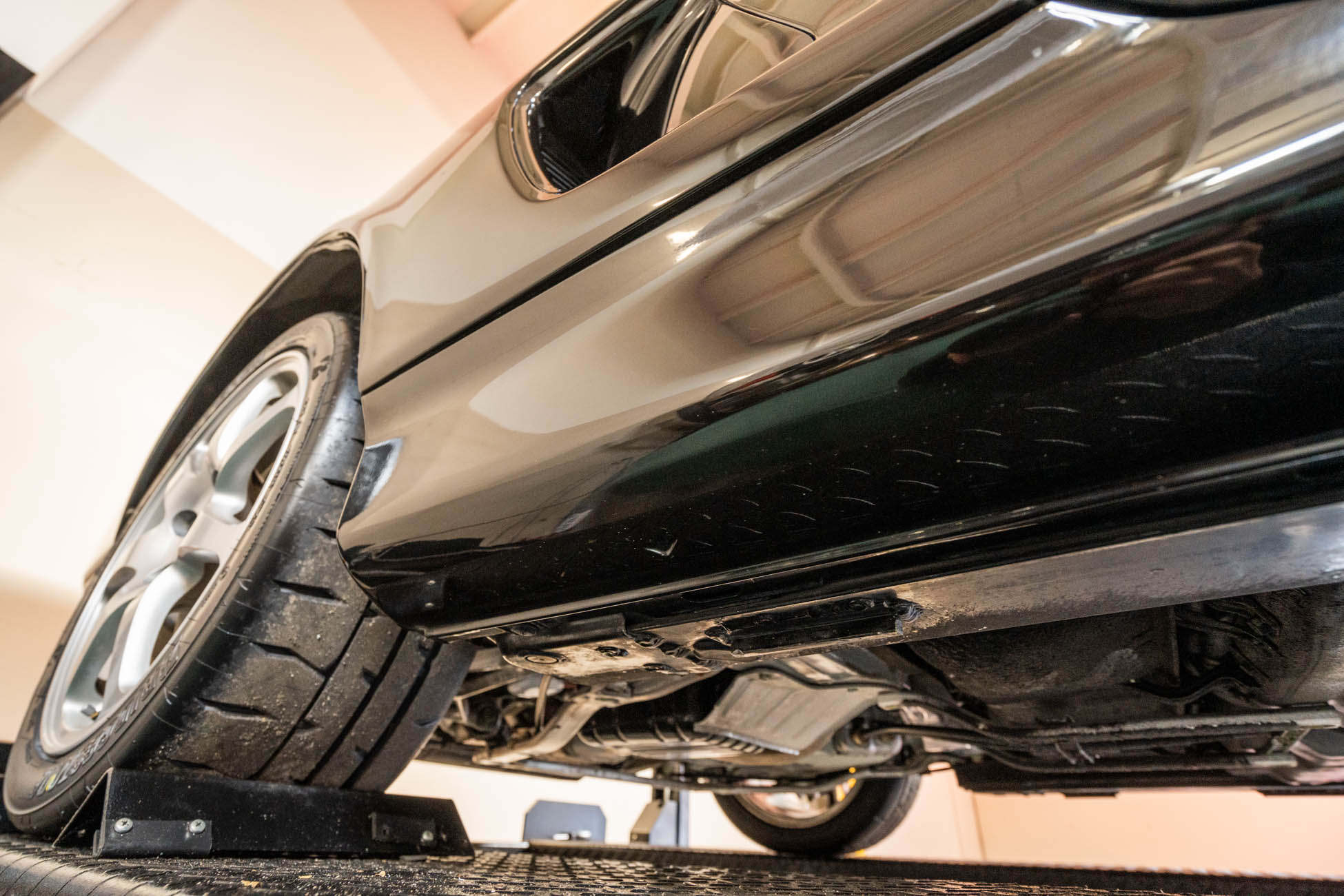 Power is routed to the rear wheels via a five-speed manual transaxle and a limited-slip differential. An August 2024 invoice states that the catalytic converter core requires replacement. Additional photos of the underside are provided in the gallery.
