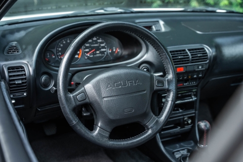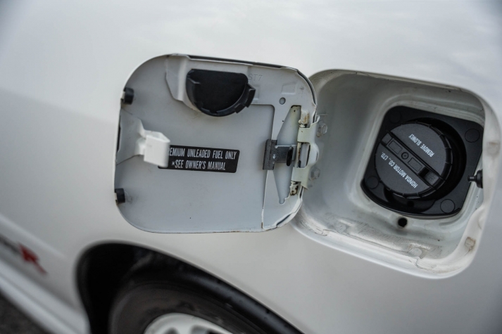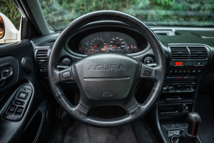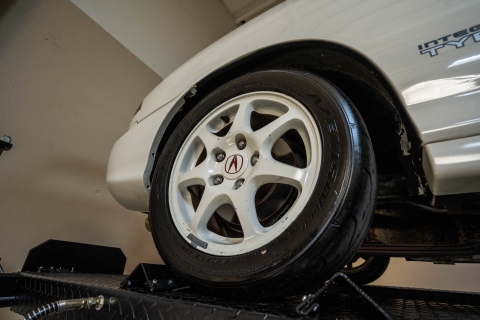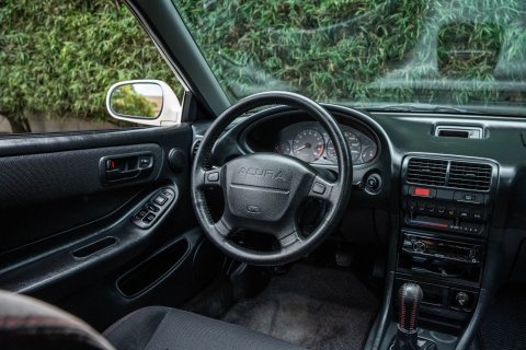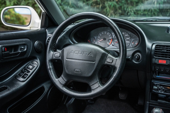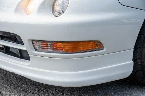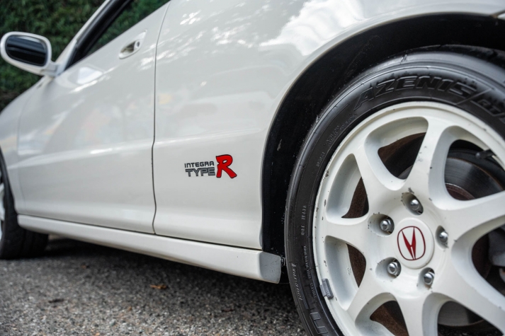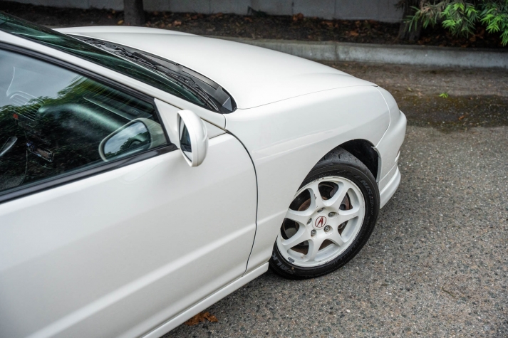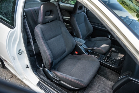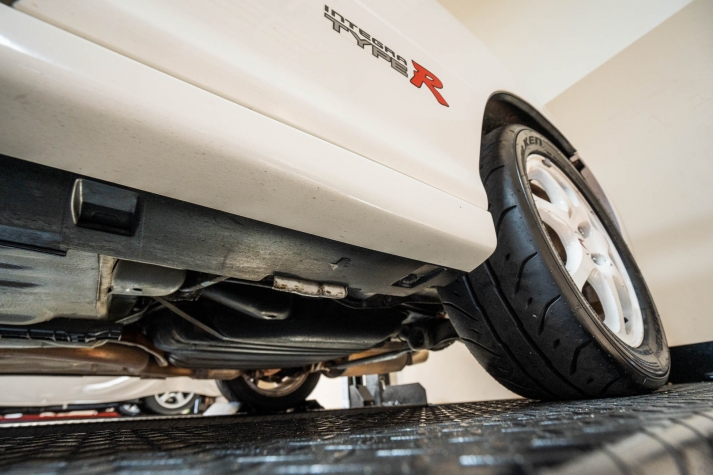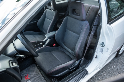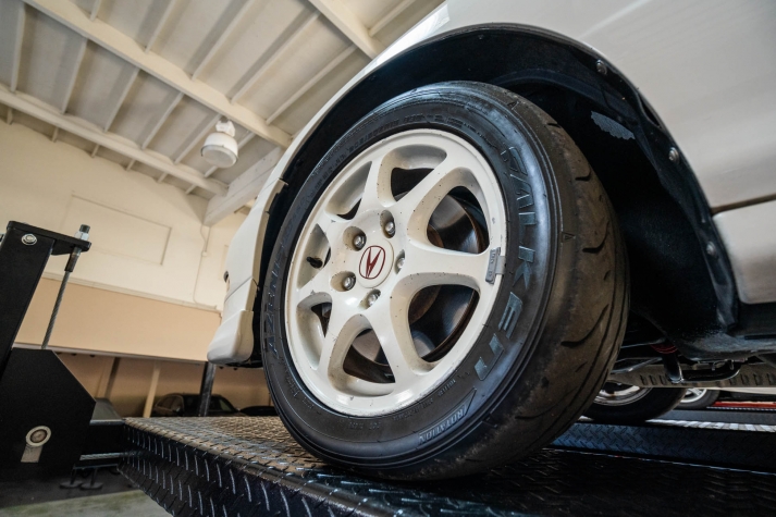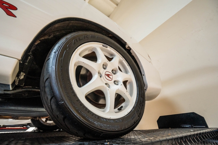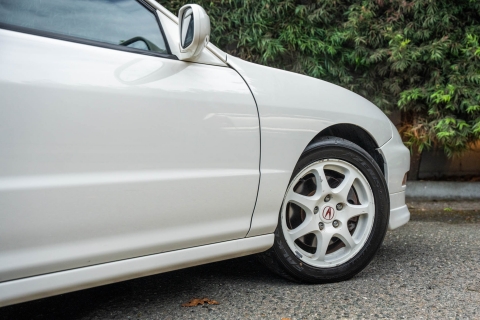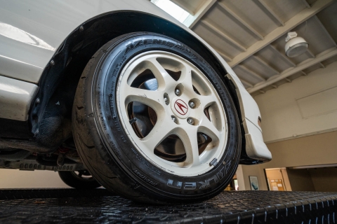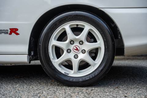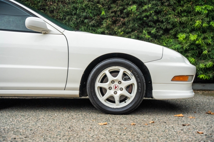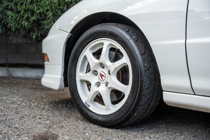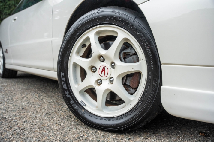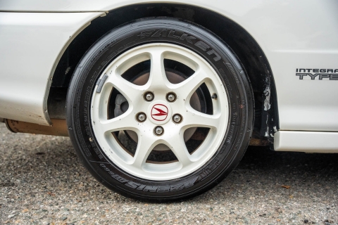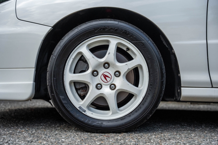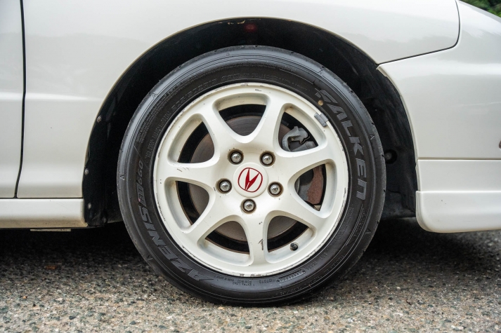 White 15? seven-spoke alloy wheels are fitted with Falken Azenis tires that were mounted in 2024. The Type R received larger-diameter disc brakes at each corner as well as a lower ride height when compared with the standard Integra, and Bilstein dampers are fitted. The seller notes that the suspension was serviced in 2024.
