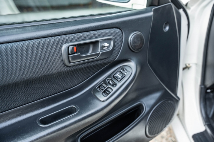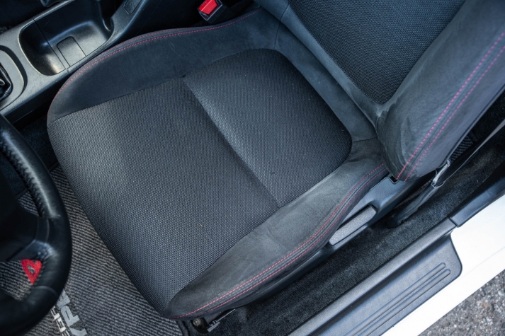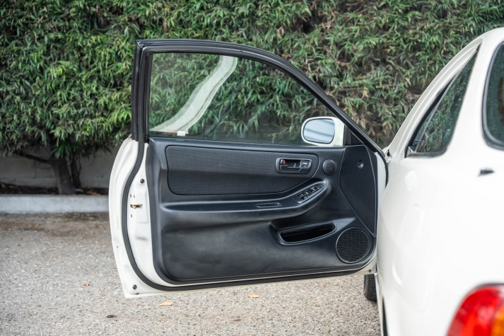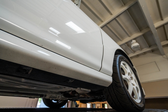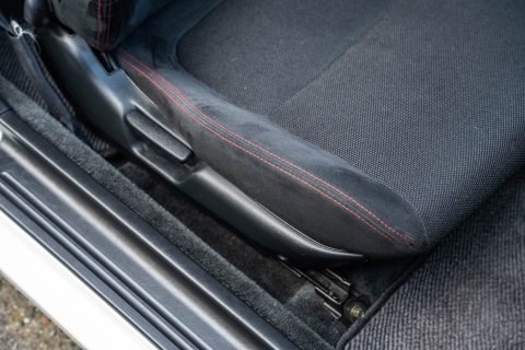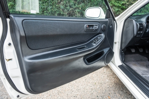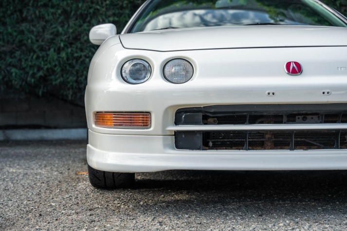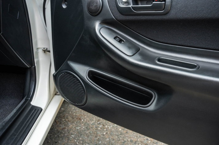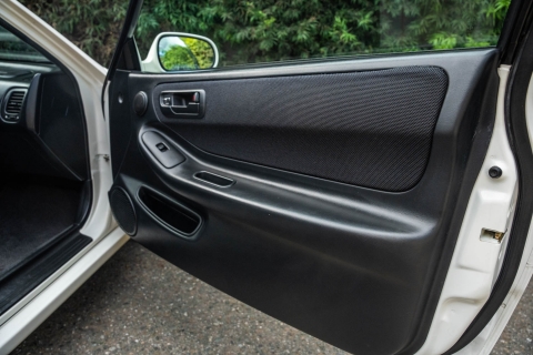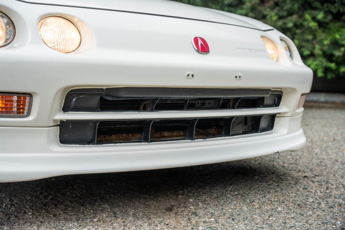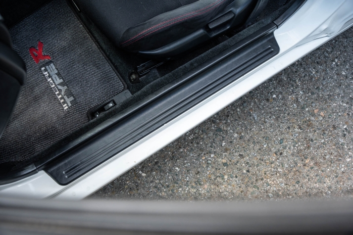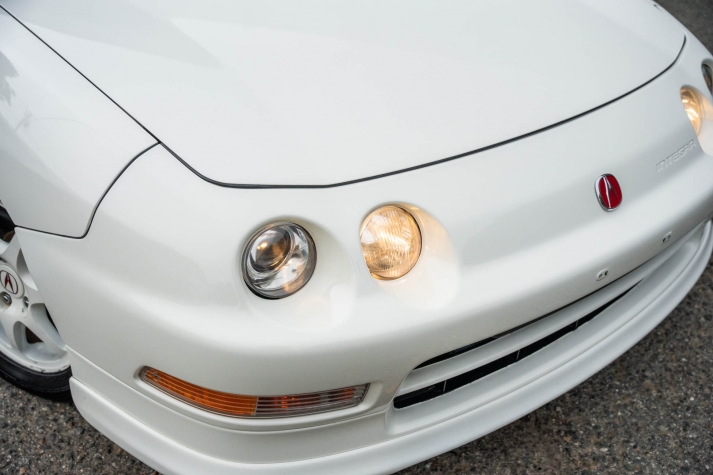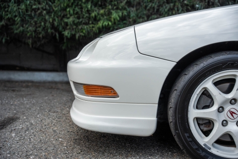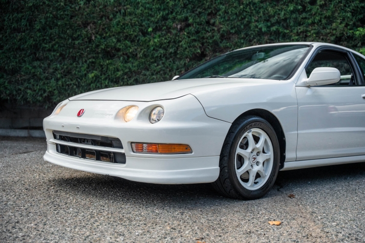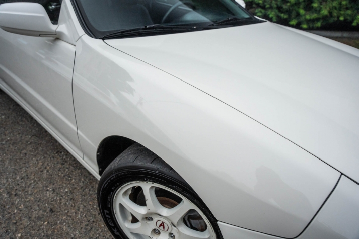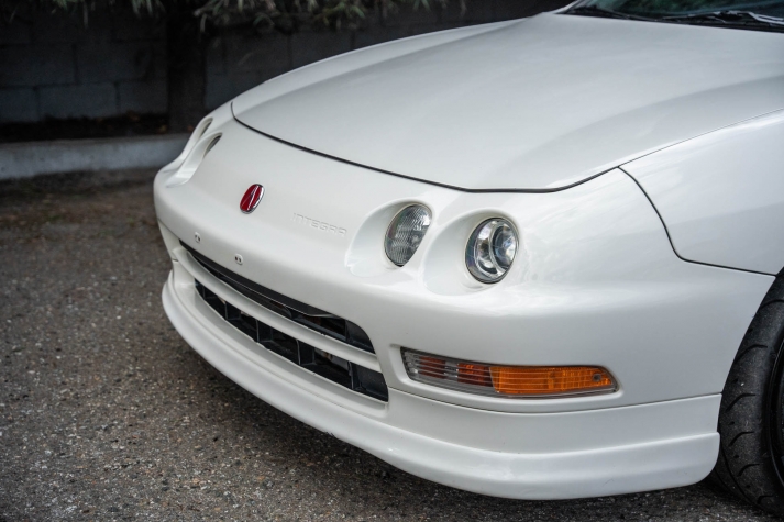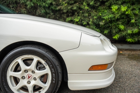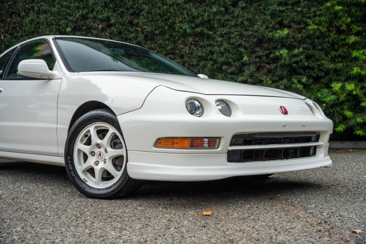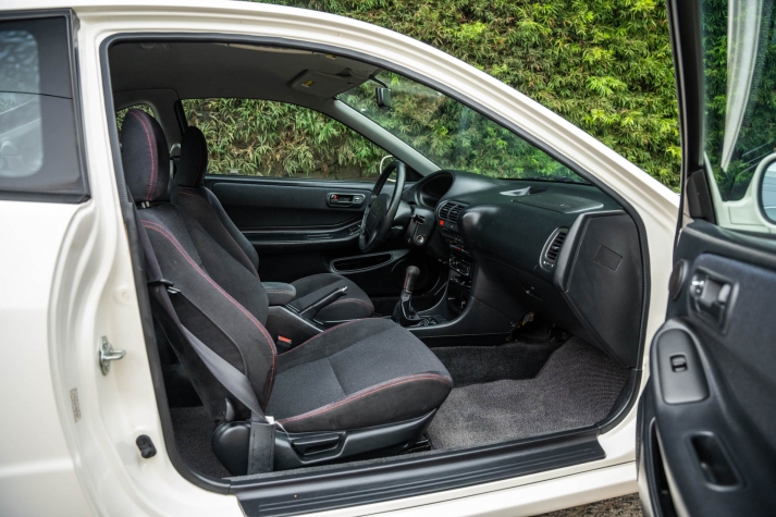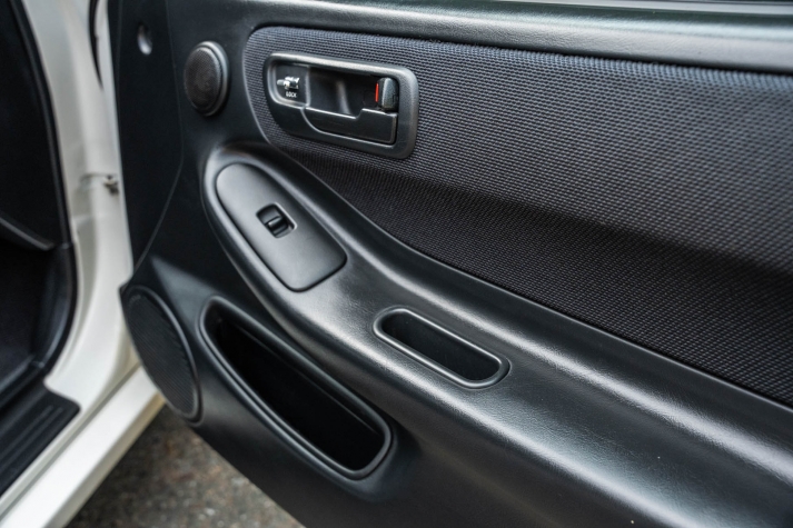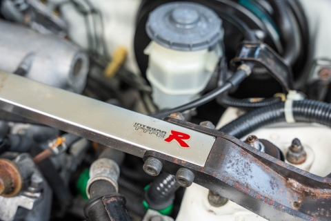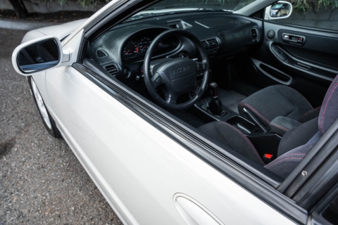 White 15? seven-spoke alloy wheels are fitted with Falken Azenis tires that were mounted in 2024. The Type R received larger-diameter disc brakes at each corner as well as a lower ride height when compared with the standard Integra, and Bilstein dampers are fitted. The seller notes that the suspension was serviced in 2024.