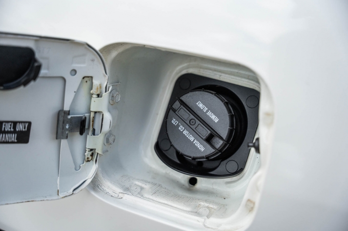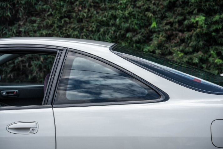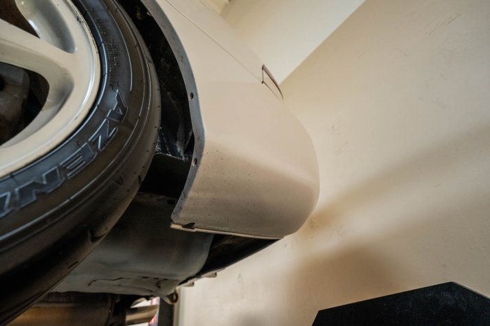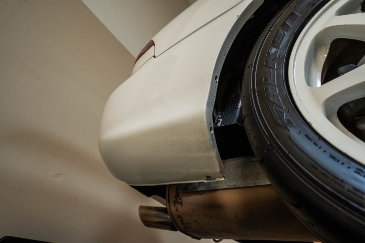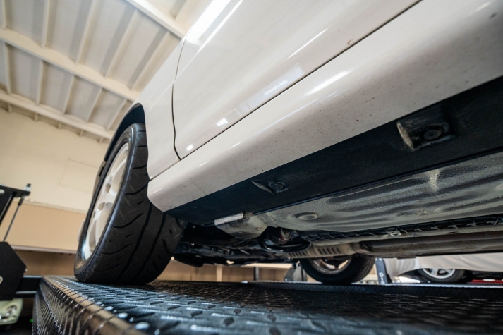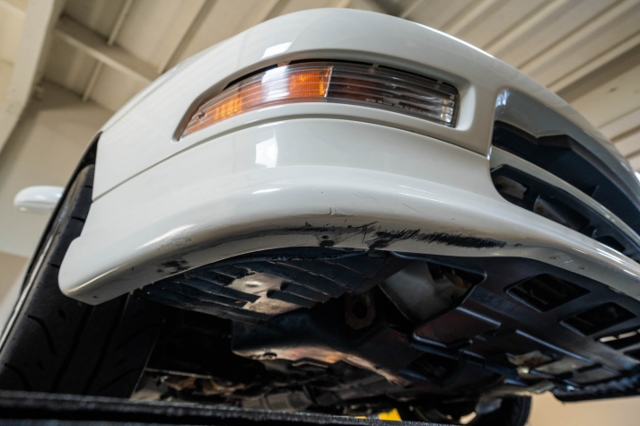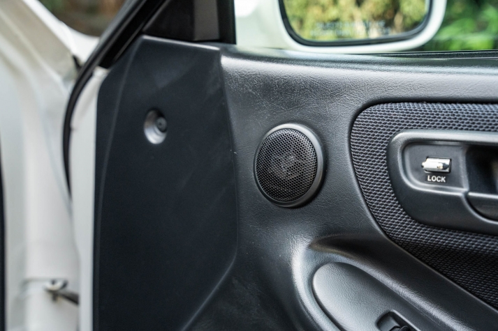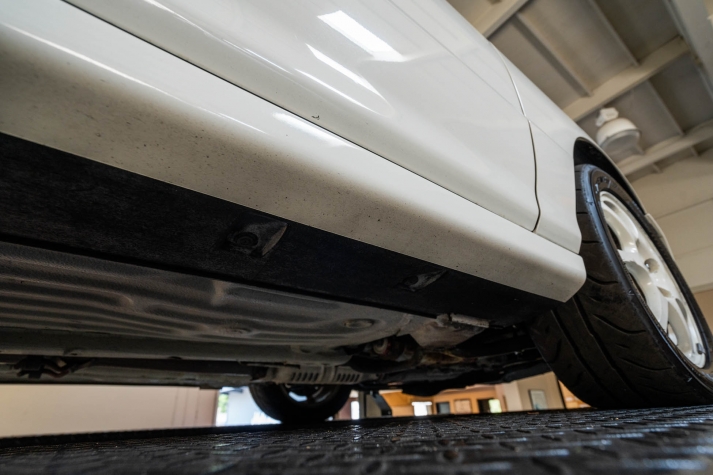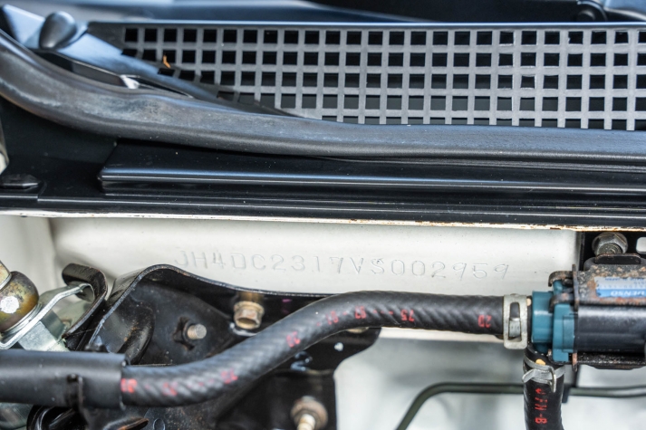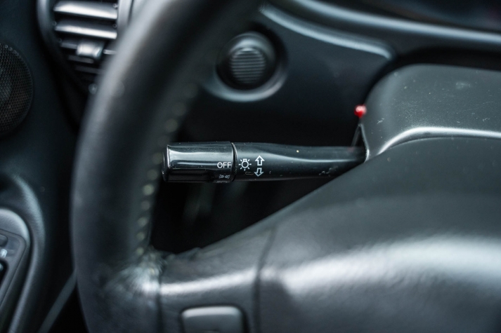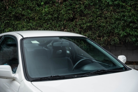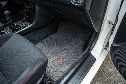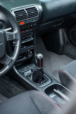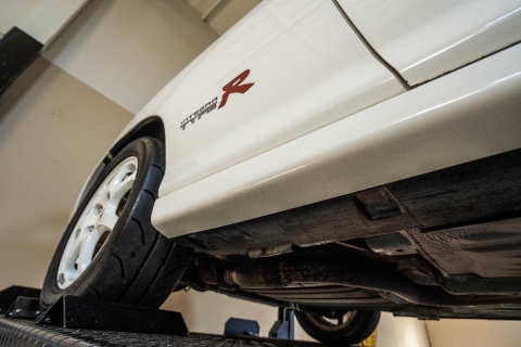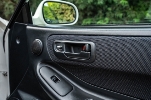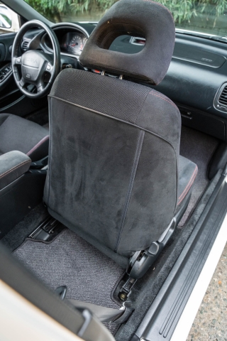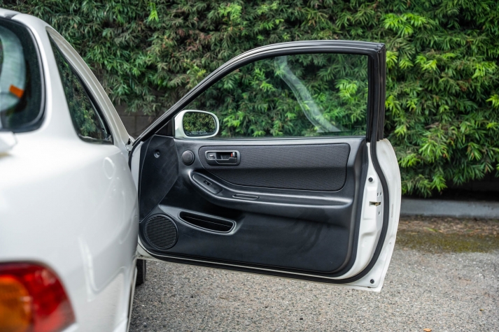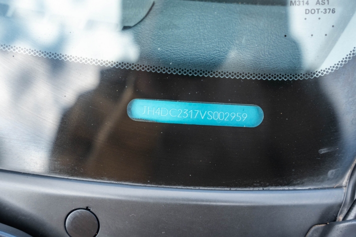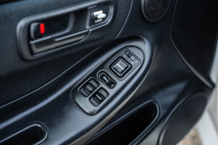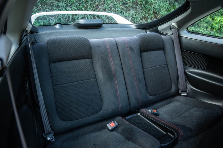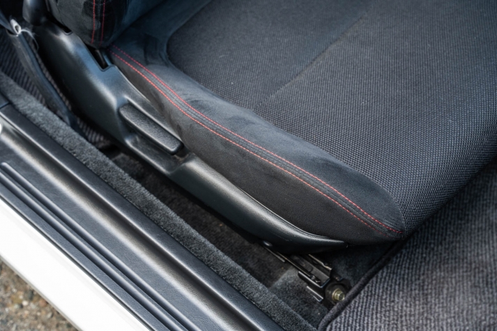 White 15? seven-spoke alloy wheels are fitted with Falken Azenis tires that were mounted in 2024. The Type R received larger-diameter disc brakes at each corner as well as a lower ride height when compared with the standard Integra, and Bilstein dampers are fitted. The seller notes that the suspension was serviced in 2024.